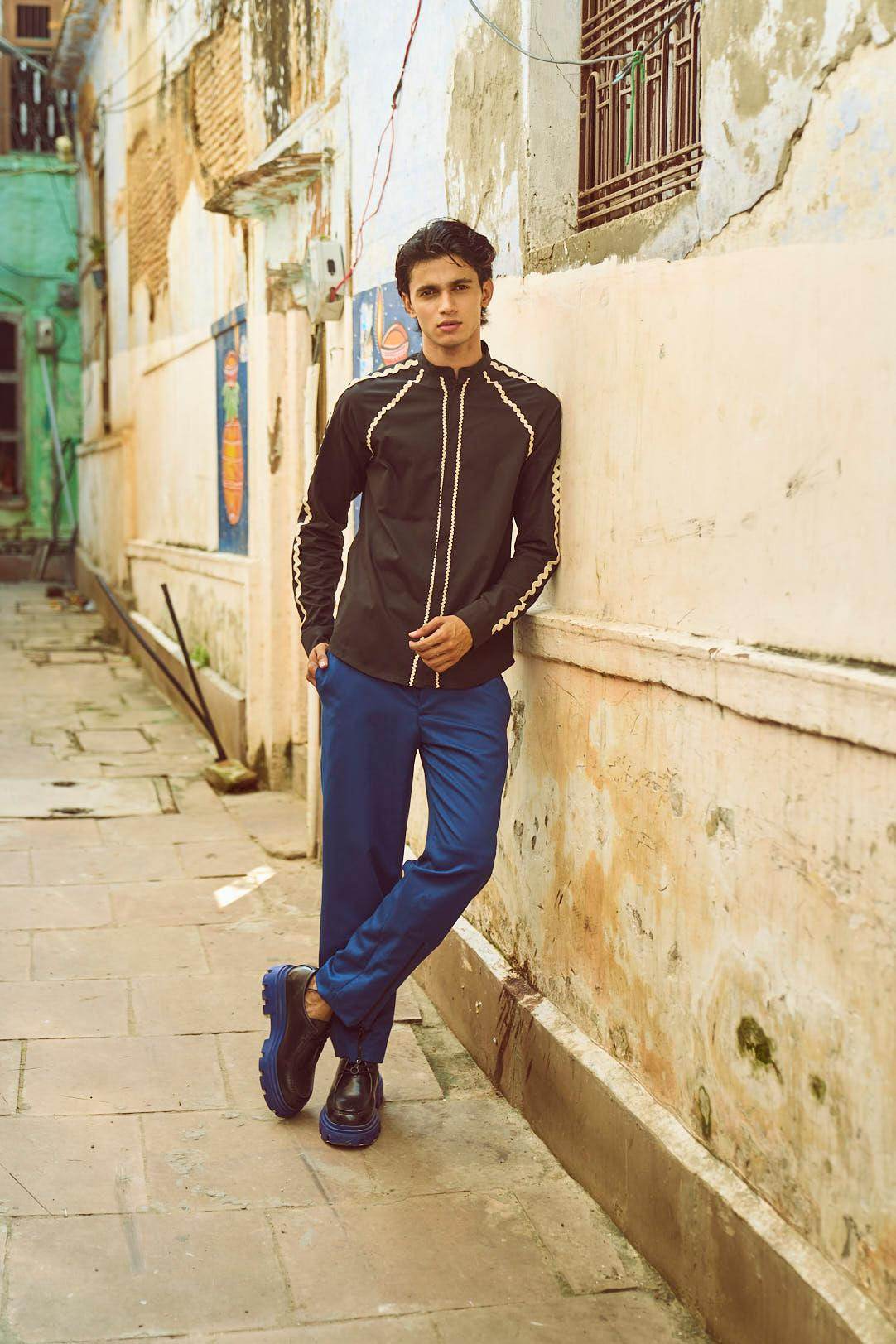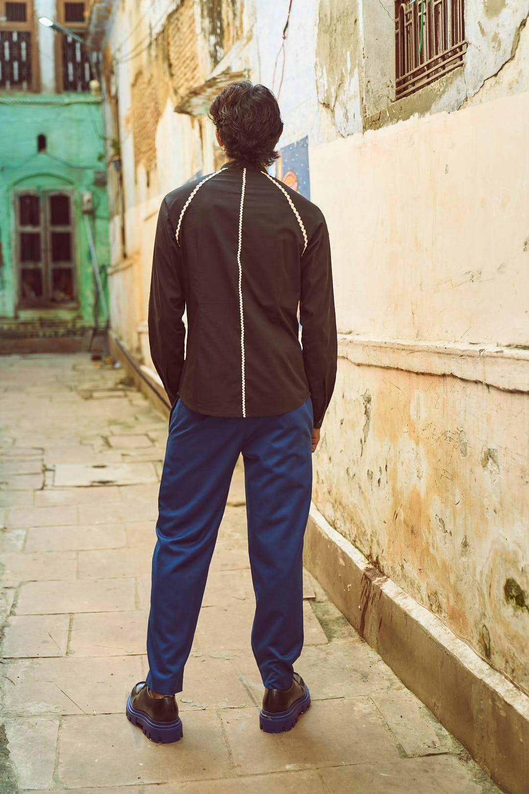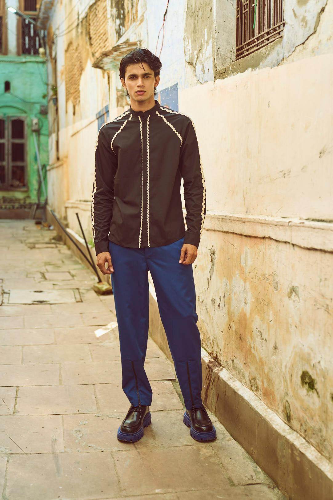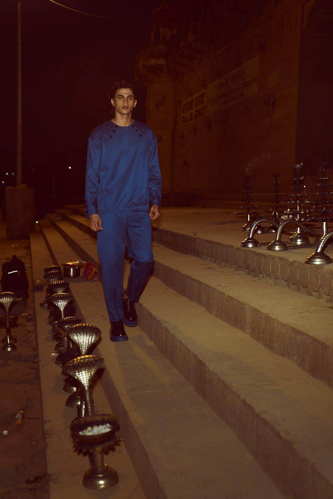 Blue pants in all weather suiting material. Zip at the cuffs. Wear it 2 ways, zipped up for a straight fit, or unzipped for wide-leg. Pockets on the side and back. Hook and zip closure at the front. Belt loops.