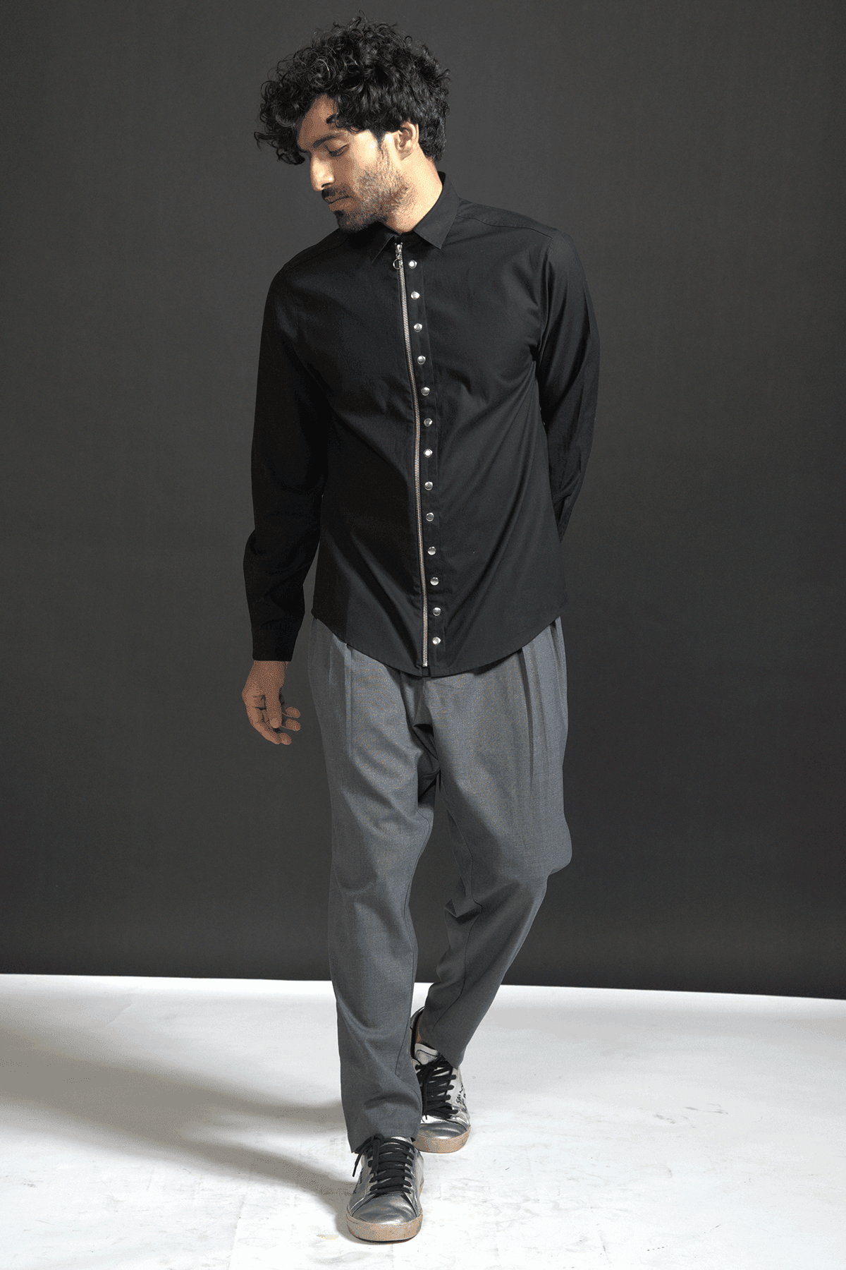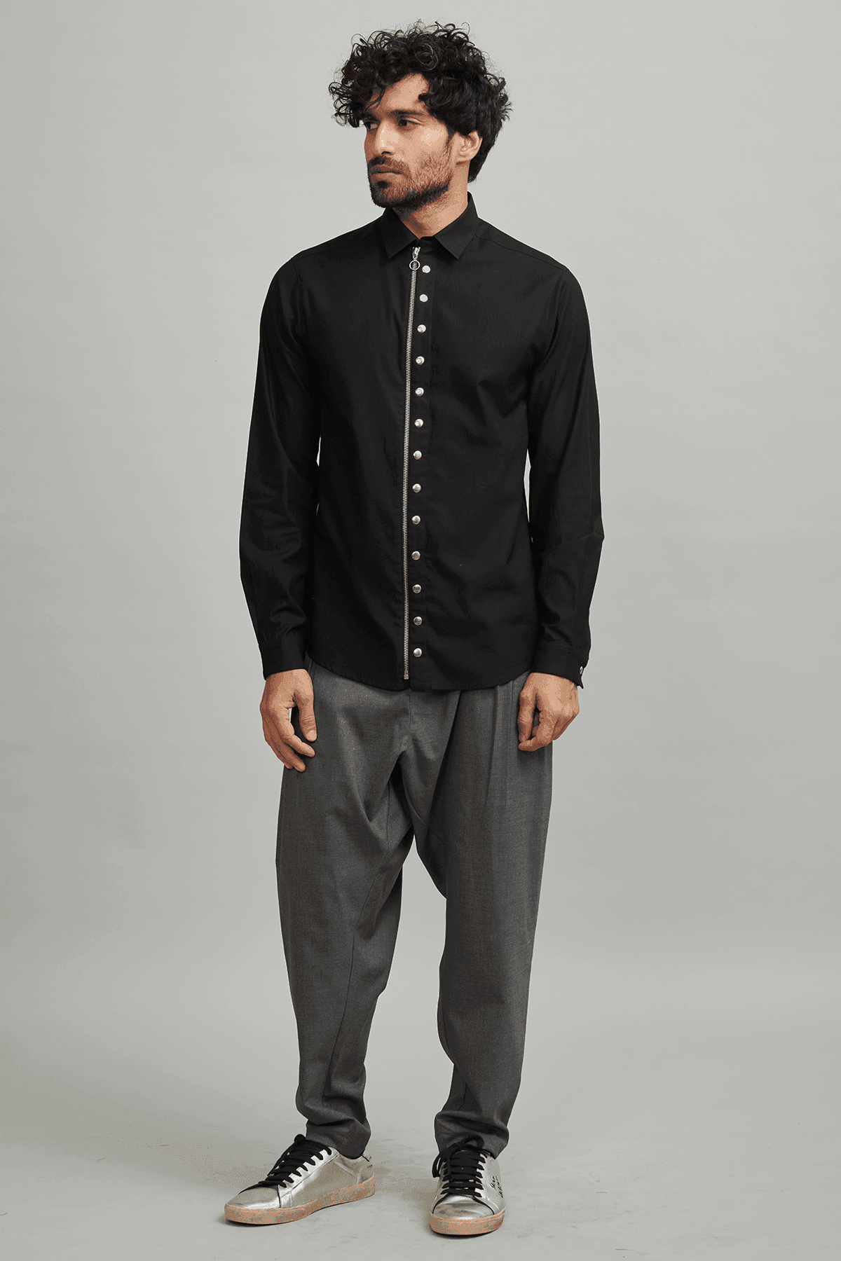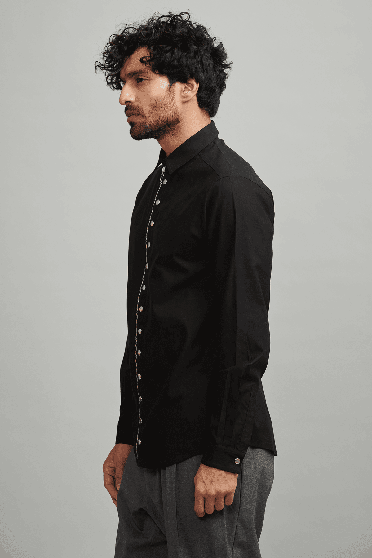 Black poplin full sleeve shirt with silver snap buttons and zipper down the center front.