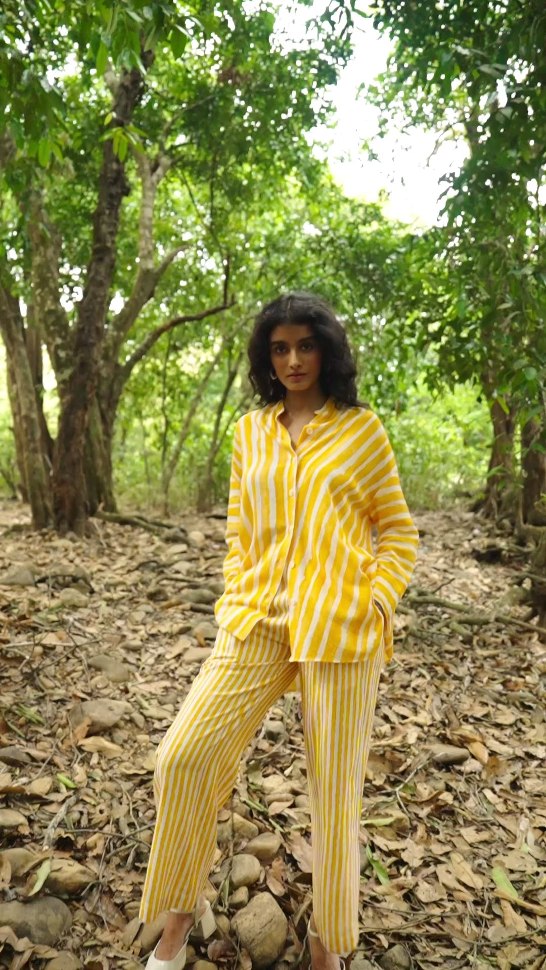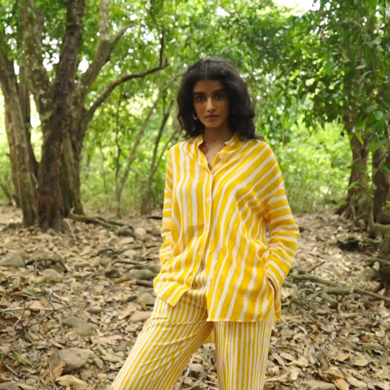 Sunflower yellow brushstroke print shirt in a gauzy summery linen. Asymmetrically placed stripe pattern with one side running slanting and the other in a vertical stripe. Band collar, button down front. Drop shoulder with a full sleeve with cuff. Paired with complementary straight cut pant in a summery linen. Semi-elasticated waist and pockets in the sides.