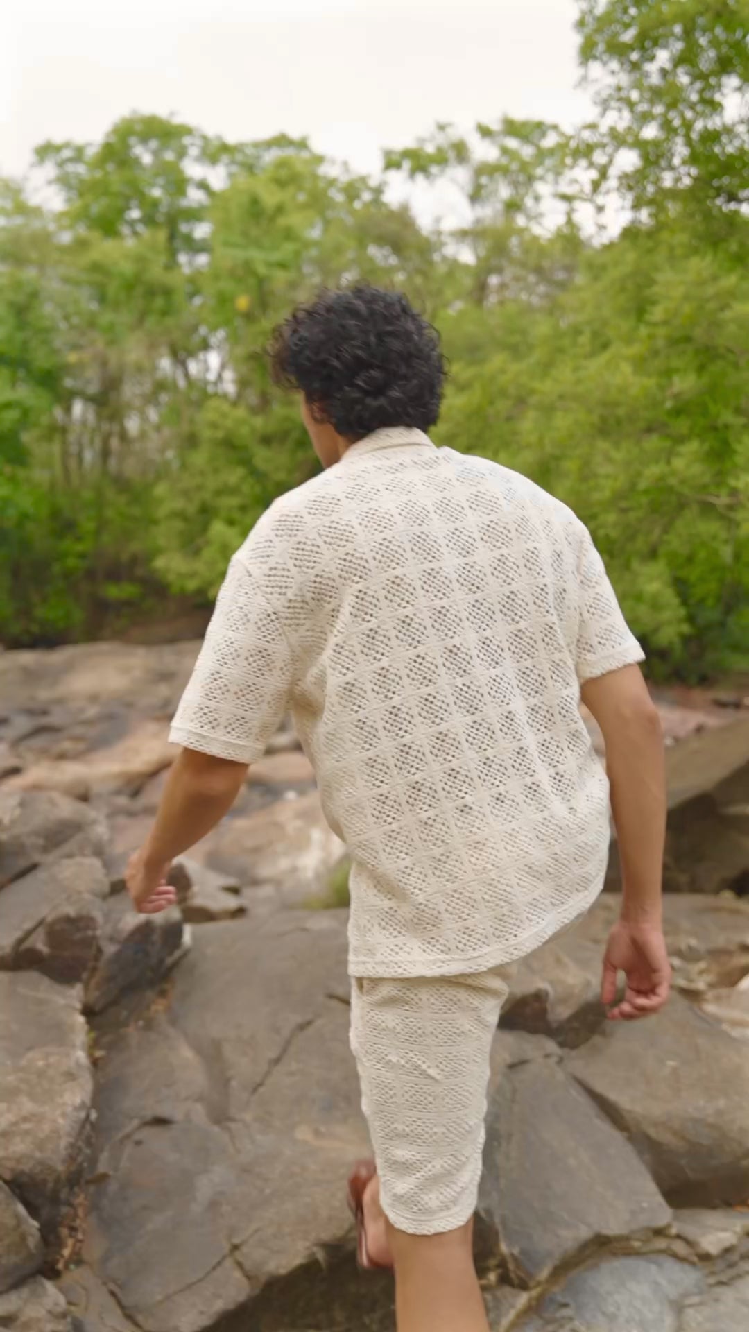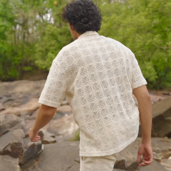 Natural crochet knit shirt in a geometric pattern. Button down front, half sleeves. Paired with matching knit shorts with an elasticated waistband with a drawstring. Includes side pockets and a back patch pocket. Shorts are fully lined.