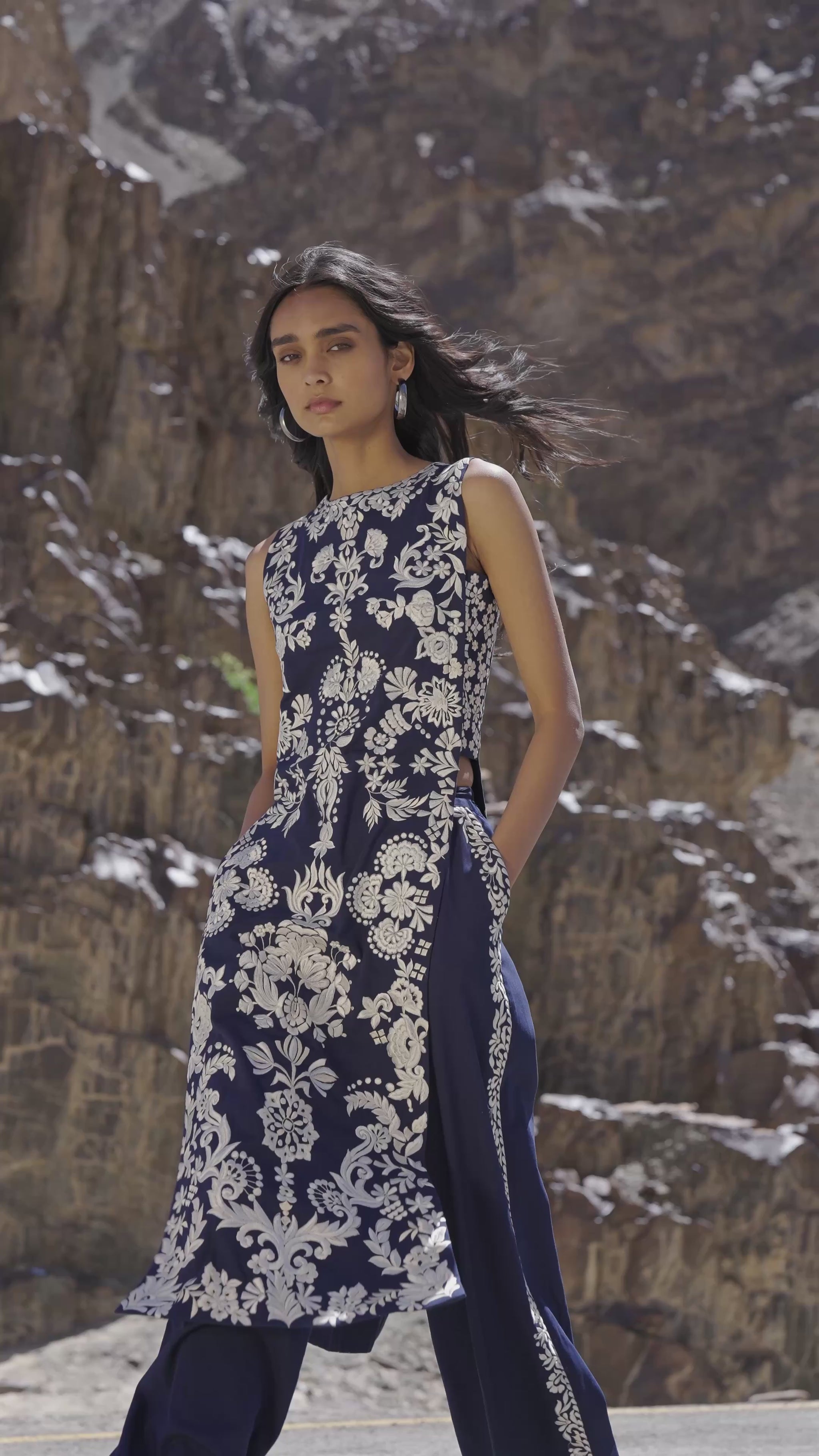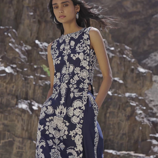 Placement embroidered longline tabard top in navy. Intricate satin stitch embroidery in contrast off-white and ivory on the front and back. Round neck and sleeveless. The top is detailed with side panels and a keyhole back with hook/eye closure. Paired with matching straight-cut navy pant with contrast ivory and off-white satin stitch embroidery along the side seams. Pant has tuxedo style embroidery. Front zipper with hook-eye closure, and semi-elasticated waistband. Pockets in the sides.