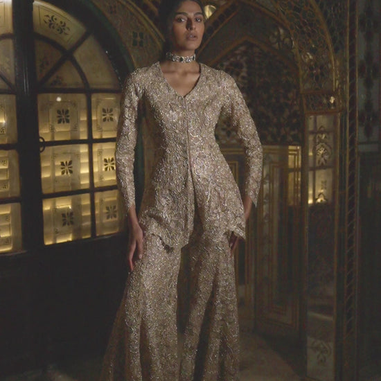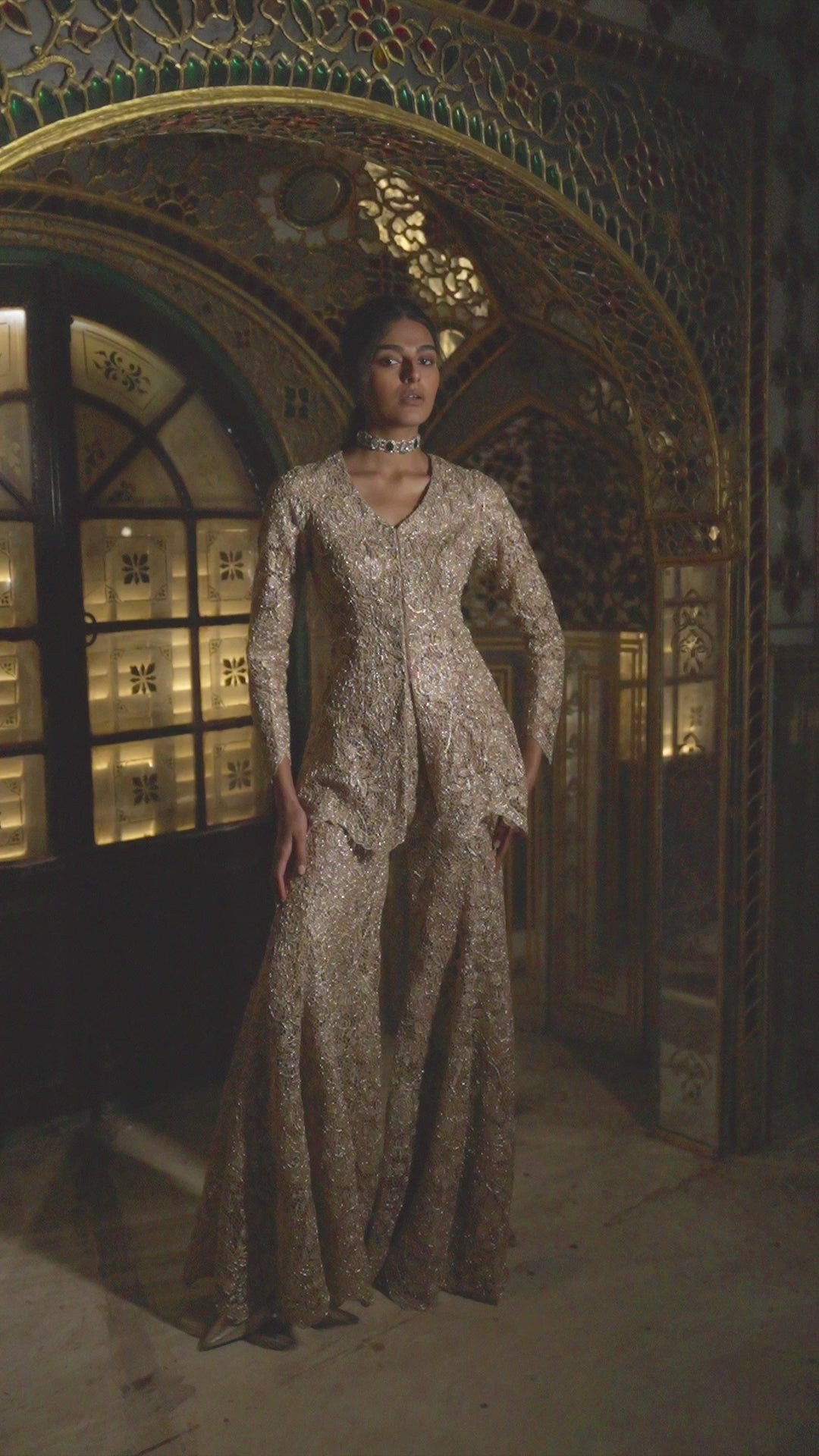 Intricate soft lace with metallic thread embroidery. Peplum V-neck top in a flattering shape. Fully lined design with front hook and eye closure.