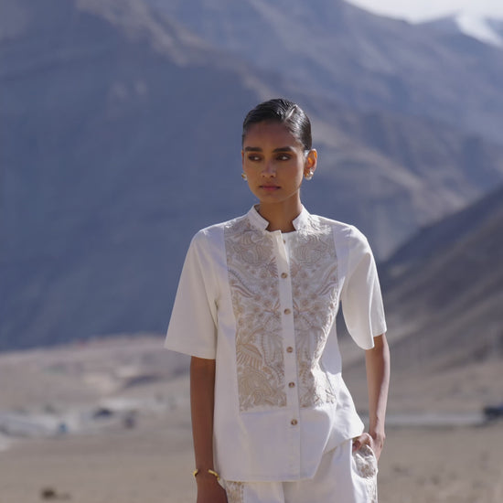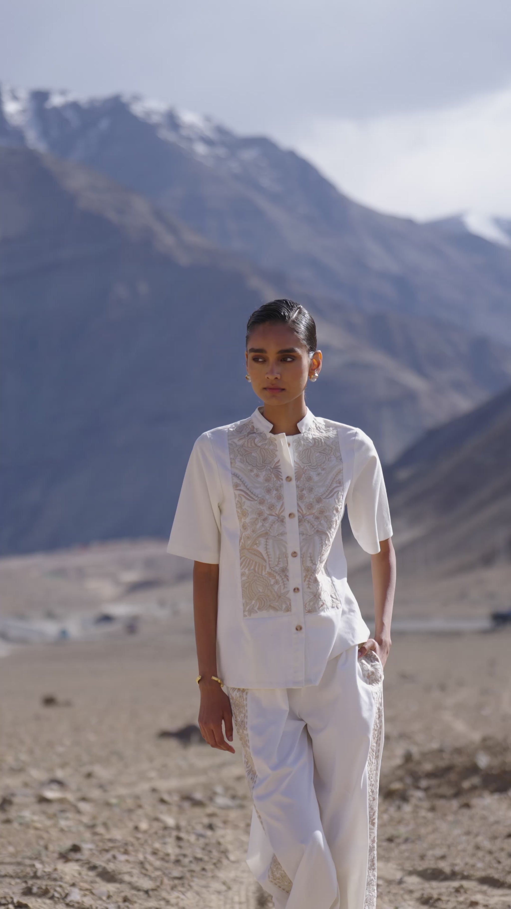 Ivory half sleeve shirt with Gara stitch inspired embroidery detaling at the front yoke. Band collar with contrast front button-down closure. Regular fit. Paired with matching ivory culottes with Gara stitch inspired embroidery detaling down the sides. Elasticated at the waist. Pockets in the sides. Made in all weather suiting material.