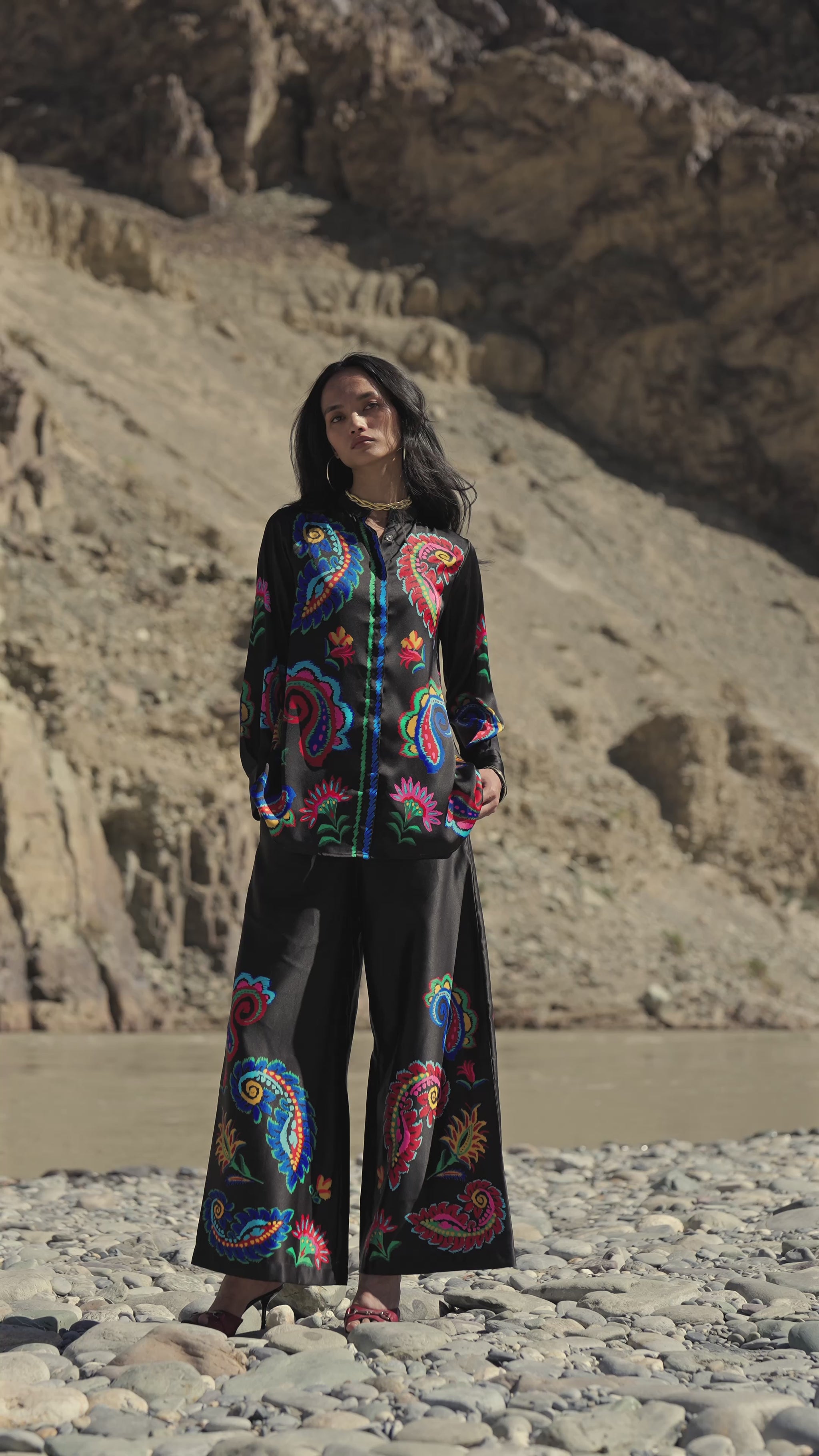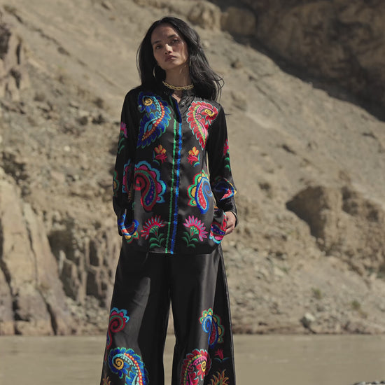 Graphic multicolour paisley and floral print shirt in black base with contrast borders. Relaxed fit with band collar, concealed front placket, and contrast button detailing on the cuffs. Paired with matching straight fit pant Wide-leg design with a sewn-down pleat in the front for added structure and movement. Semi-elasticated waistband for comfort, with a side pocket and side zip closure.