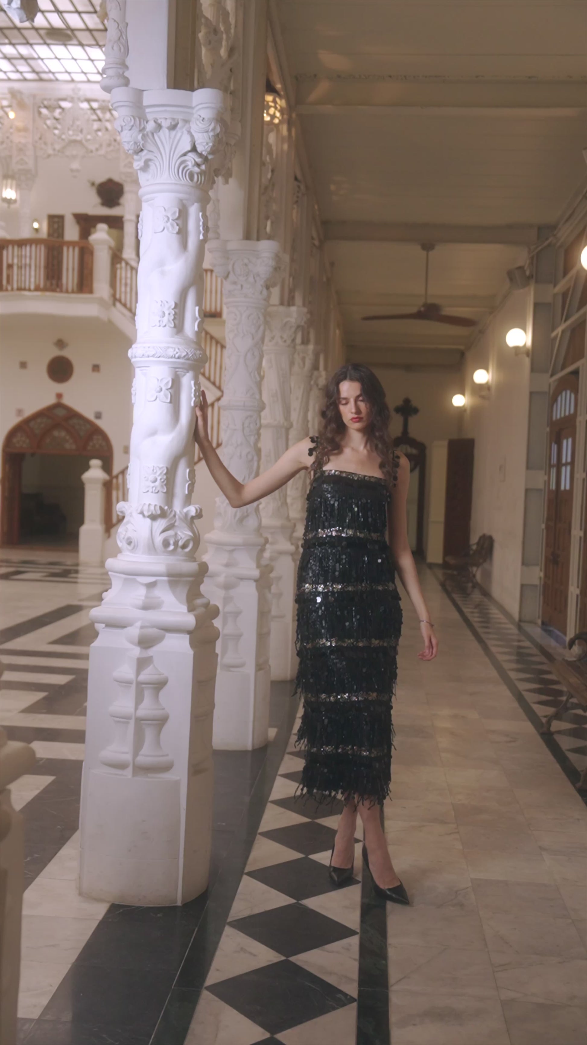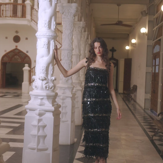 Black sequinned fringe dress with metallic gold accents and scalloped straps. Vertical panels of matte-black paillettes run through the front and back, with embroidered gold lace trims cascading between them to create soft breaks of light. Tiered linear embroidery builds into a fringe texture that moves fluidly with the body. Gold floral sequin detailing on the straps and neckline. Slits at the sides. Fully lined. Made for after-hours moments with a touch of sparkle.