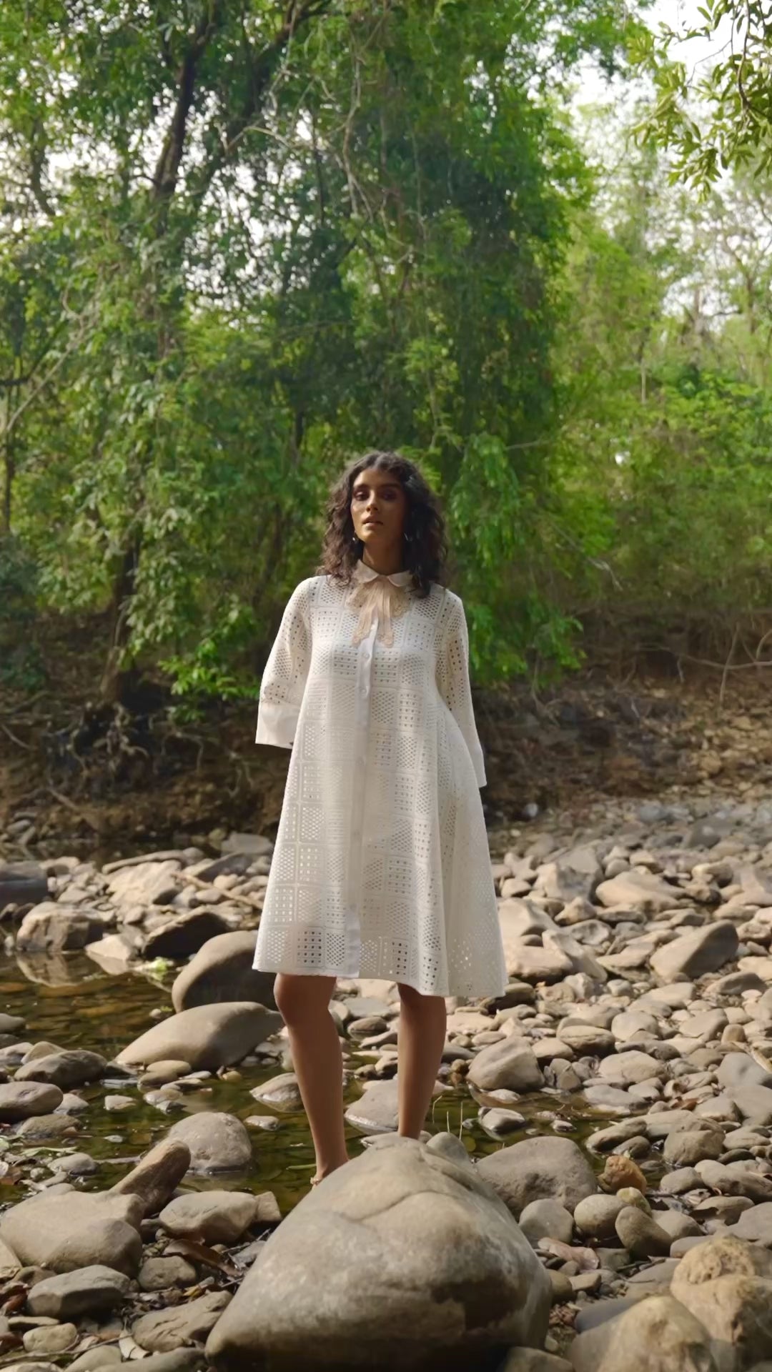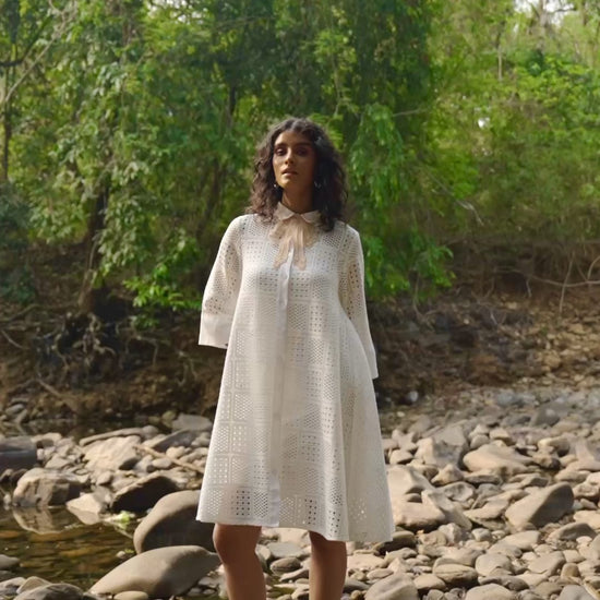 White relaxed fit A-line lace dress. Crochet knitted fabric dress with elbow-length sleeves. Comes with a detachable beige lace bow on collar. Front button down placket with transparent buttons. Comes with a slip.