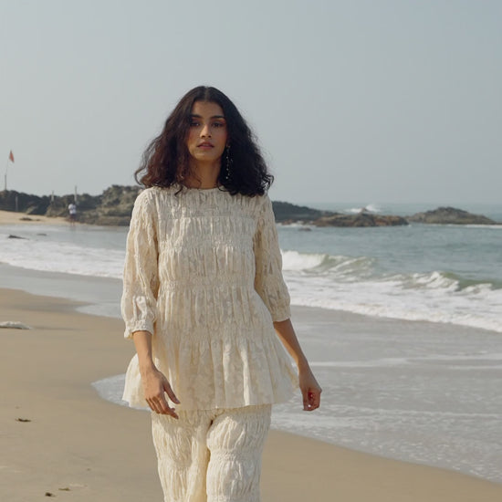 Variegated smocking on soft cotton lace. Off white lace pant with graded lines of smocking. Relaxed fit and a delicate flare towards the hem. Raw hem, zip closure on the side. Fully lined with pockets in the sides.