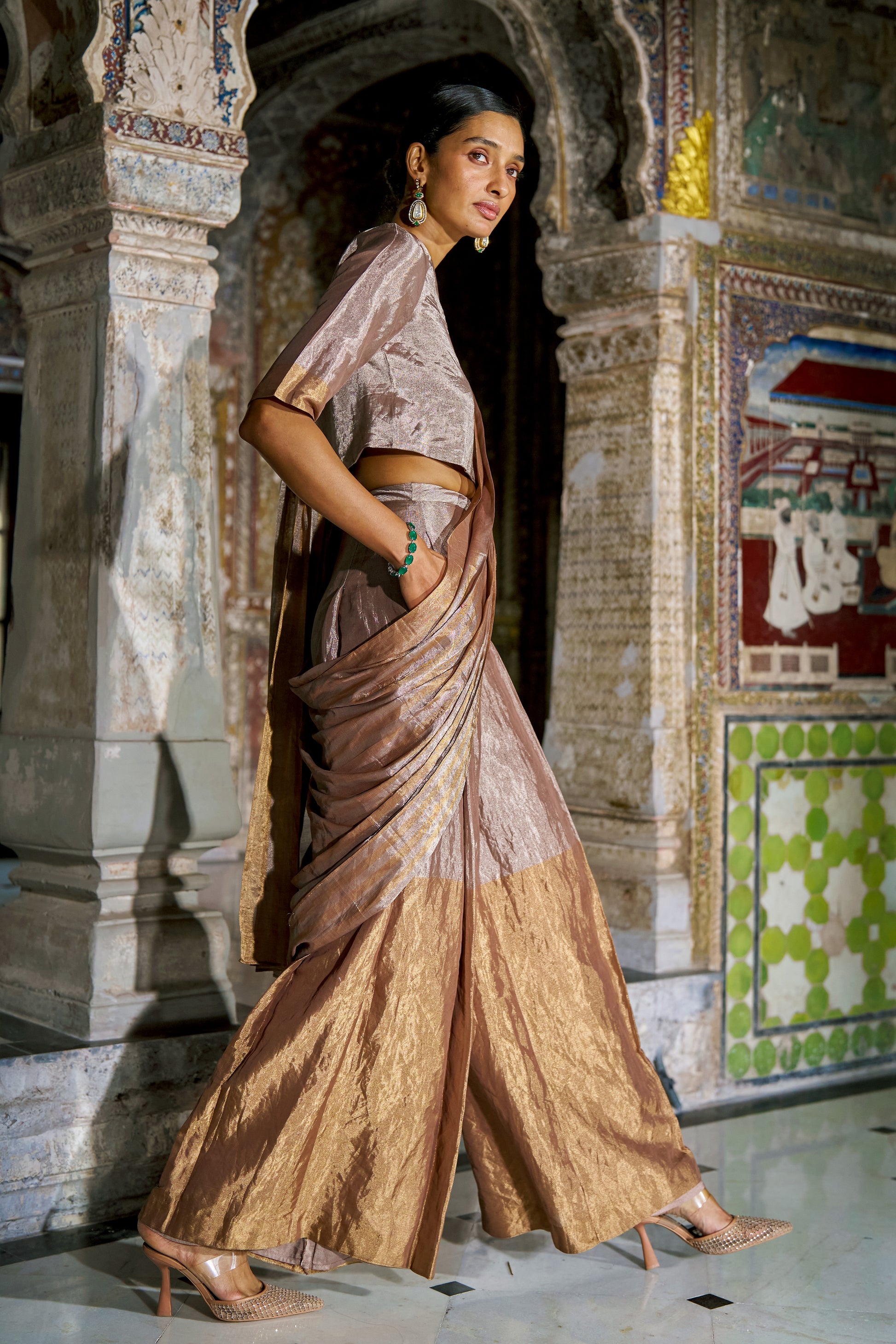 Benares crushed tissue pant in champagne with gold accents. Hand-sewn inverted pleats in the front. Wide-leg silhouette with contrast weave placed below the knee for added texture. Comes with a detachable cascading drape panel, hand-pleated and finished with a woven gold border at the edges, inspired by sari drape. Concealed side zip with hook/eye closure. Pockets in the sides.