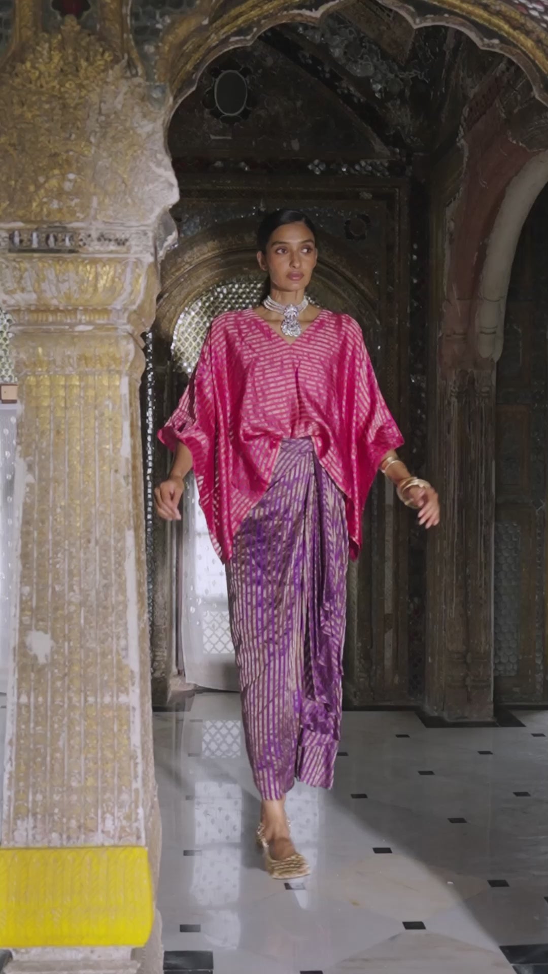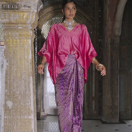 Benares tissue drape skirt in mulberry with antique gold stripes. Hand-pleated falls and a layered ruffle drape for added movement. Concealed side zip with hook/eye closure. Garment is fully lined.