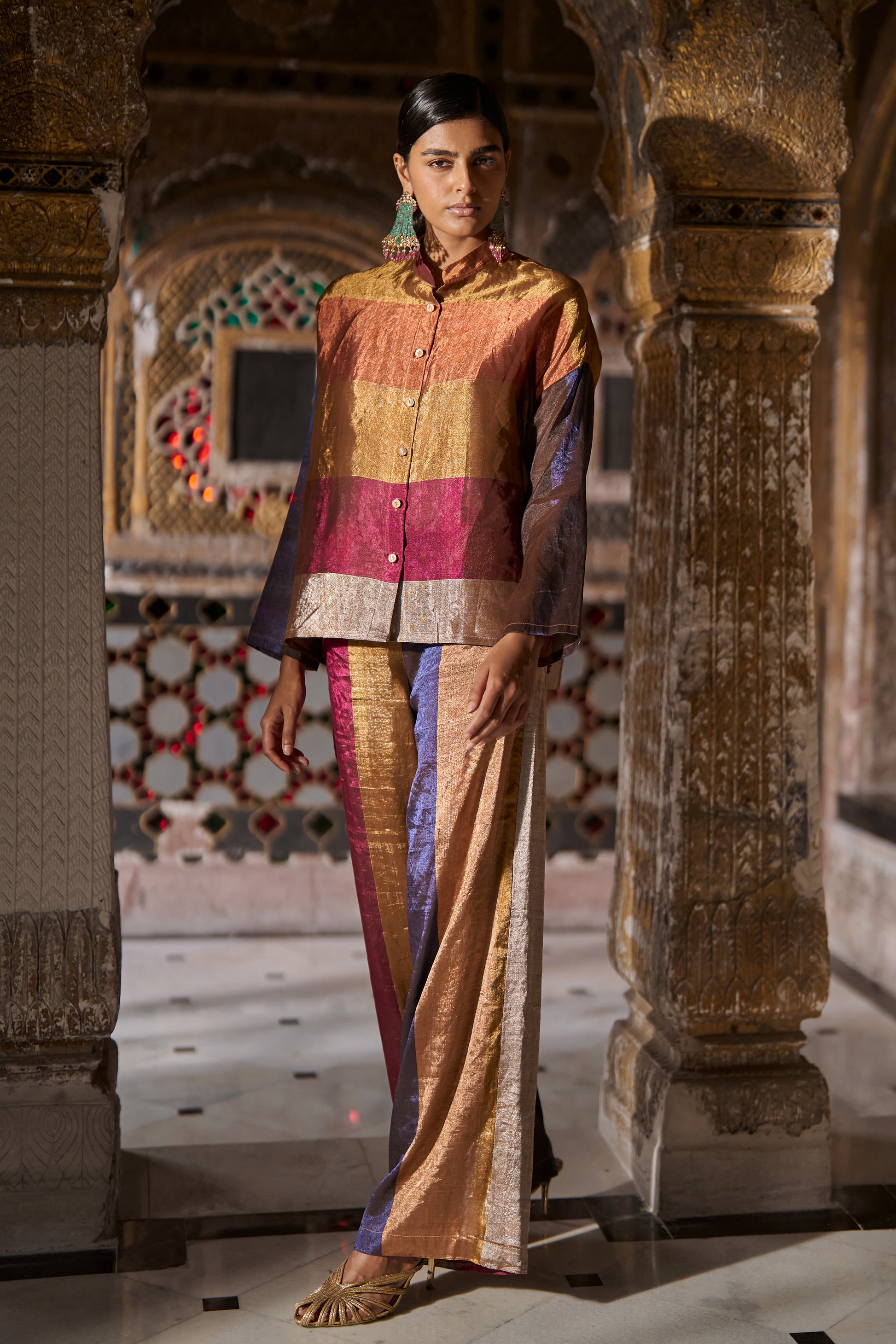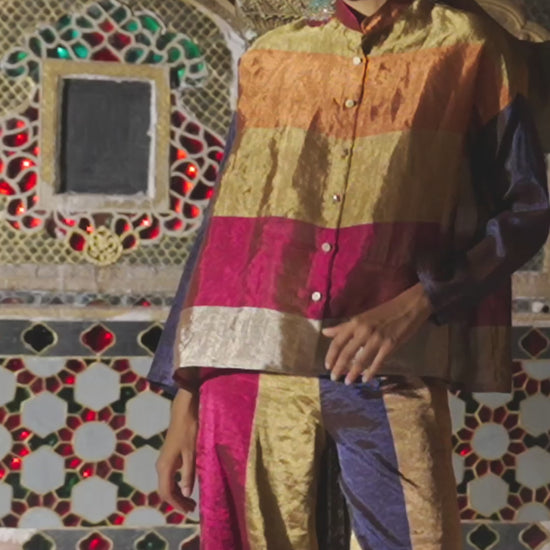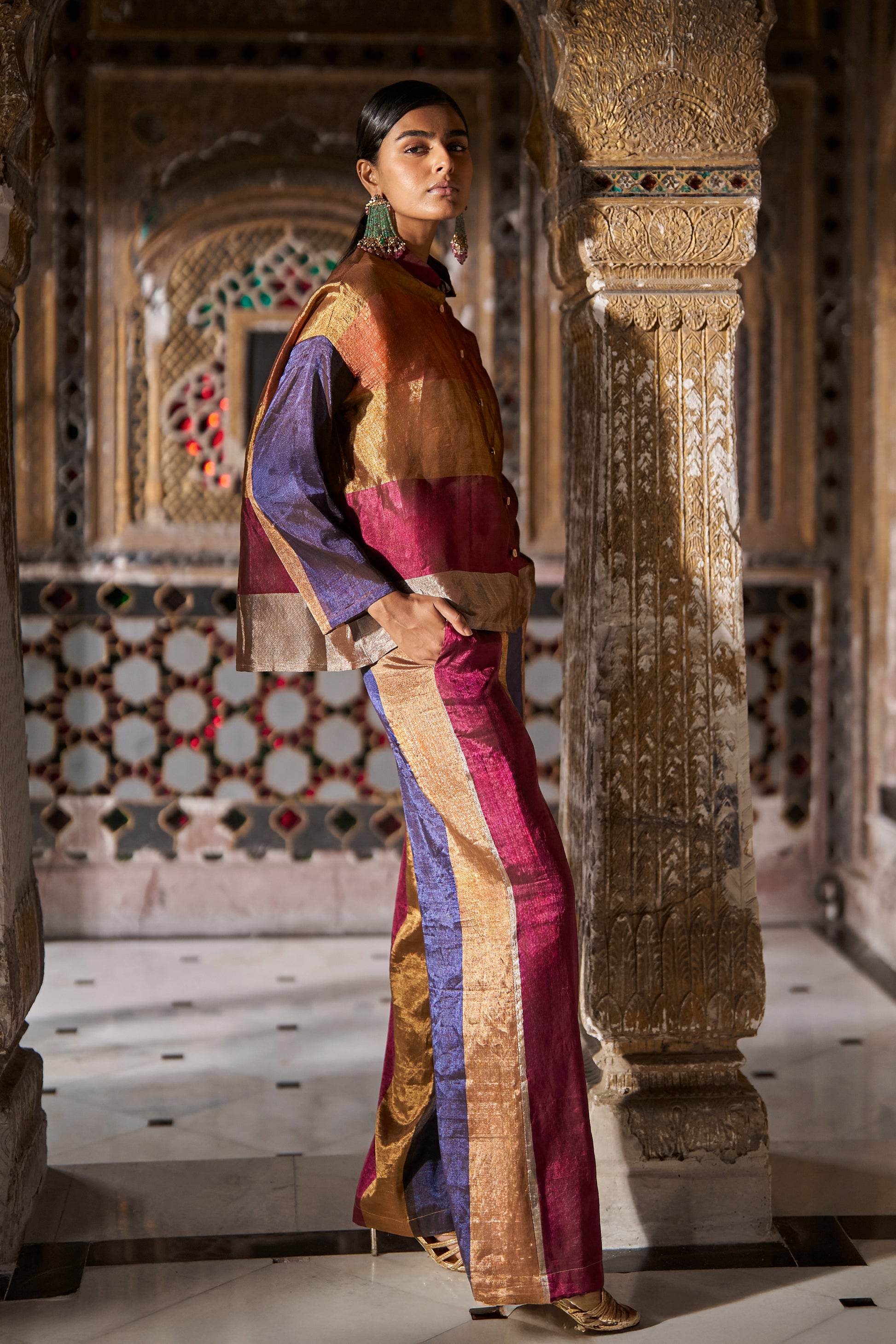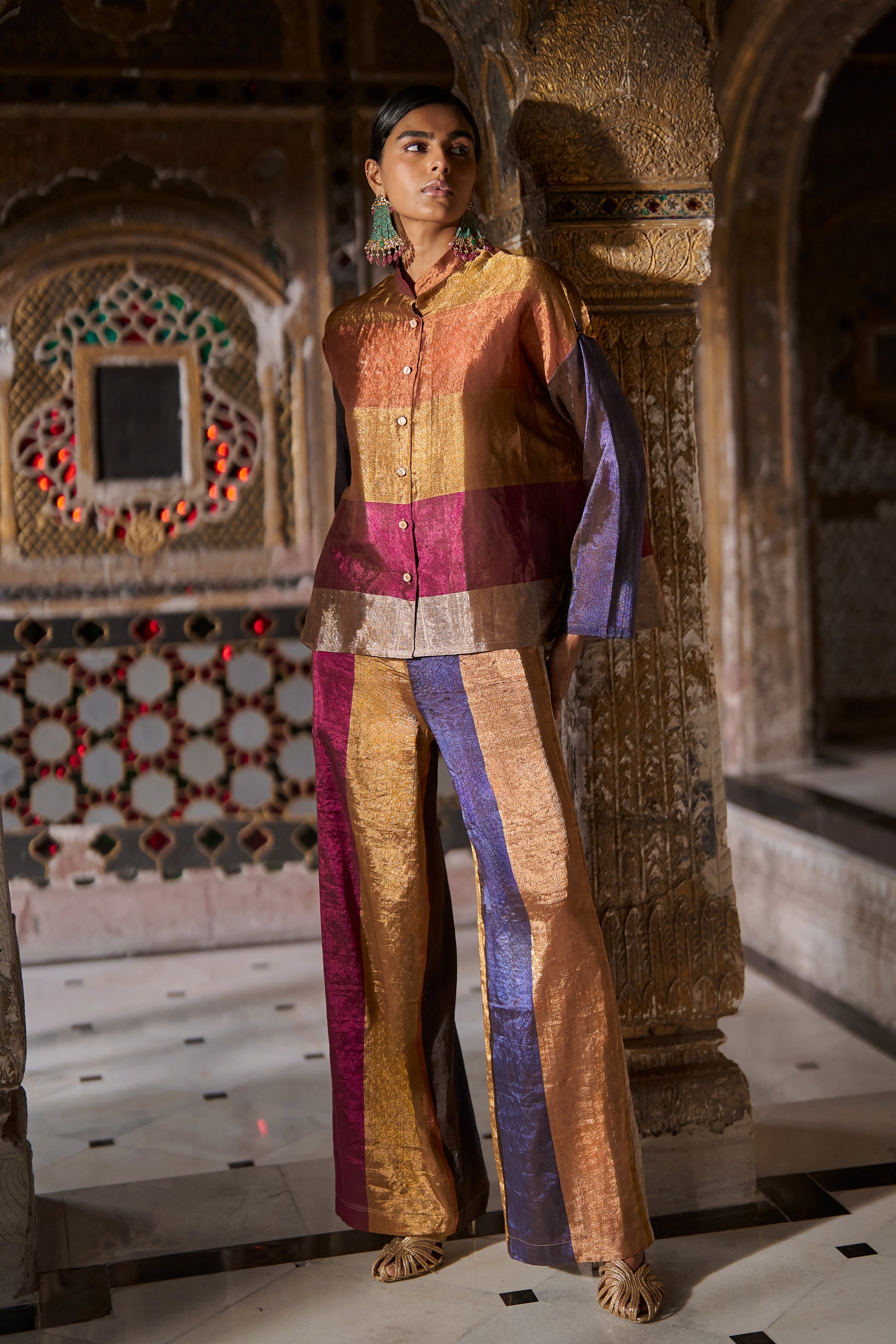 Straight leg pant in Benares tissue with vertical metallic stripes in gold, beige, fuchsia and jewel violet. Semi-elasticated waistband with concealed zip and hook/eye closure. Pockets in the sides. Handwoven. Each piece is unique.