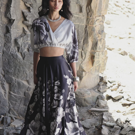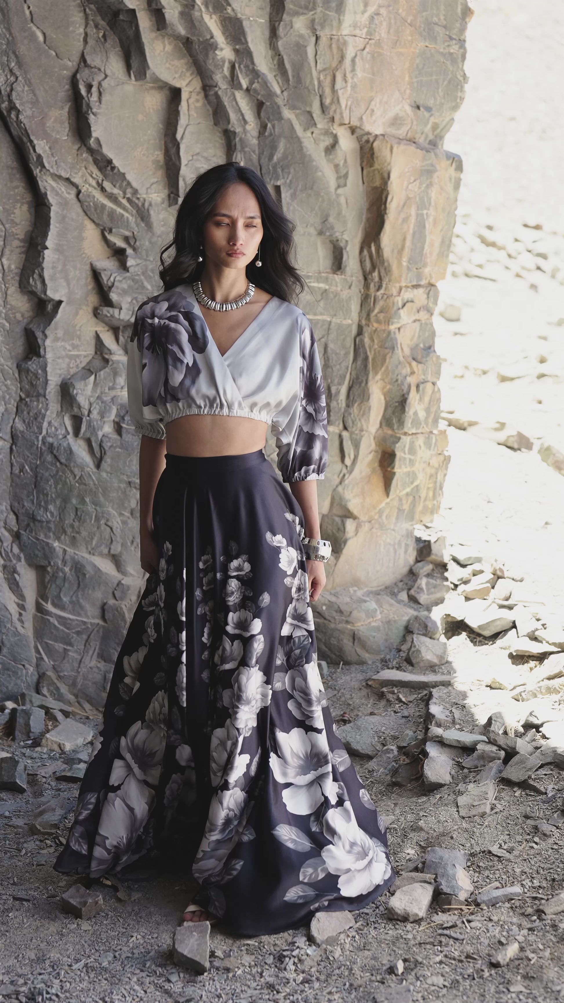 Maxi skirt in flowy satin with dramatic grey-scale floral print. Placement print on a black base with a dégradé effect from the hem. Zip closure on the side.