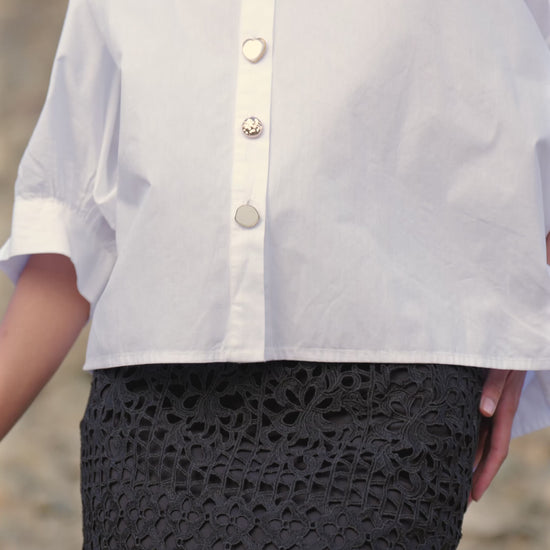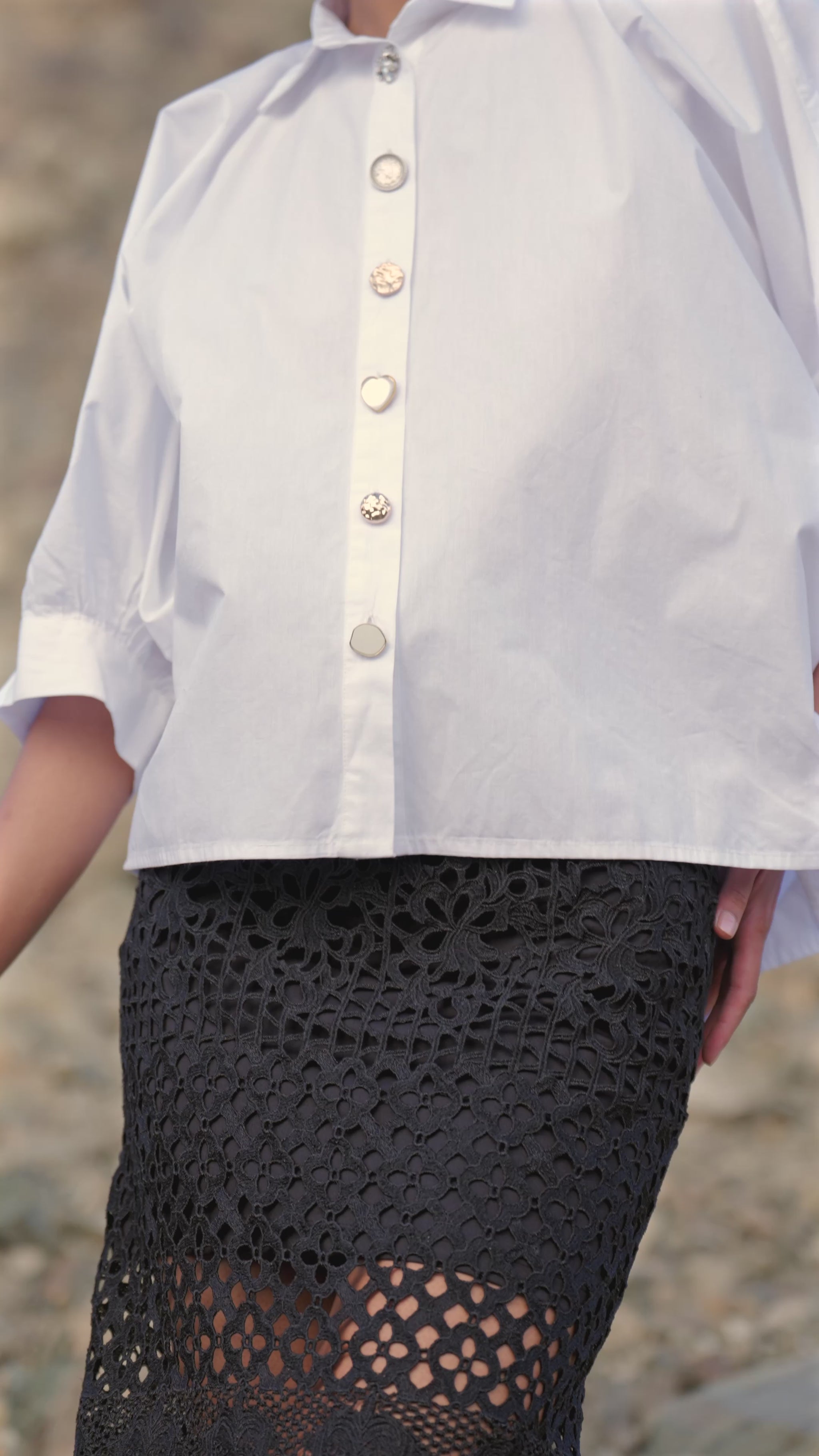 Midi-length skirt in metallic black lace with cutwork embroidery. Straight-cut silhouette with a scalloped hem. Elasticated rib at the waist with a statement zipper at the back. Skirt is semi-lined till the knee.