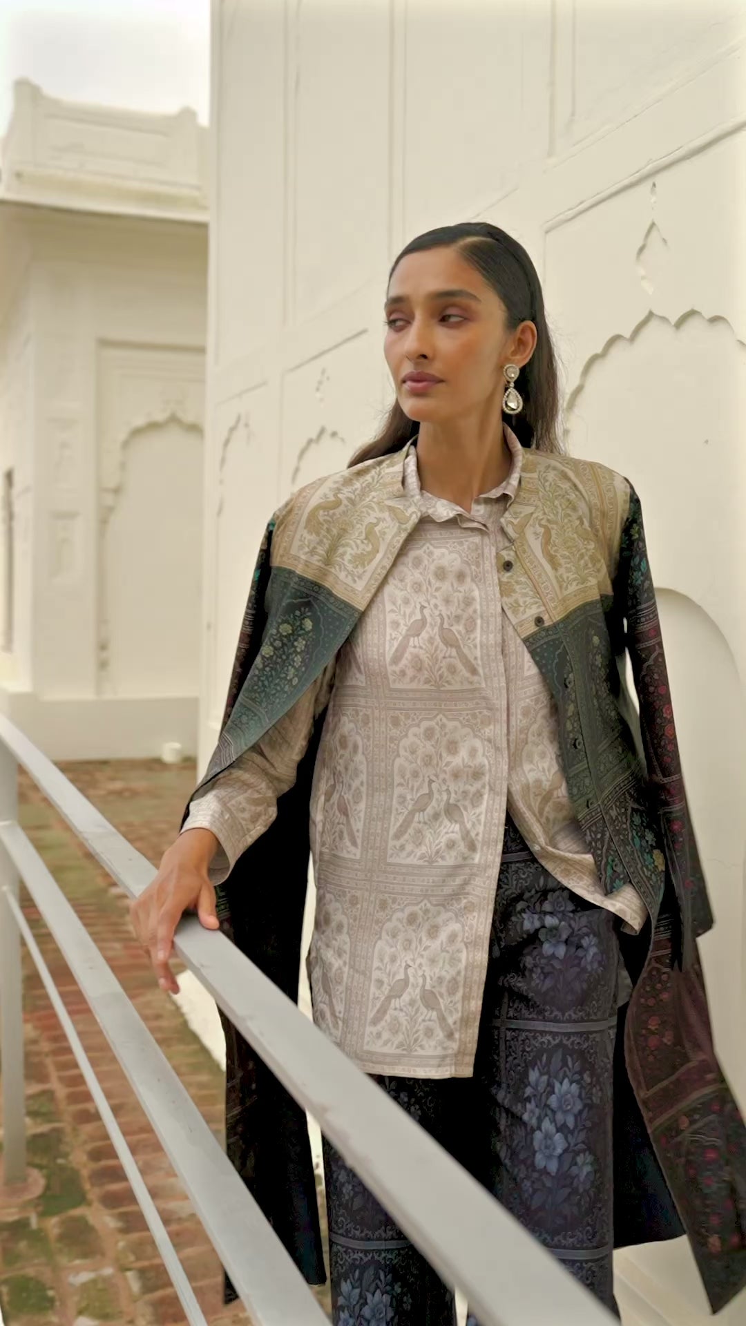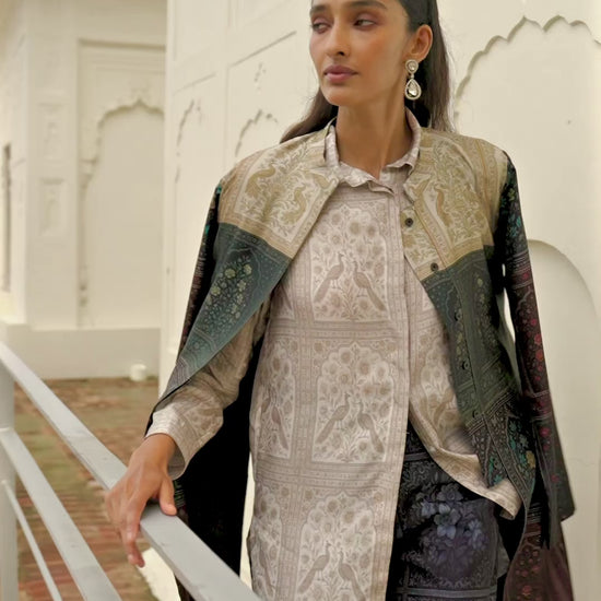 Mughal print pant in tonal greys and blacks. Hook/eye and zip closure. Relaxed fit. Pockets in the sides.