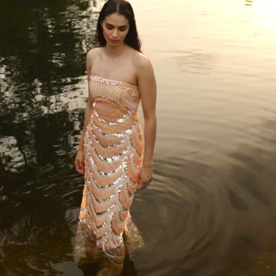 Straight fit gown adorned with delicate sequin and pearl. Placed design with a cascading embroidery. Side slit for effortless movement. Side zipper, hook-and-eye closure. Comes with adjustable detachable straps.