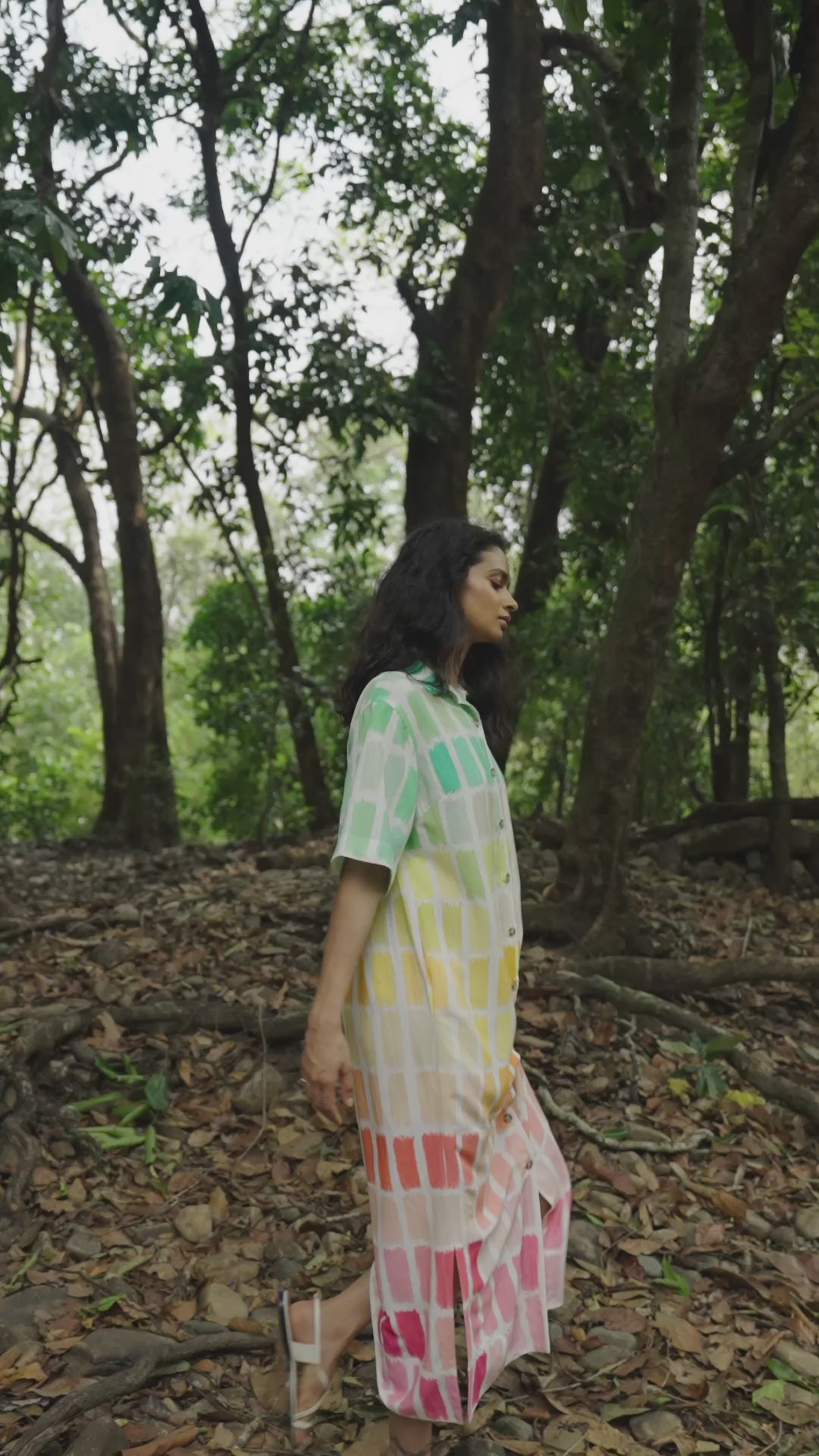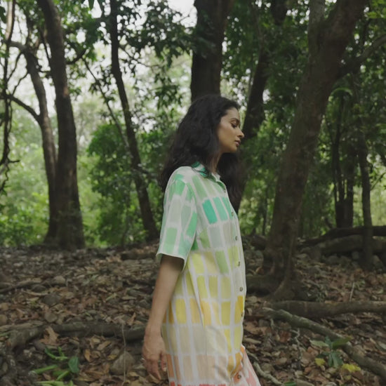 Multicoloured hand painted print on a midi-length shirt dress with front button-down placket and side slits. Box pleat detailing at the back and relaxed fit half sleeves. Pockets on the sides.