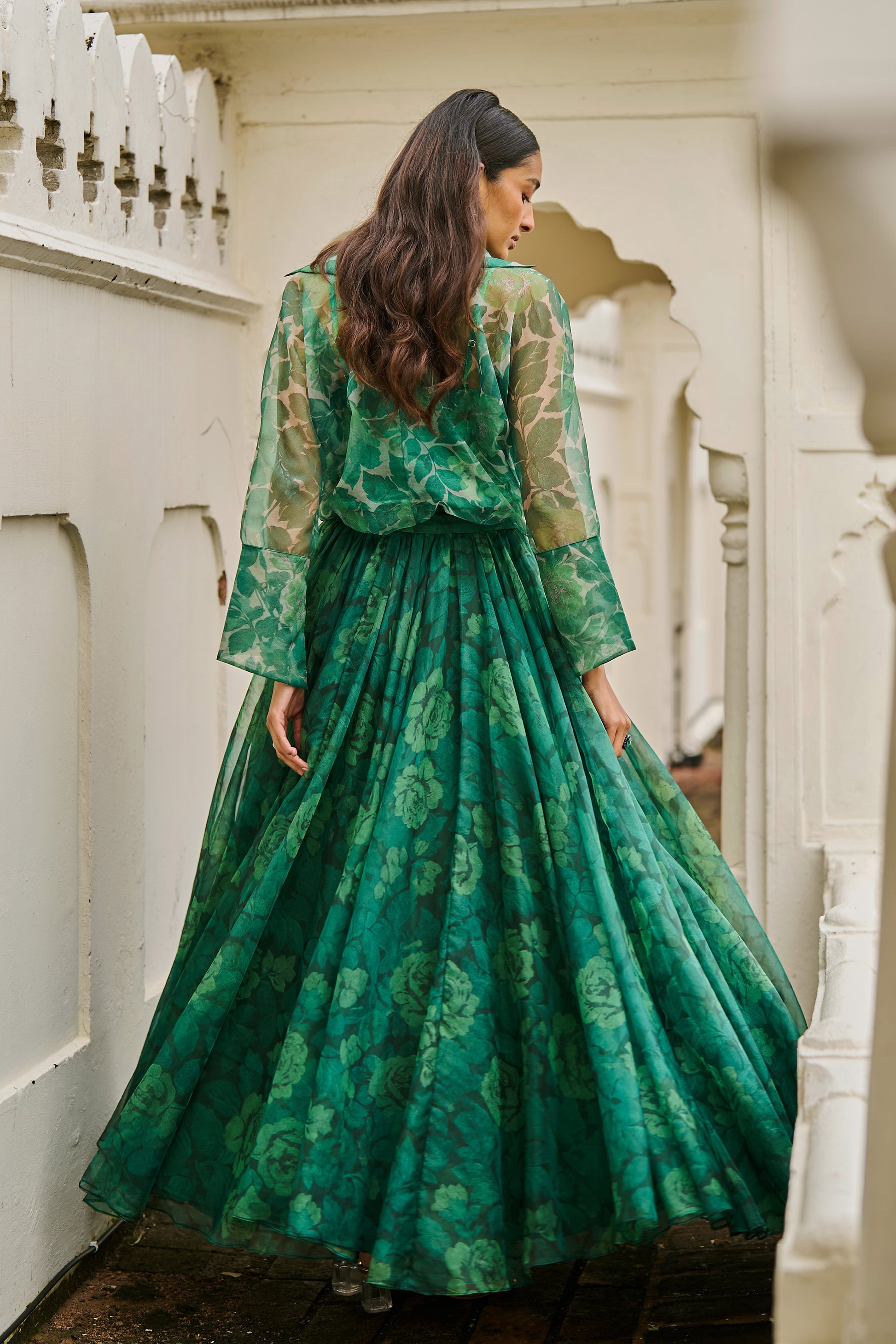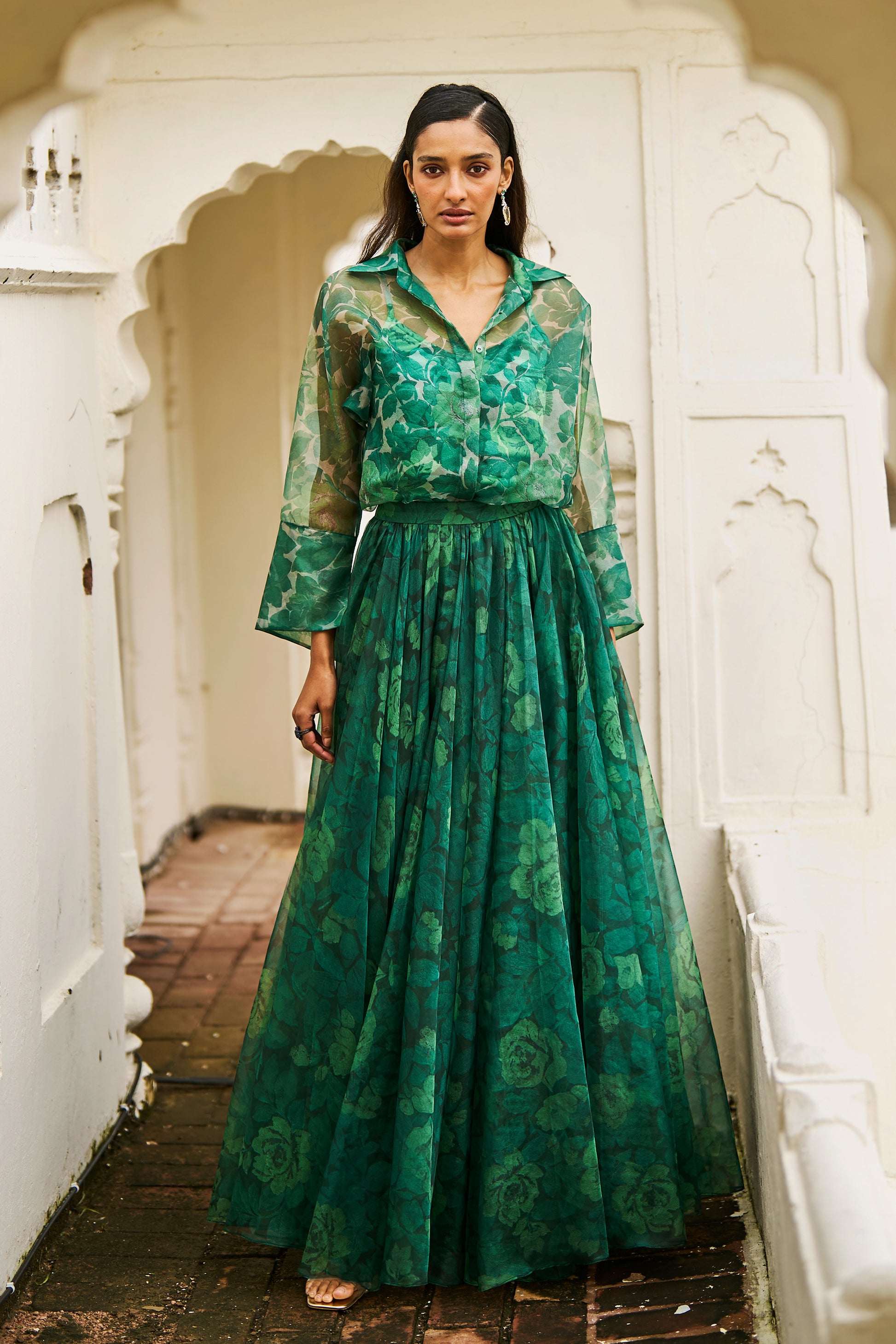 Tonal green rose print maxi skirt in soft, flowing organza. Layered in darker shades of emerald, fern, and moss to create depth within the print. A-line silhouette with generous movement and soft ruching at the waist that flares towards the hem. Structured waistband with internal drawstring, side zip, and hook/eye closure. Fully lined, with fusing at the bottom hem to support drape and maintain sculptural flow.