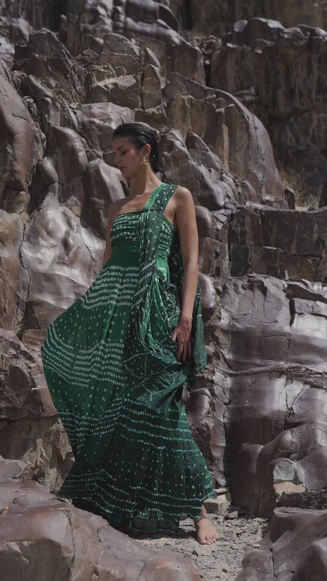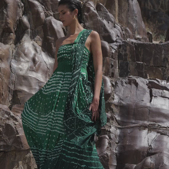 Bandhani draped sari gown in rich green ombré. Hand pleated top with an A-line dress shape that flares out towards the hem adding movement. Adjustable detachable straps, zip closure at the back for a perfect fit. Each piece is unique as the bandhani tie & dye is a hand-done process.