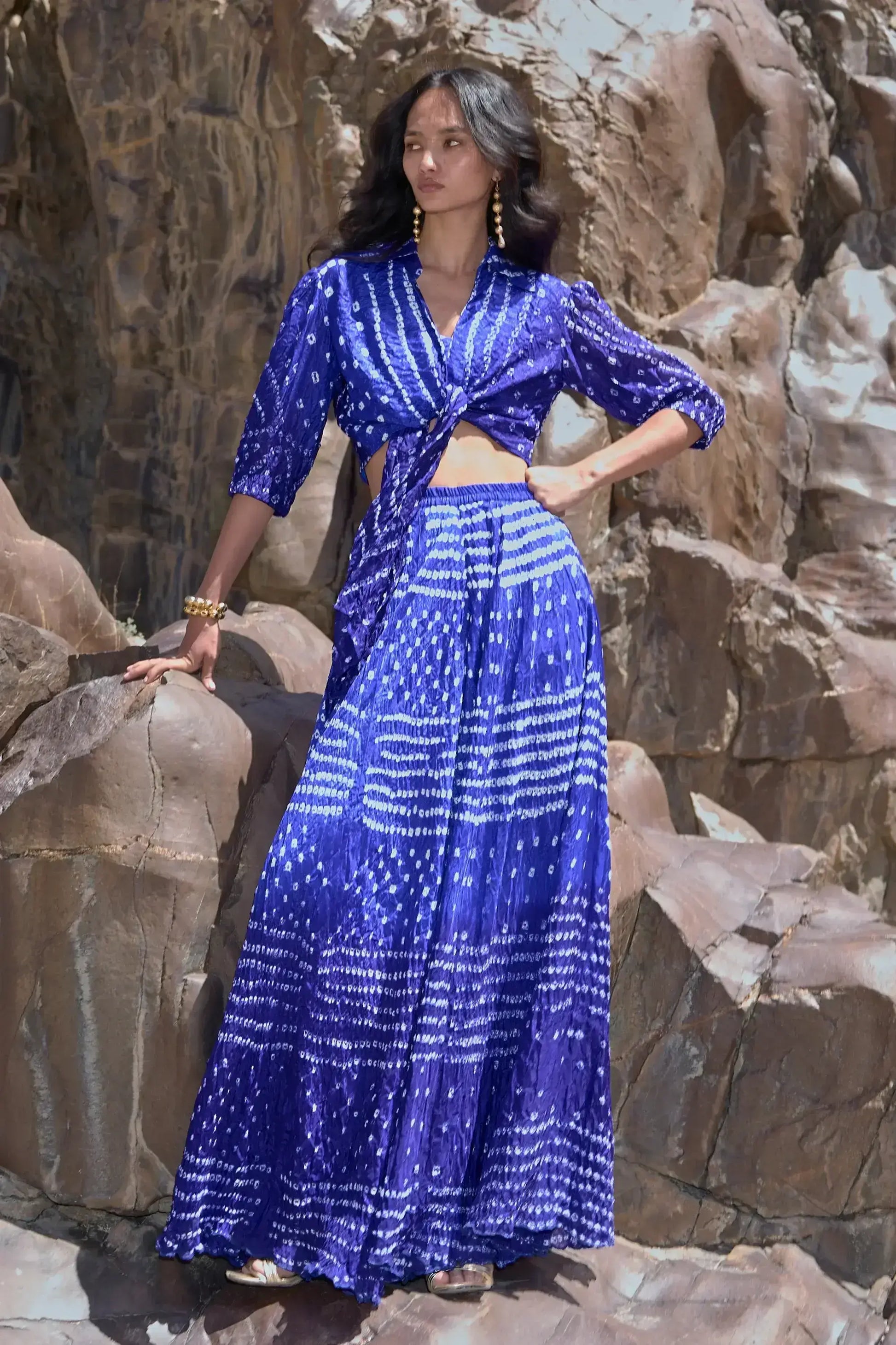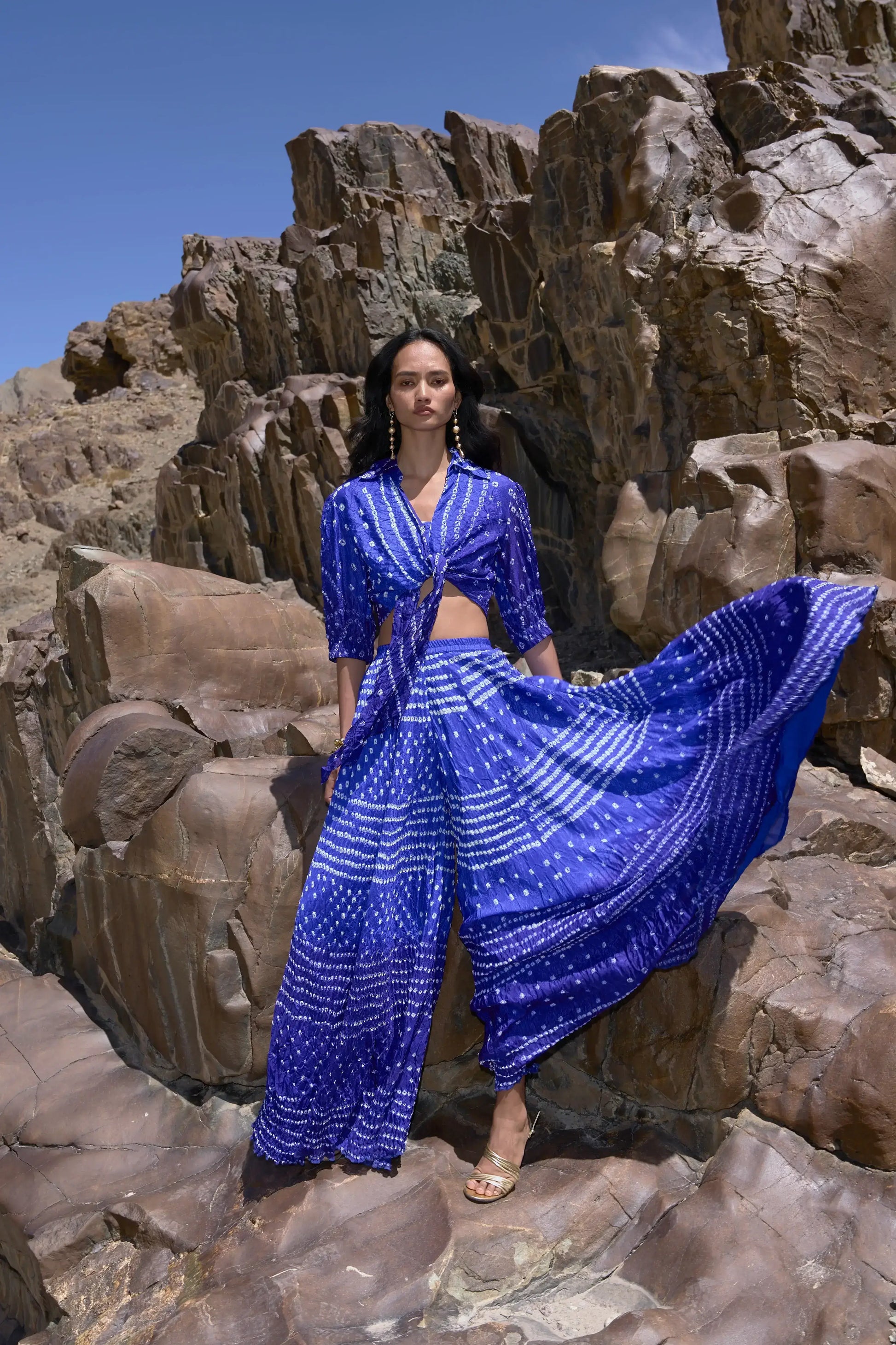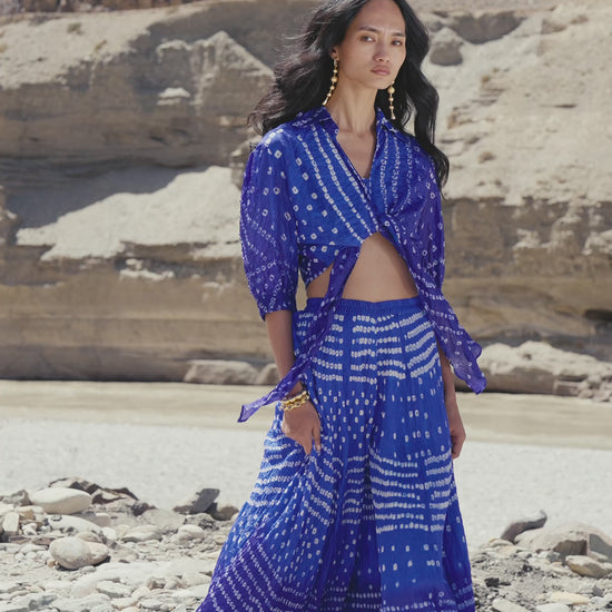 Crop shirt in tonal blue with placement bandhani and ombré detailing. Band collar with a concealed placket and self-tie knot detail at the front. Three-fourth bishop sleeves with elasticated cuffs. Lined at the front and back. Paired with matching flared and flowy pant. Wide-legged with lots of movement. Fully elasticated waist for comfort. Pant is fully lined. Made in natural, breathable viscose. Each piece is unique in colour and pattern as the bandhani tie & dye is a hand-done process.