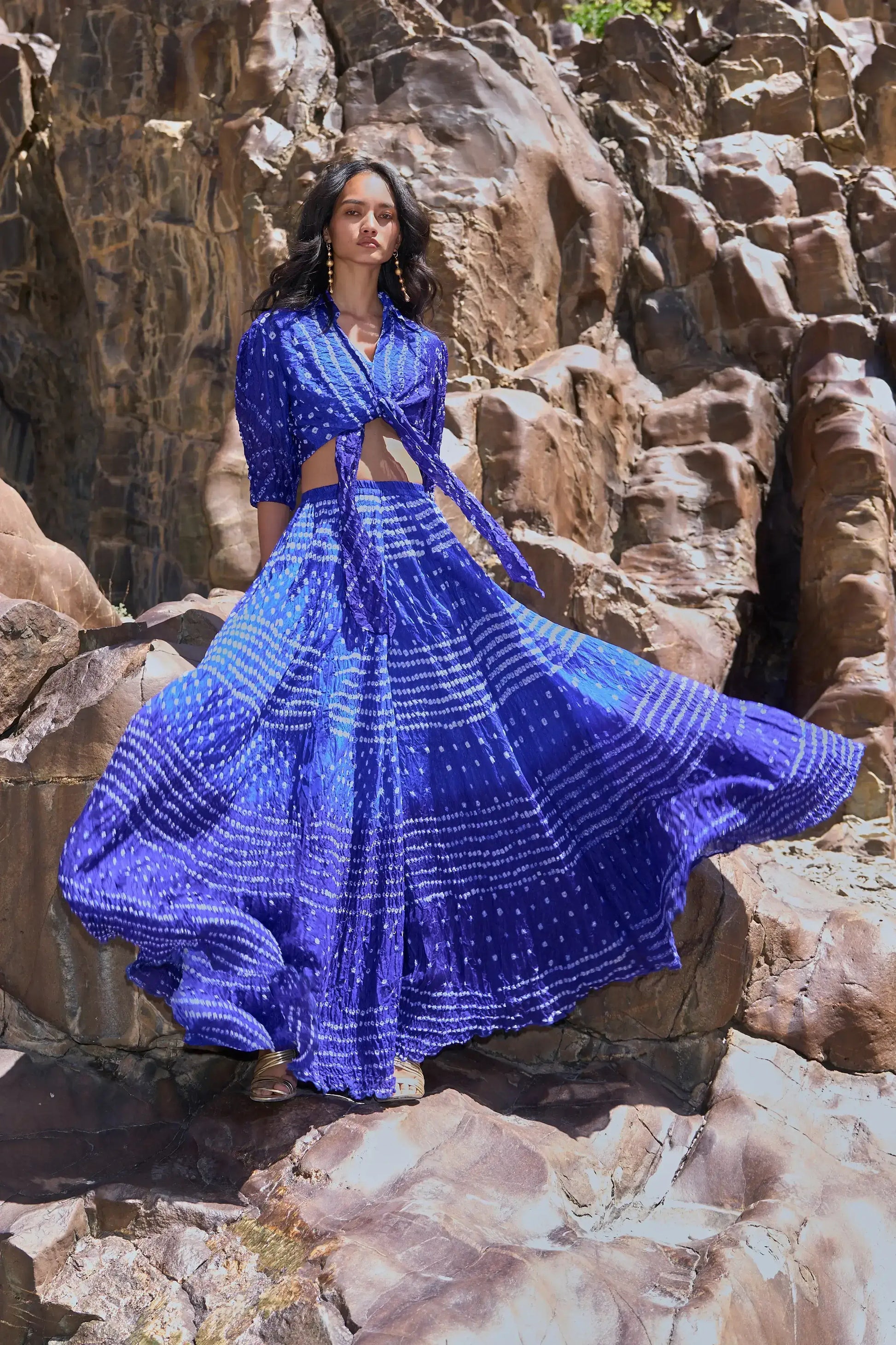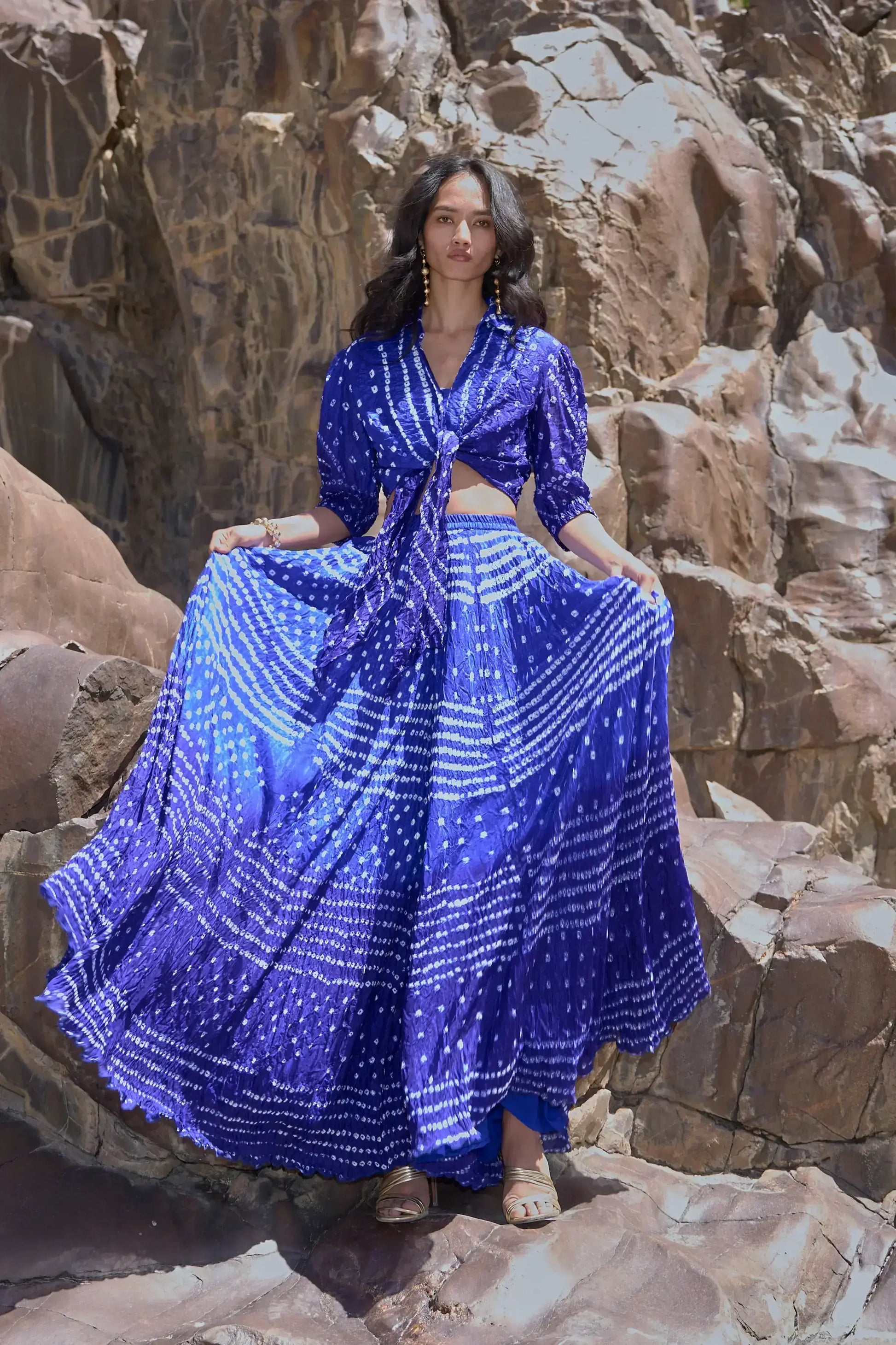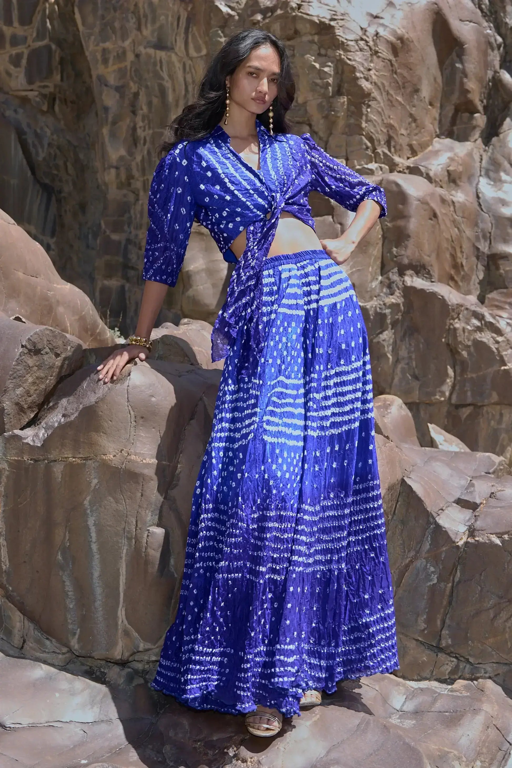 Crop shirt in tonal blue with placement bandhani and ombré detailing. Band collar with a concealed placket and self-tie knot detail at the front. Three-fourth bishop sleeves with elasticated cuffs. Lined at the front and back. Paired with matching flared and flowy pant. Wide-legged with lots of movement. Fully elasticated waist for comfort. Pant is fully lined. Made in natural, breathable viscose. Each piece is unique in colour and pattern as the bandhani tie & dye is a hand-done process.