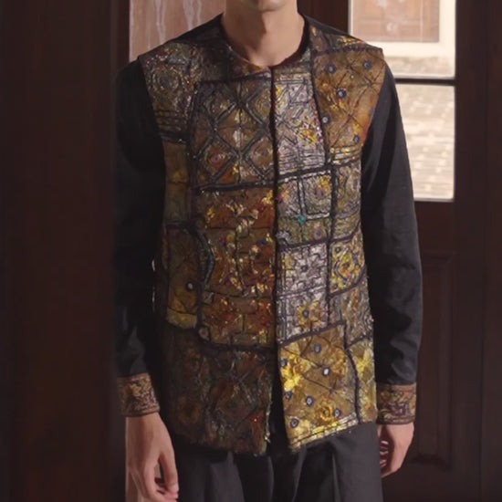 Banjara Bandi Jacket crafted from multicolour contrasting panels in a tribal-inspired irregular layout. Intricate embroidery in metallic dori, mirror accents, sequins, and jewel-like motifs. Round neck and a concealed button and hook/eye placket. Garment is fully lined. Embroidery that dates back to the traditions of the nomadic Banjaras - India’s desert travelers often referred to as Bedouins.