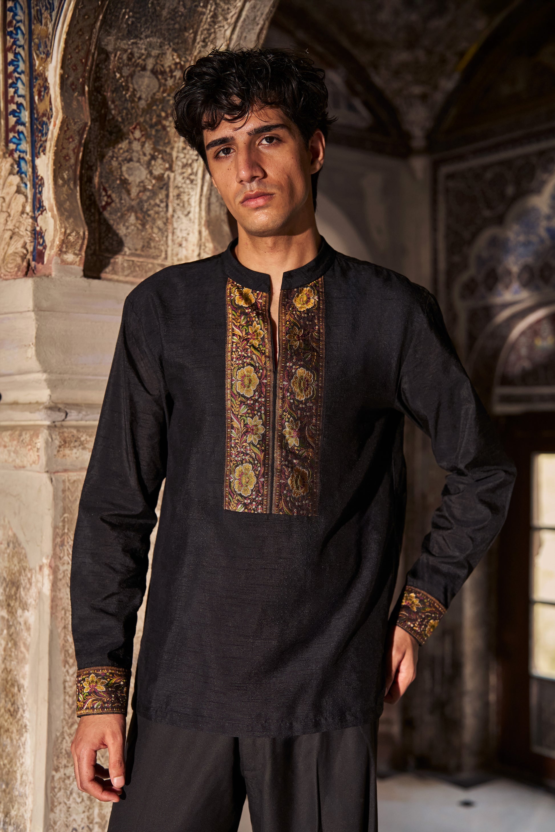 Black relaxed fit shirt with vintage Benares weave silk sari borders placed on the center front, sleeve cuffs, and across the back. Band collar with snap button cuffs. An archival piece, defined by the scarcity of its handloom borders.