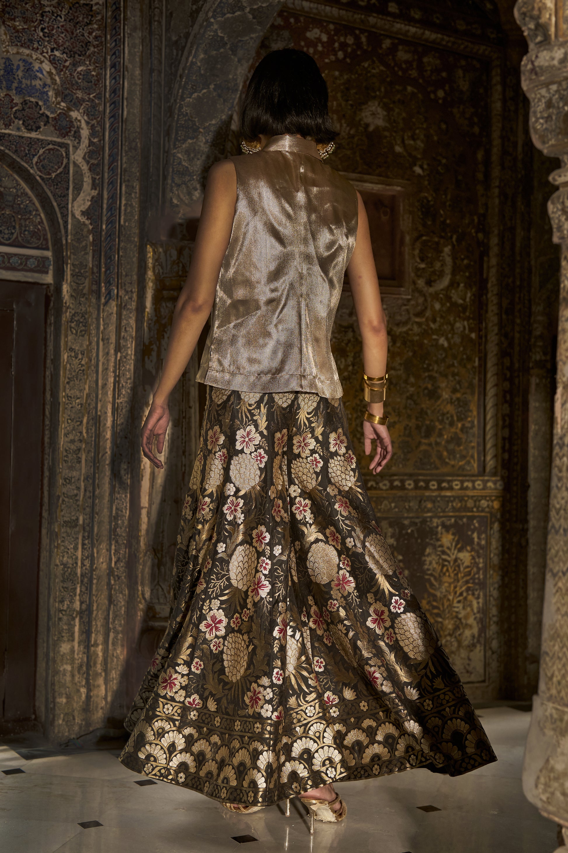 Soft Benares brocade sleeveless shirt with a shirt collar and concealed button placket. Relaxed fit.