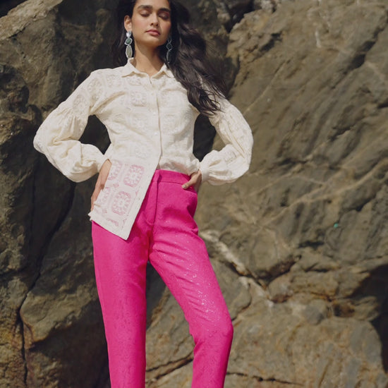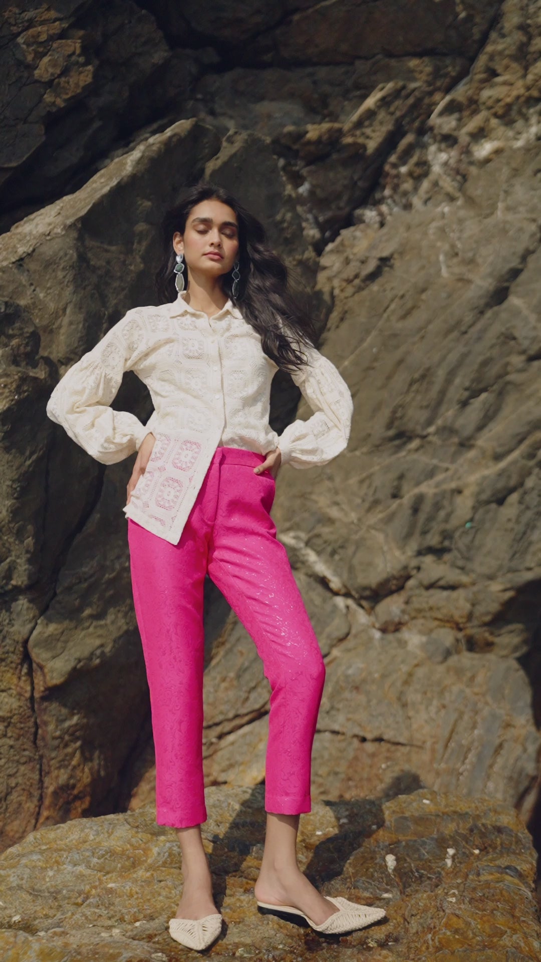 Pink on pink patterned pant. Tapered fit. Hook/eye and zip closure in the front. Pockets in the sides and back..