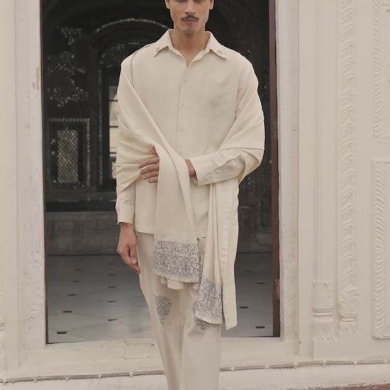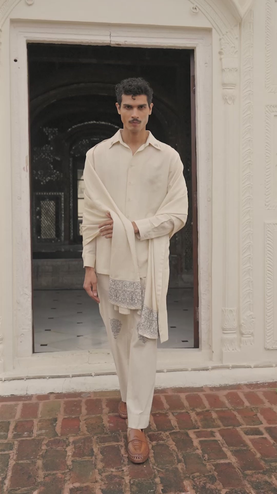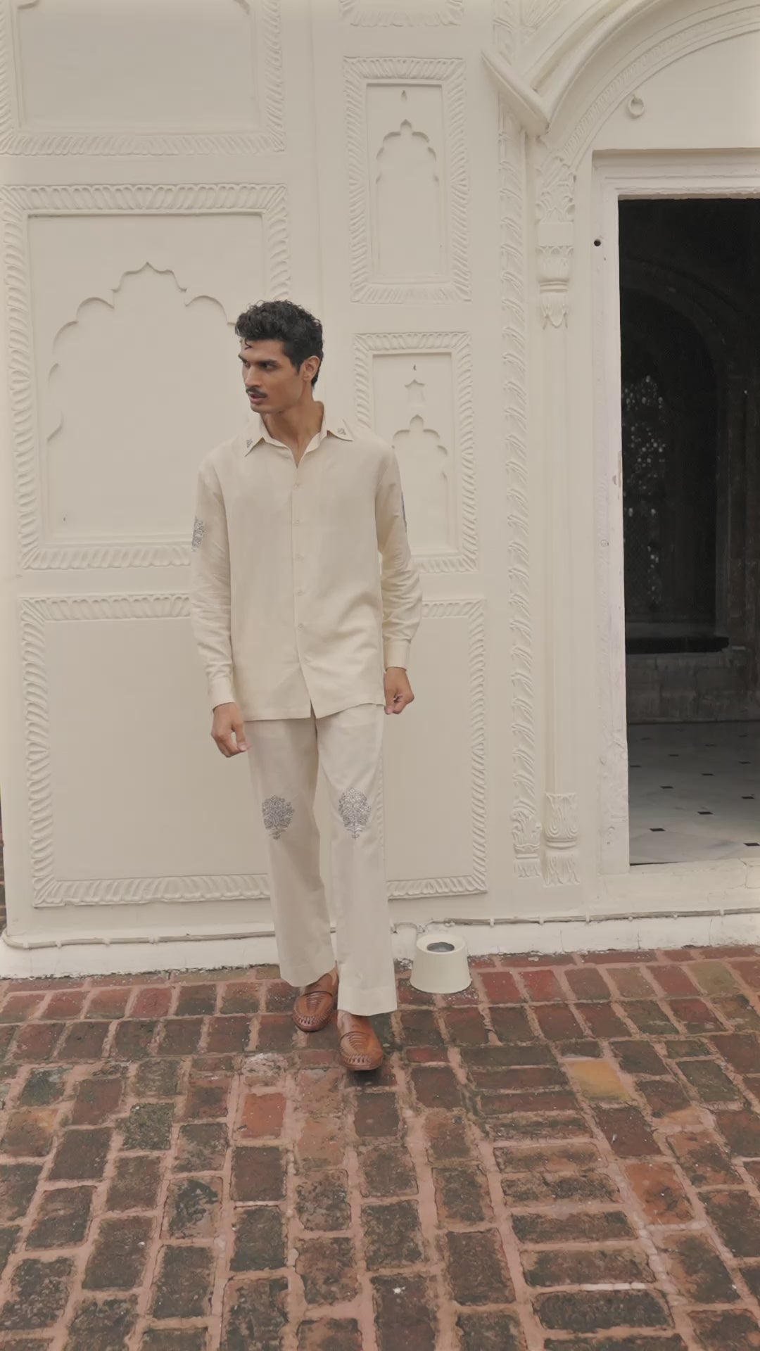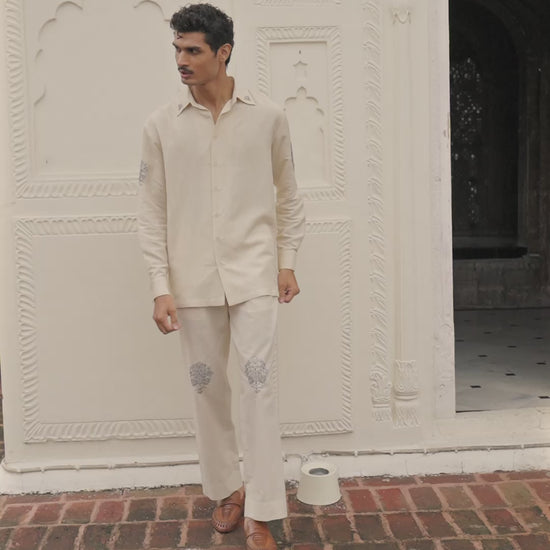 Full sleeve shirt in soft beige earthy linen. Dramatic large ivory and black embroidered motif placed in the back, with smaller motifs on the shirt collar and full sleeves. Concealed button-down placket. Garment is fully lined.
