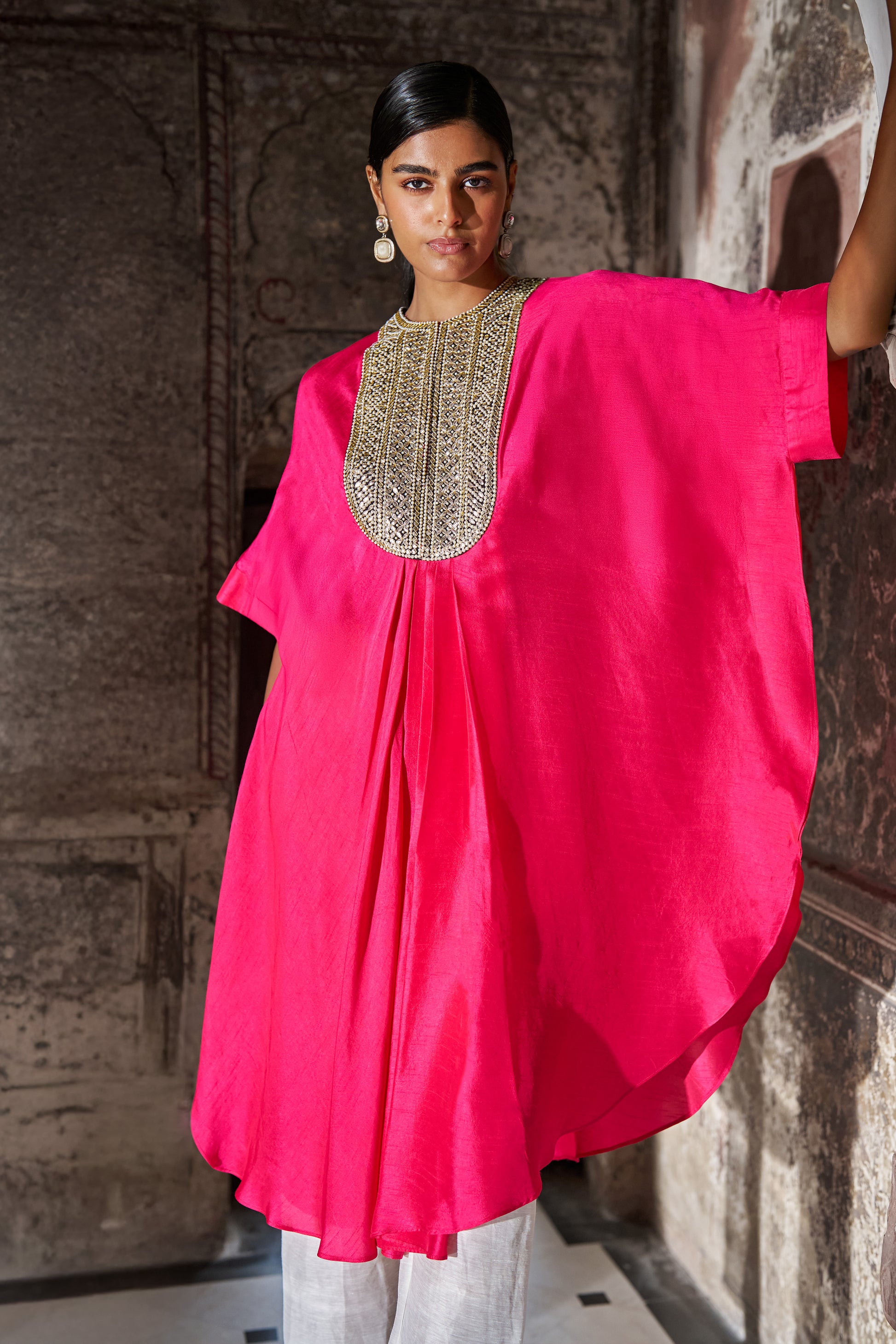 Longline top in fuchsia viscose dupion. Hand-applied gota embroidery accented with pearls and threadwork placed at the bib. Dolman sleeves with hand-sewn front detailing that adds shape. Round neckline with concealed hook/eye closure. Inverted pleat at the back opens into a curved hem. Boxy fit with an elegant, graceful fall.