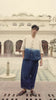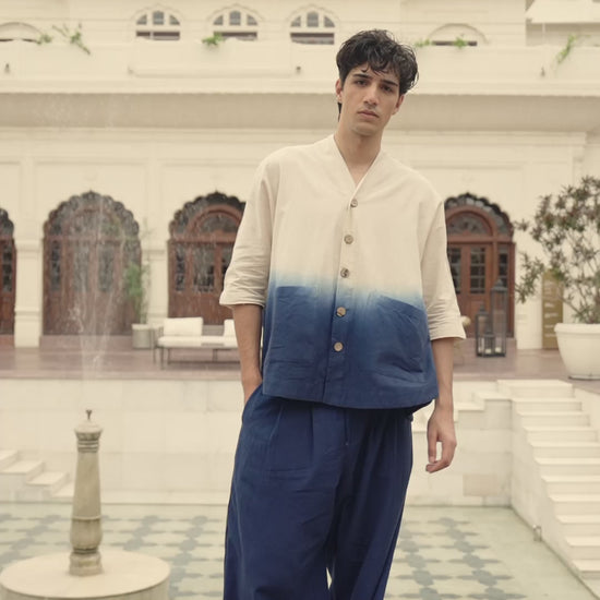 Indigo and ivory ombré dyed shirt in natural linen. Boxy fit with elbow-length sleeves. High-low curved hem with front patch pockets. Concealed snap-button front closure with wooden button detailing. Box pleat at the back. Paired with complementary relaxed fit wide-leg pant in ombré indigo. Front pleat detail with hand-sewn blanket stitch at the hem. Semi-elasticated waistband with belt loops. Concealed hook/eye and button closure. Cropped length with pockets in the sides.
