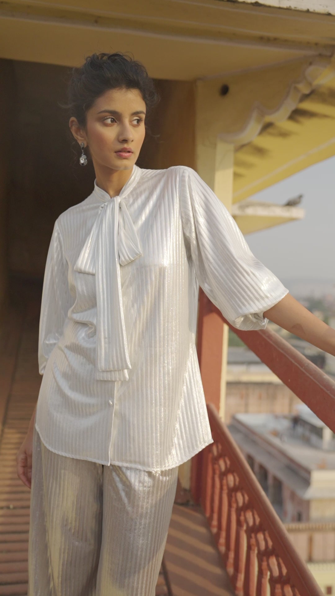 Shimmer textured stripe in soft mother of pearl white. Button front shirt with a front neck tie detail. Pearl buttons on the front placket and cuffs Side slits. Paired with complementary shimmer textured stripe pant in soft rose gold. Straight-fit with a fully elasticated waist.