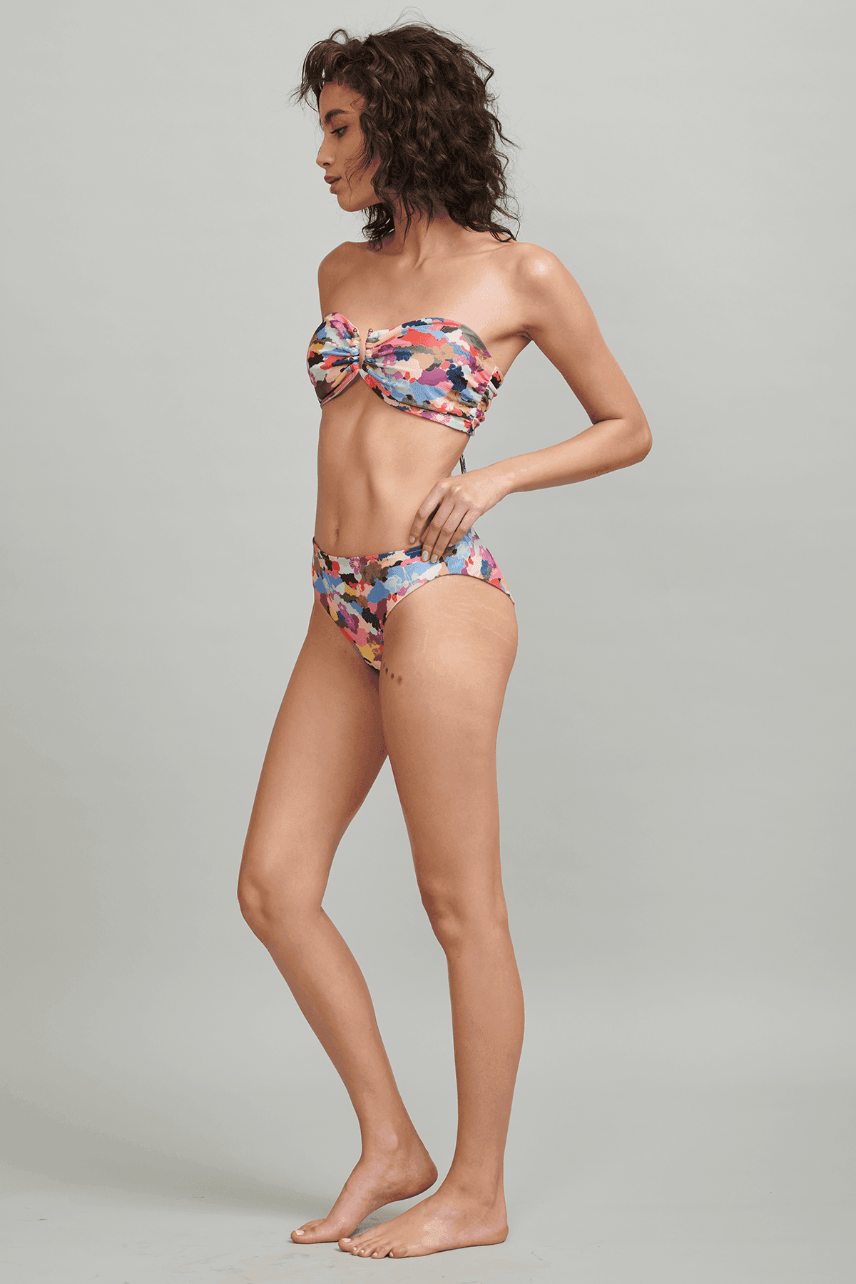Bright multicolor print inspired by a busy landscape. U-shaped metal hardware. Made of high-performance, sustainable techno-fabric; 100% recycled polyester from pre and post-consumer materials. Resistant to chlorine, suntan creams, and oils.