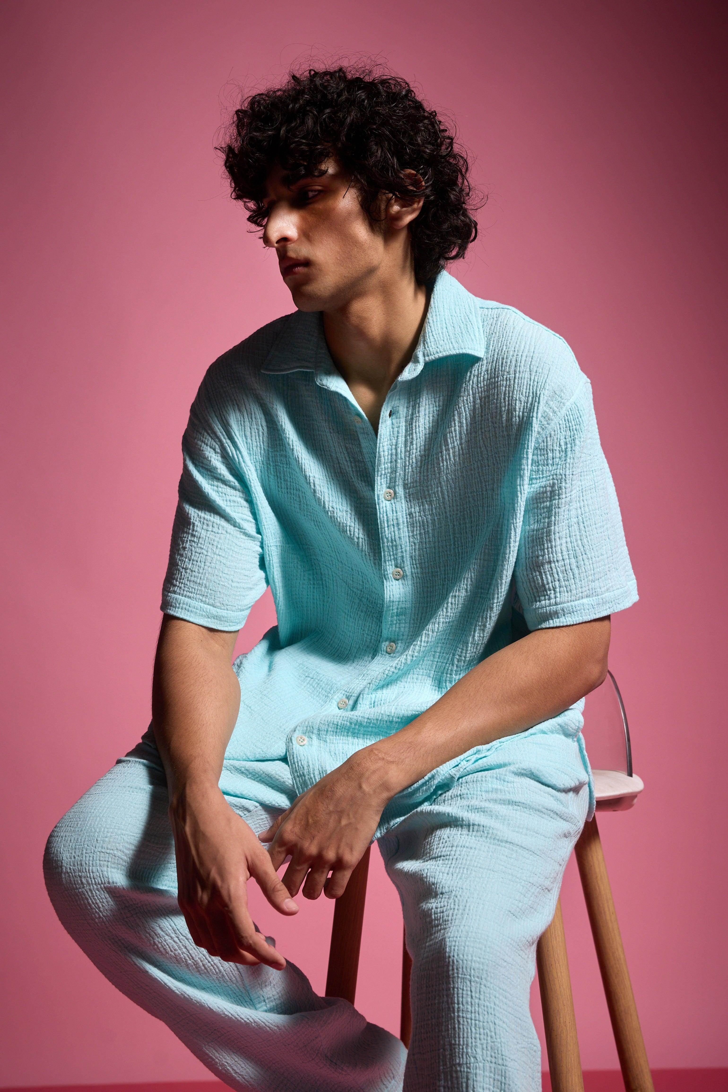 Straight cut pants in textured organic crinkle cotton fabric. Features an elastic waistband with drawstrings, and side and back pockets.