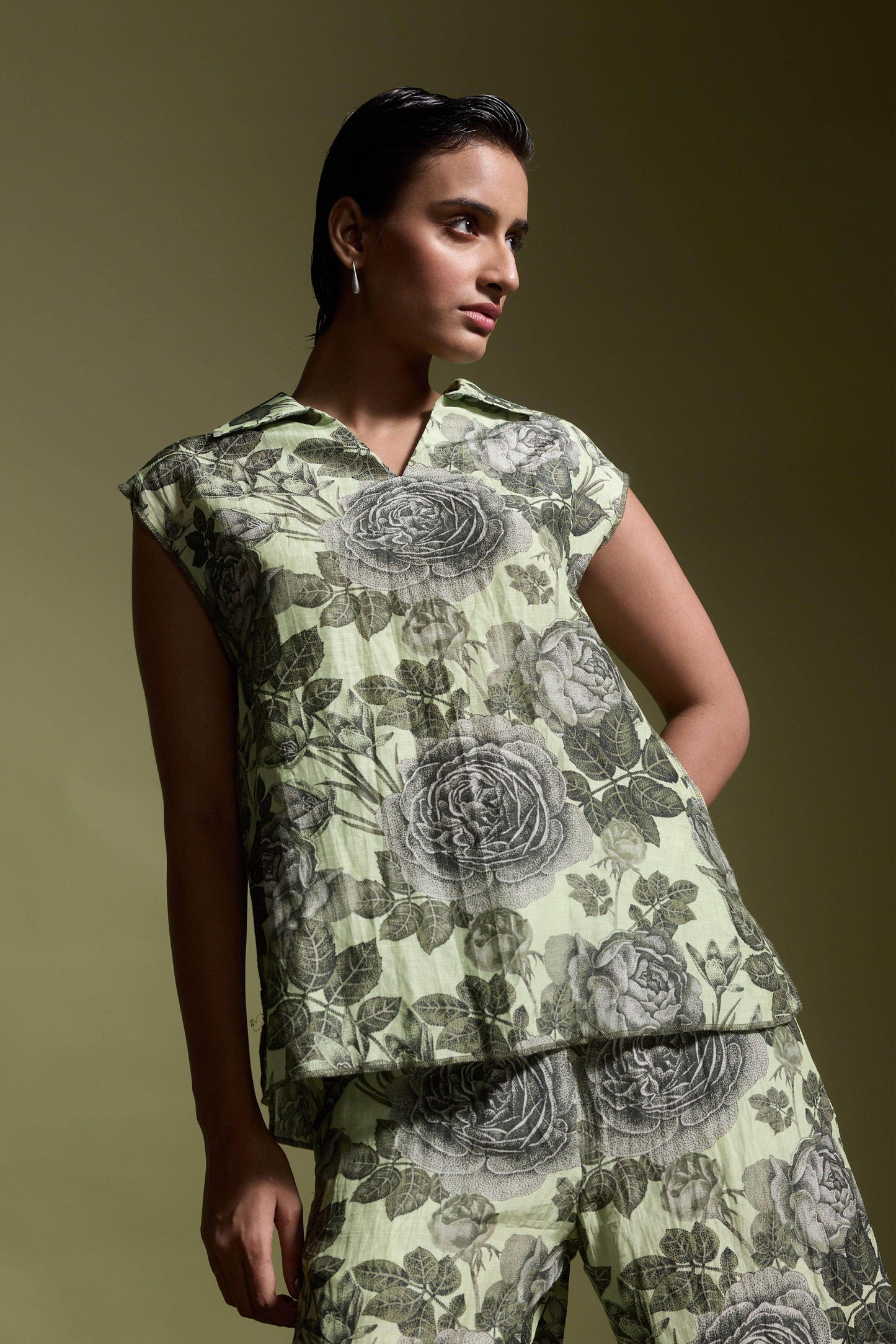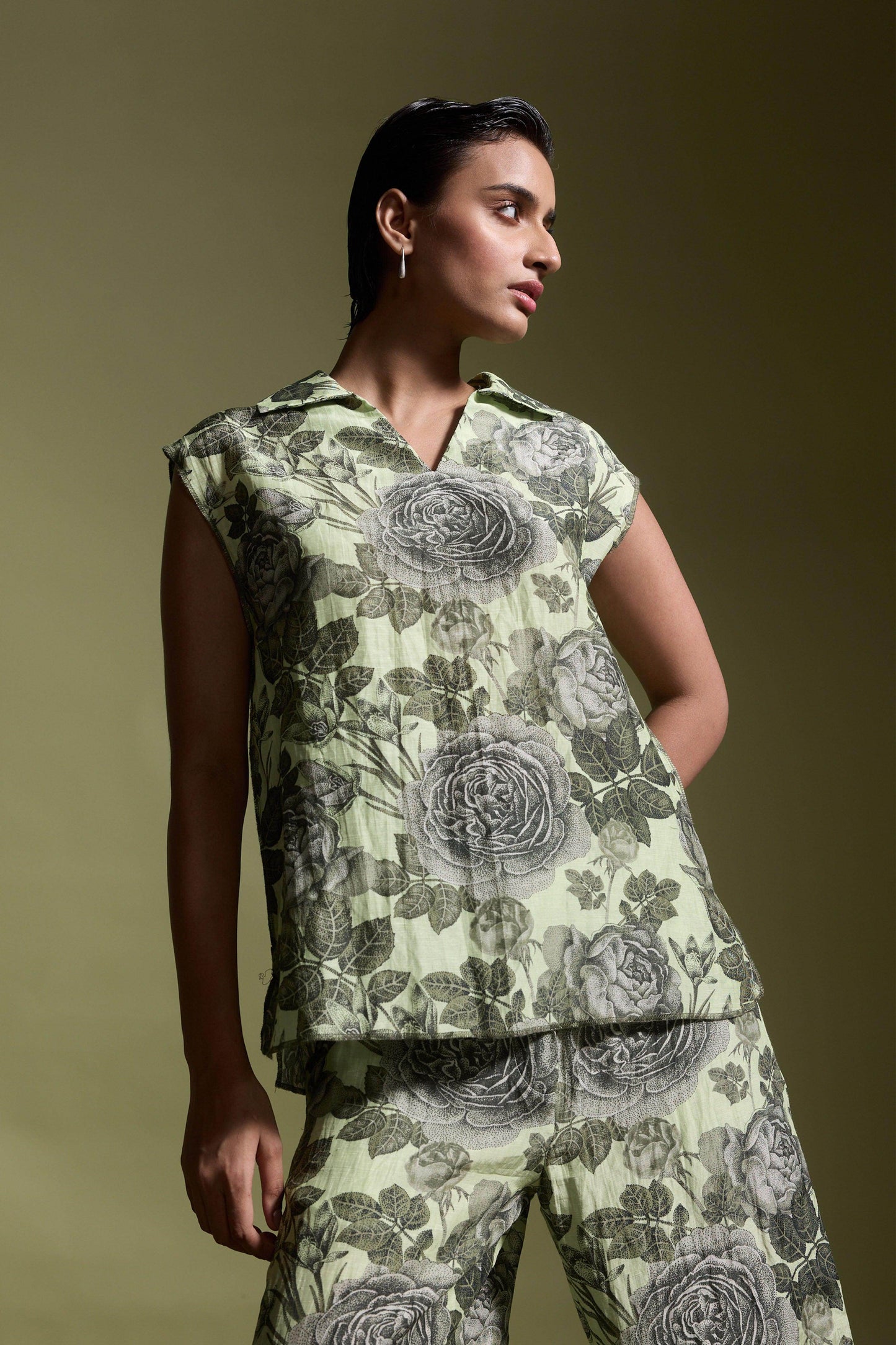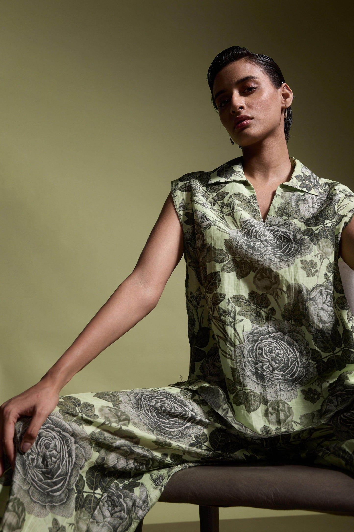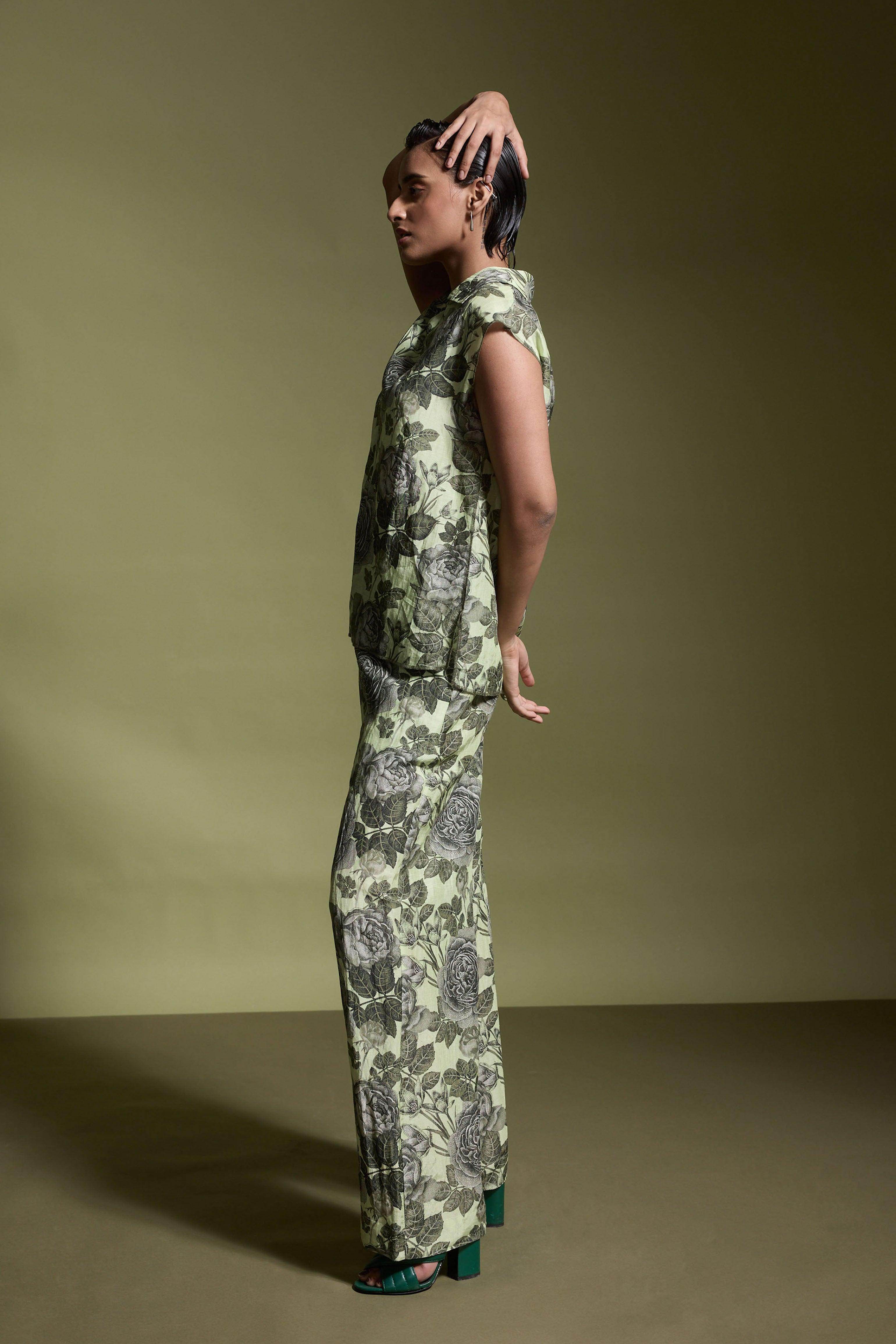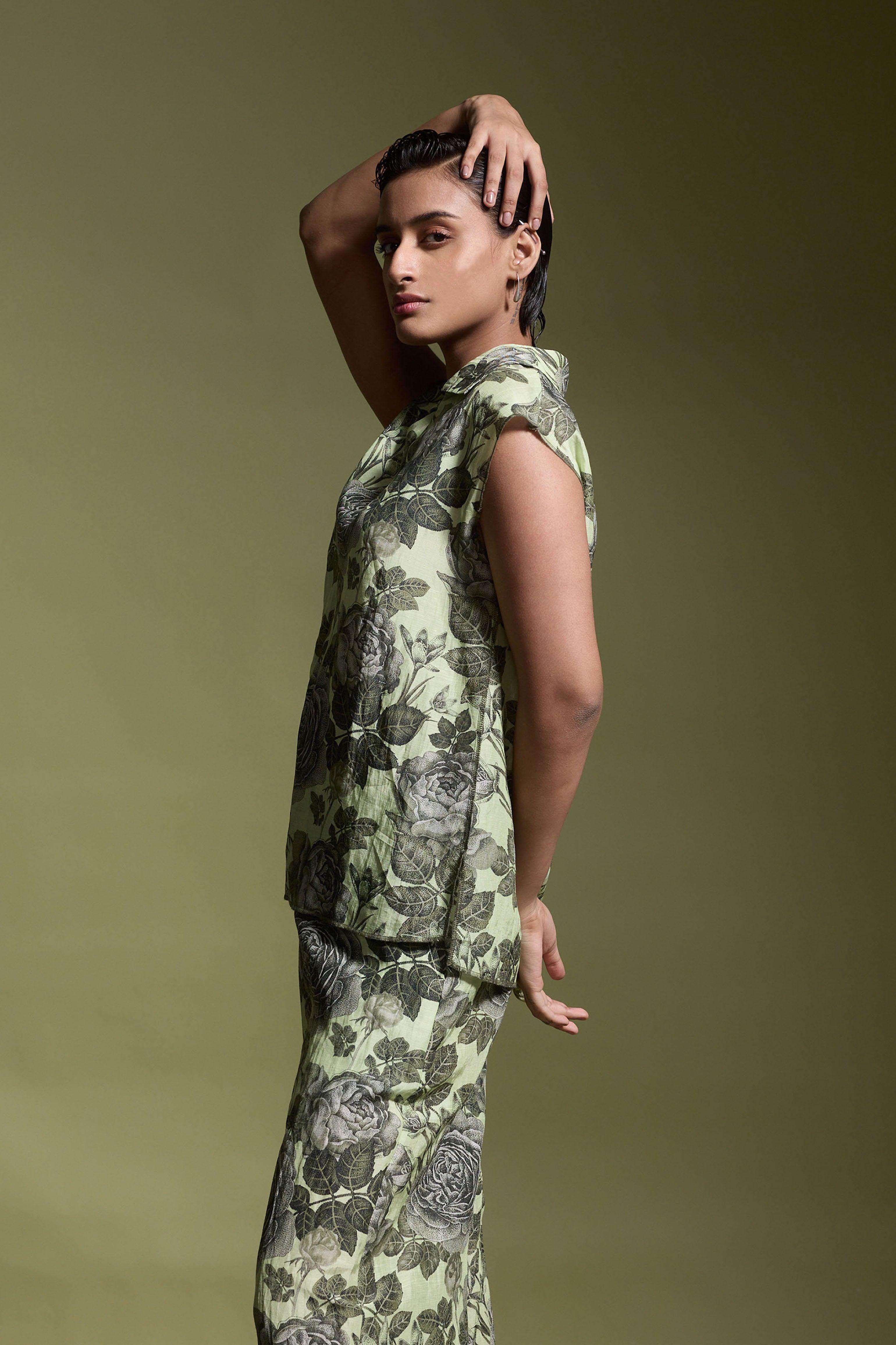 Sleeveless popover top with a pistachio base and tonal green floral print. Relaxed fit. Shirt collar and V-neck. Overlock stitch detailing on the hems. Made from a natural linen blend. Paired with Wide-leg pants with a pistachio base and tonal green floral pattern. Relaxed fit. Semi-elasticated waistband with drawstring. Side and back pockets. Crafted from a natural linen blend.