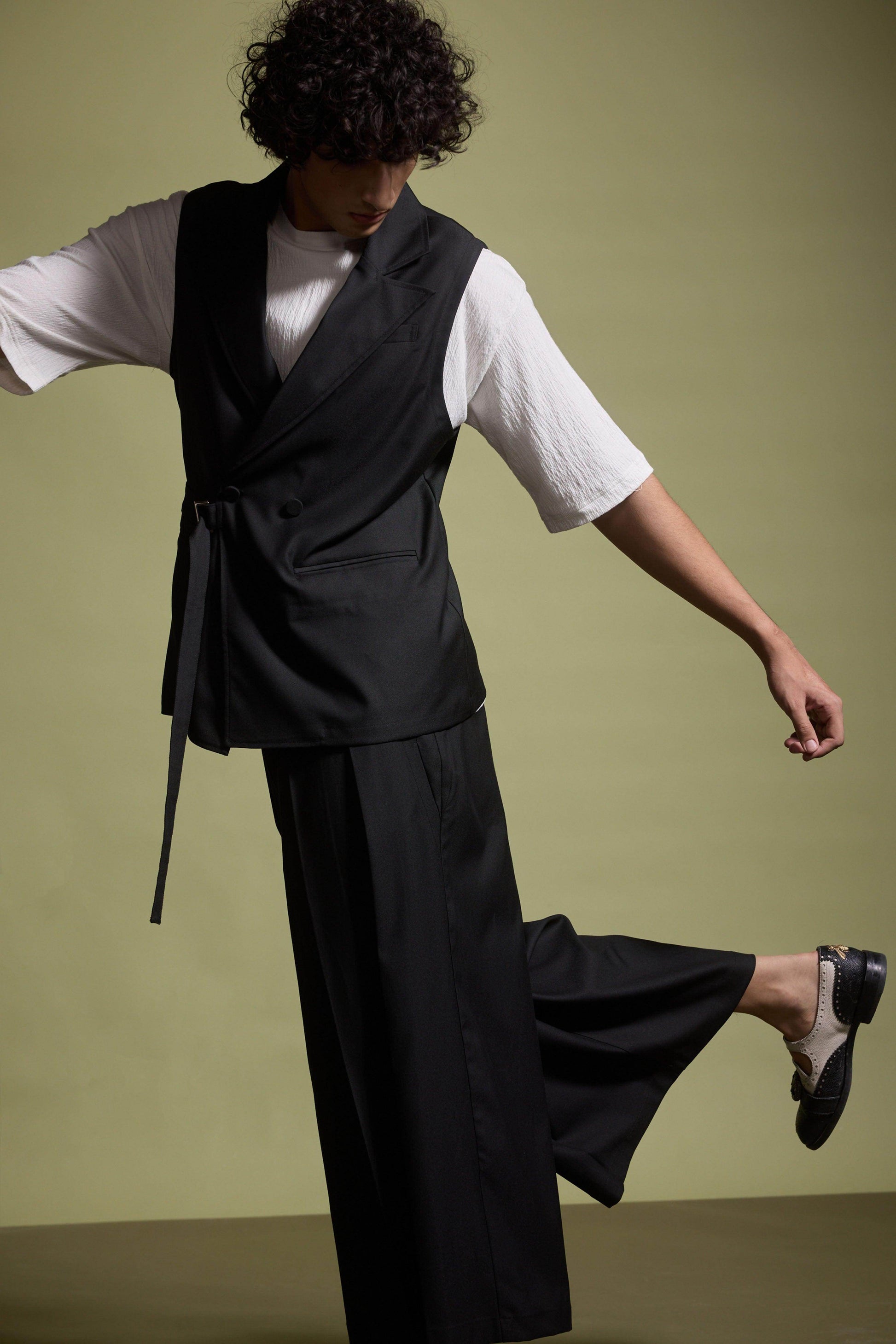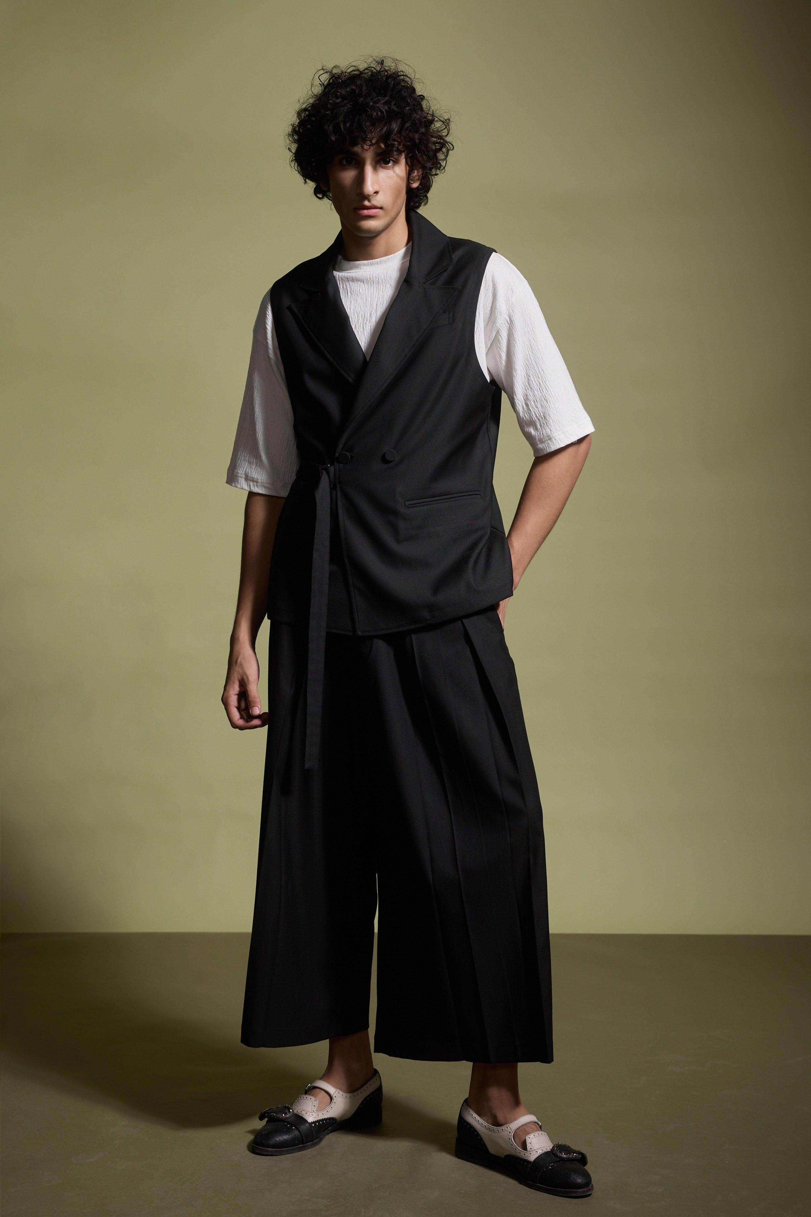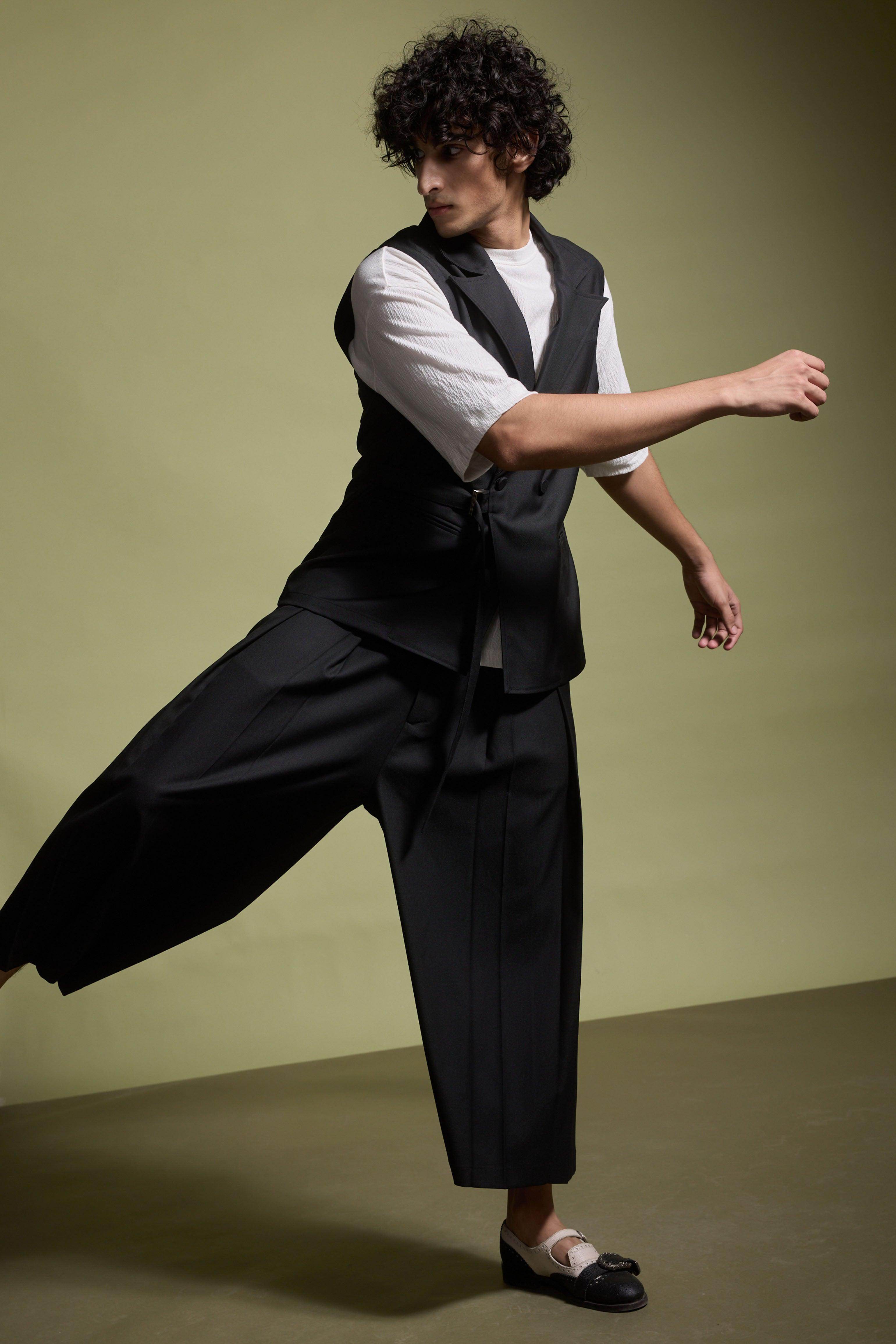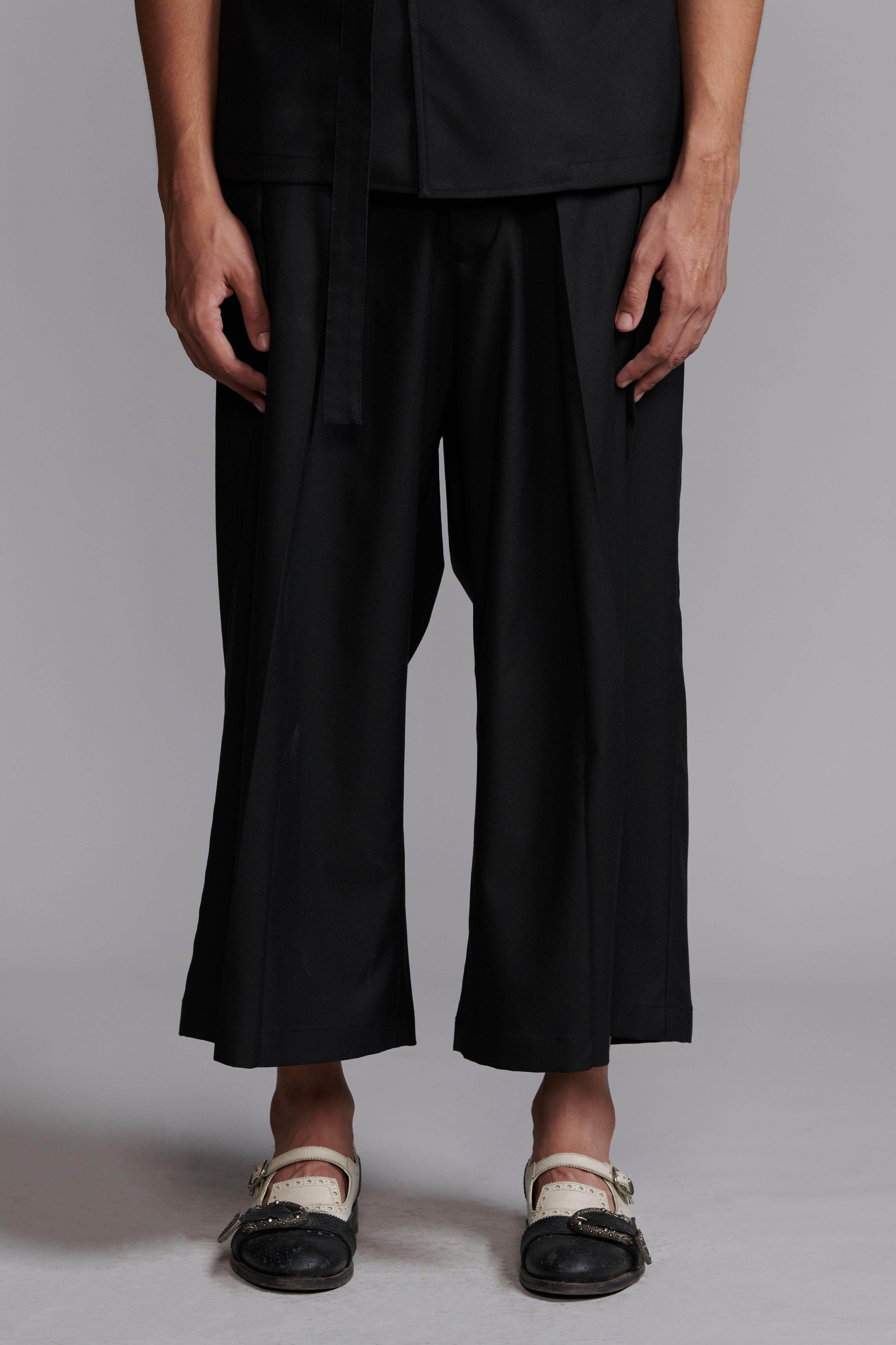 Wide-legged pants with a flared hem and hand-sewn pleats at the waist that open out toward the hem. Semi-elasticated waistband with belt loops. Features side and back pockets. Hook-and-eye and zip closure in the front. Made from all-weather suiting material.