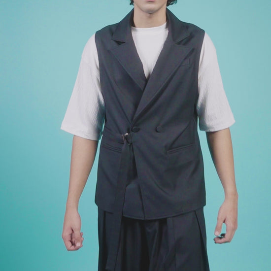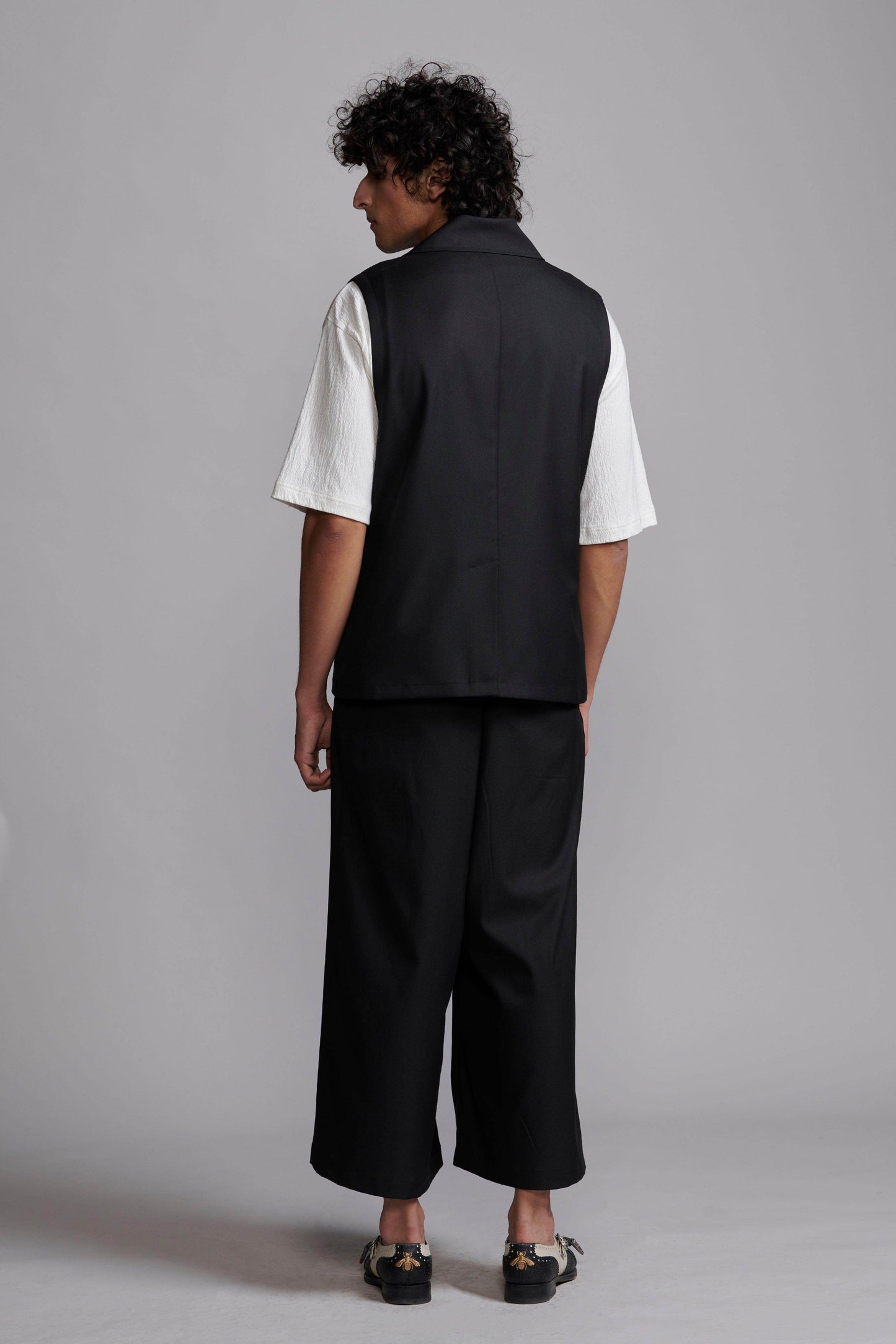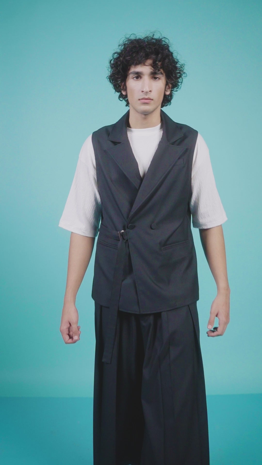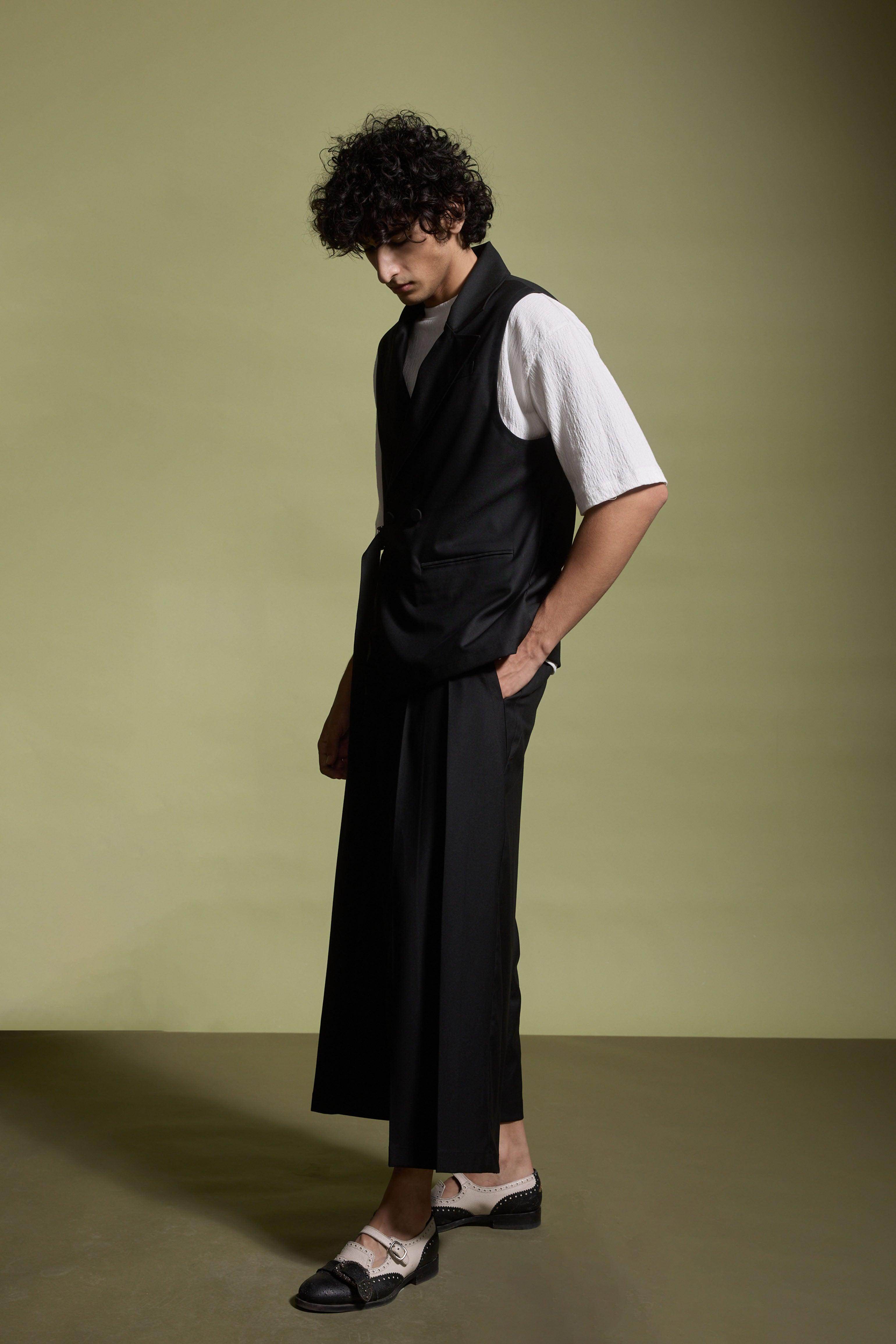 Wide-legged pants with a flared hem and hand-sewn pleats at the waist that open out toward the hem. Semi-elasticated waistband with belt loops. Features side and back pockets. Hook-and-eye and zip closure in the front. Made from all-weather suiting material.