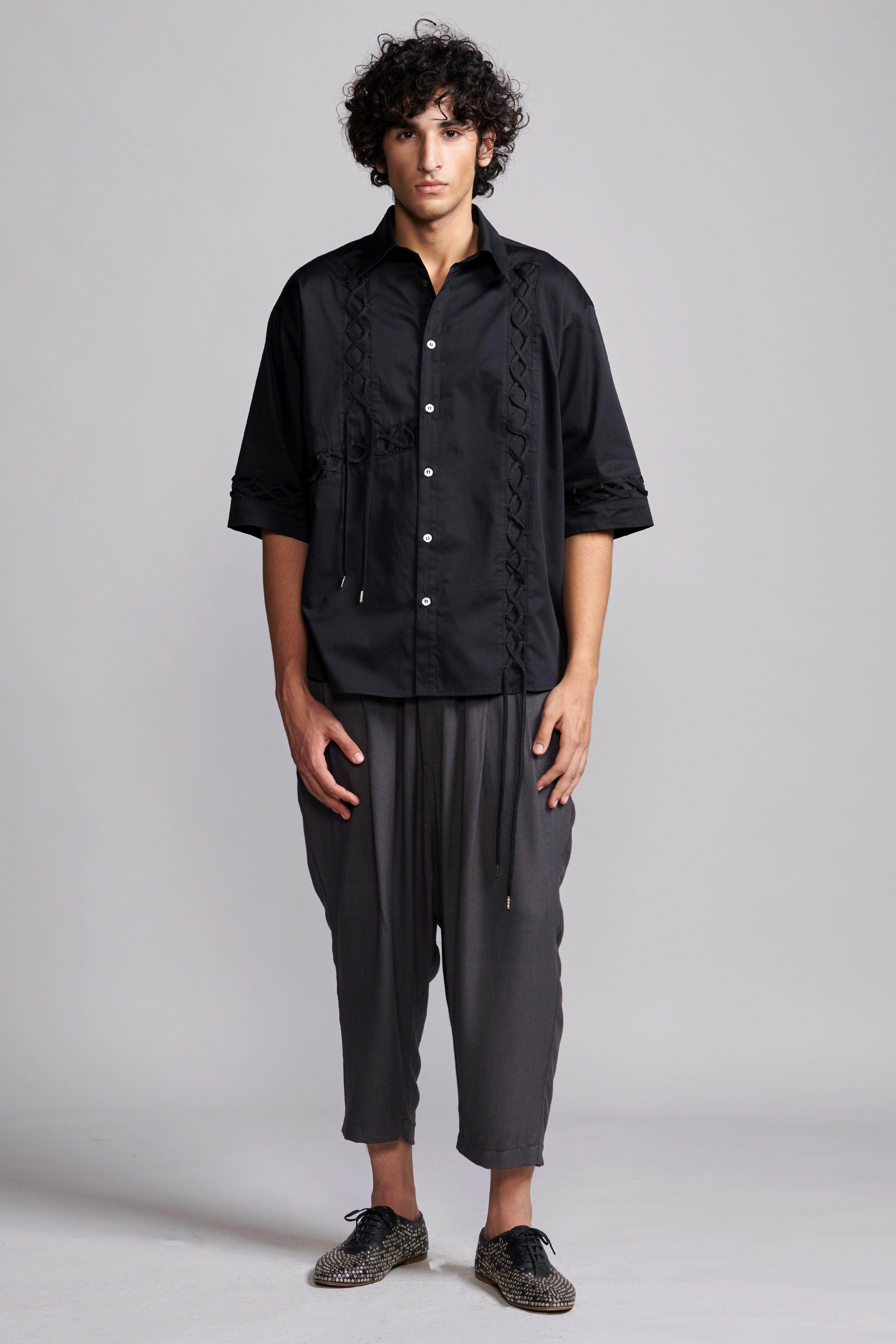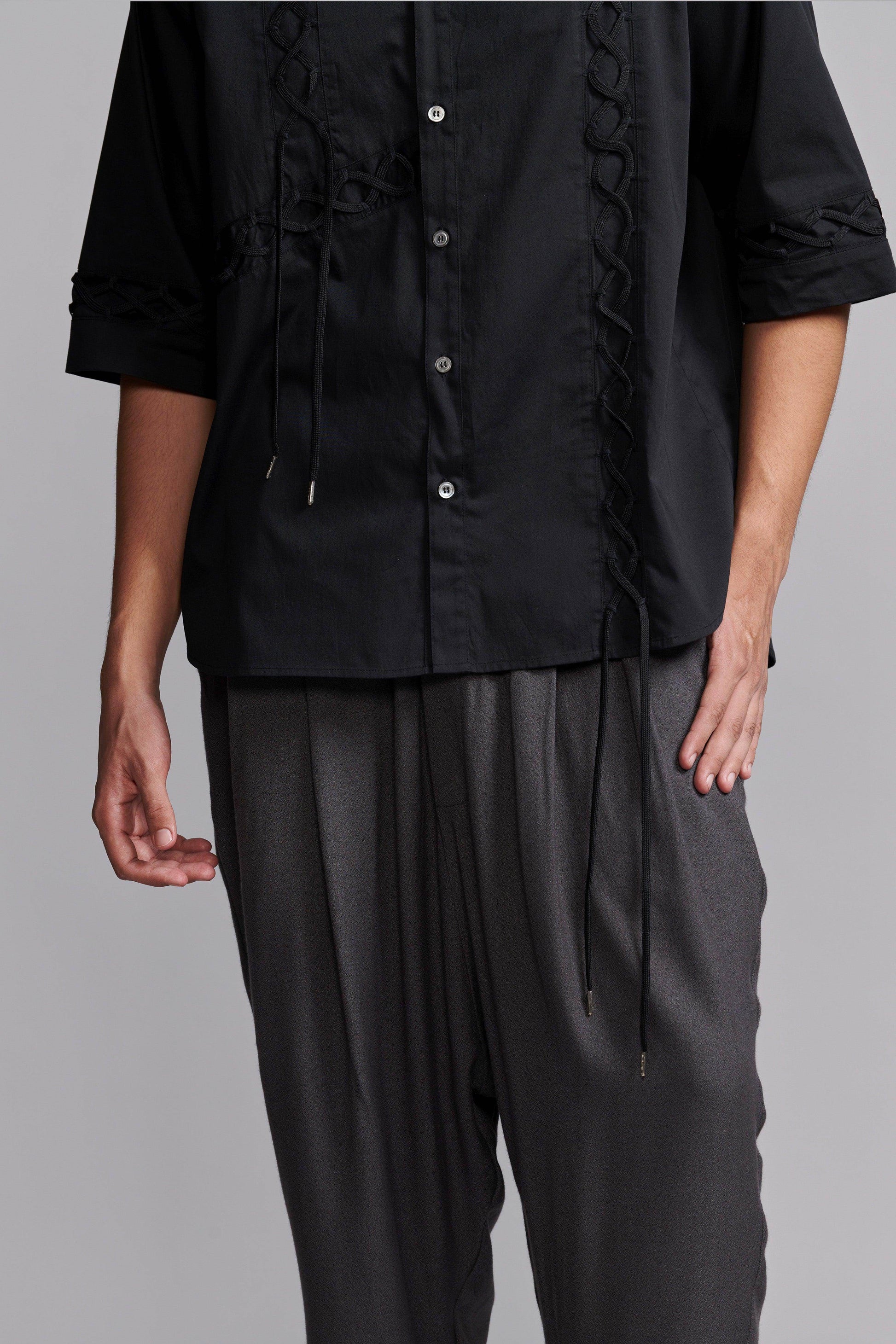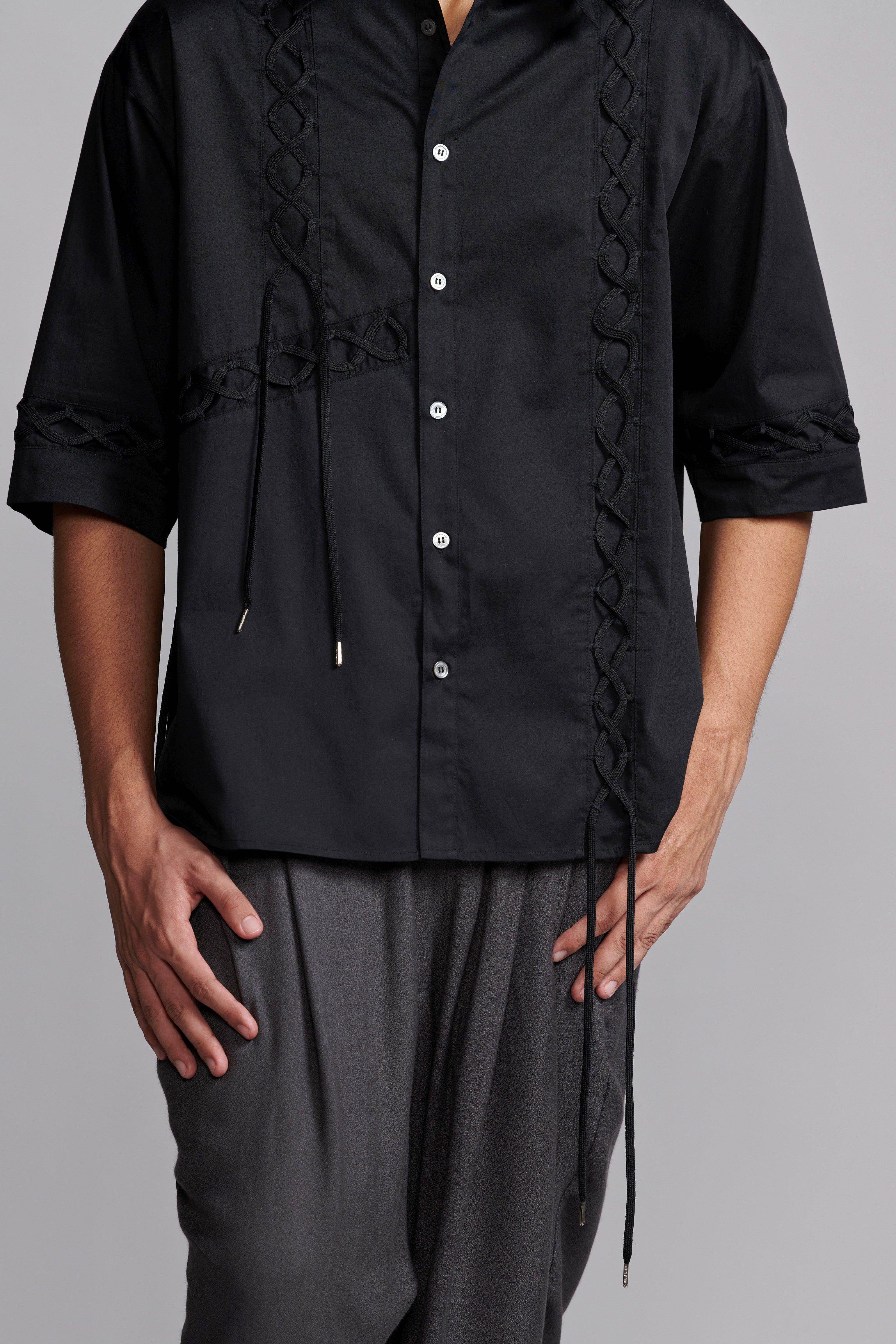 Black relaxed fit shirt with criss crossing shoelace detailing in the front, sleeve and back. Organic cotton poplin shirt with a button down placket, shirt collar and half sleeves. Relaxed fit.