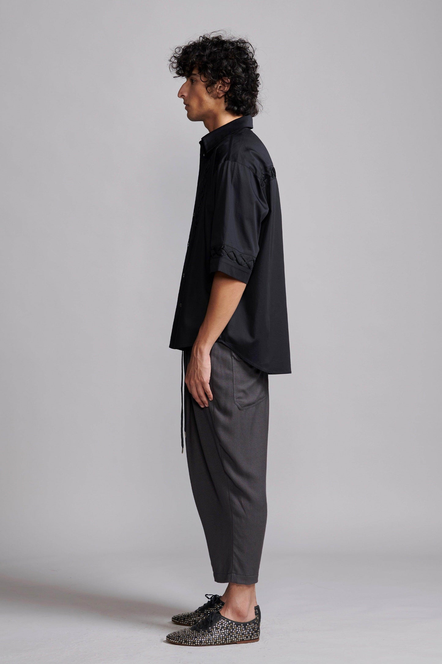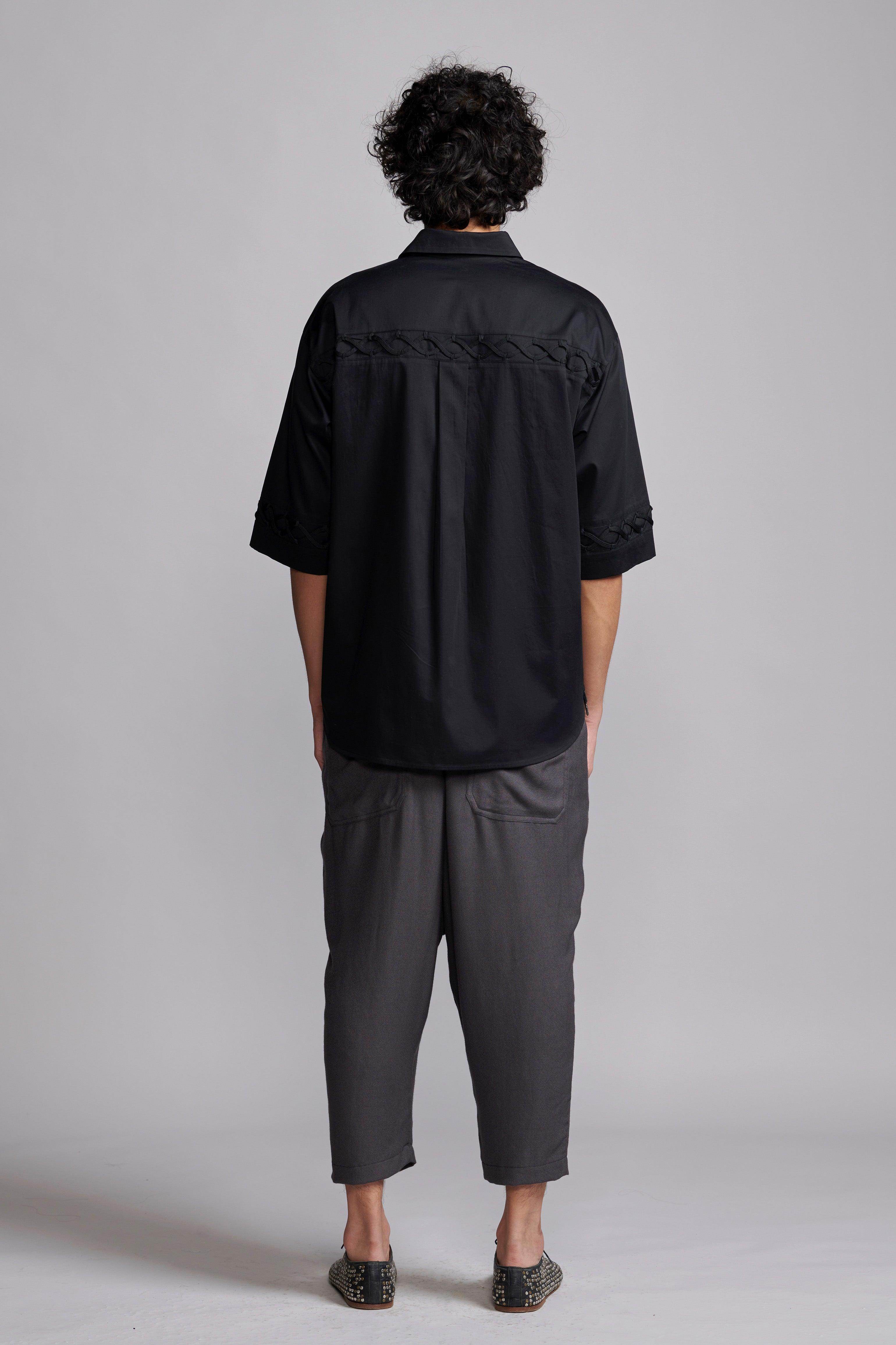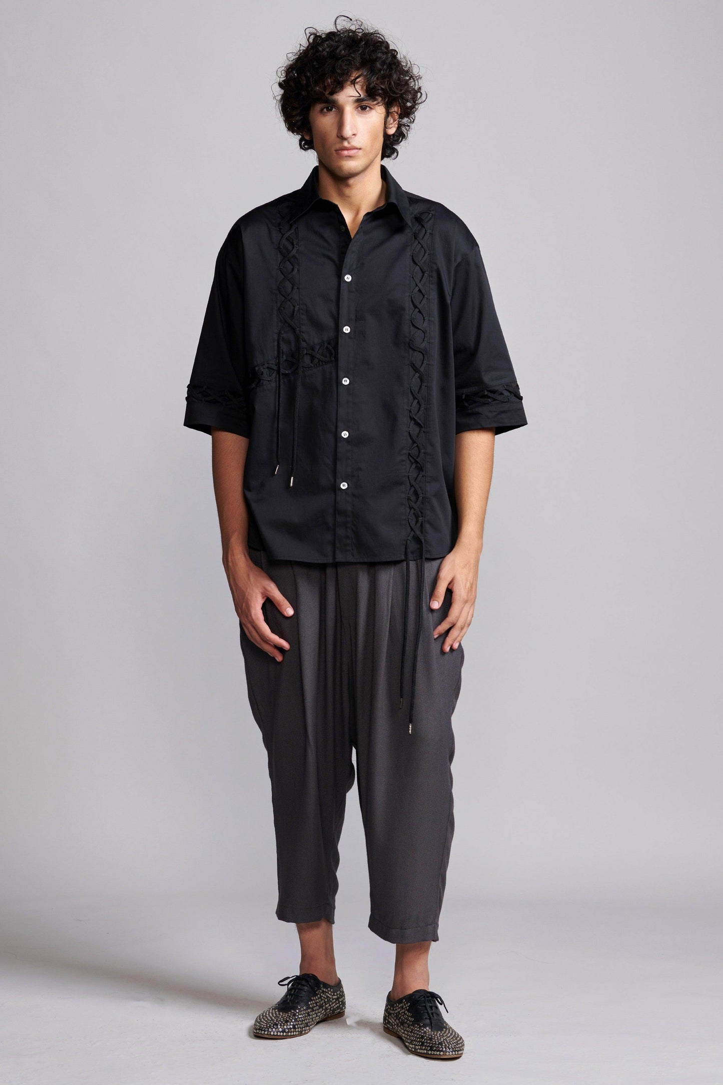 Black relaxed fit shirt with criss crossing shoelace detailing in the front, sleeve and back. Organic cotton poplin shirt with a button down placket, shirt collar and half sleeves. Relaxed fit.