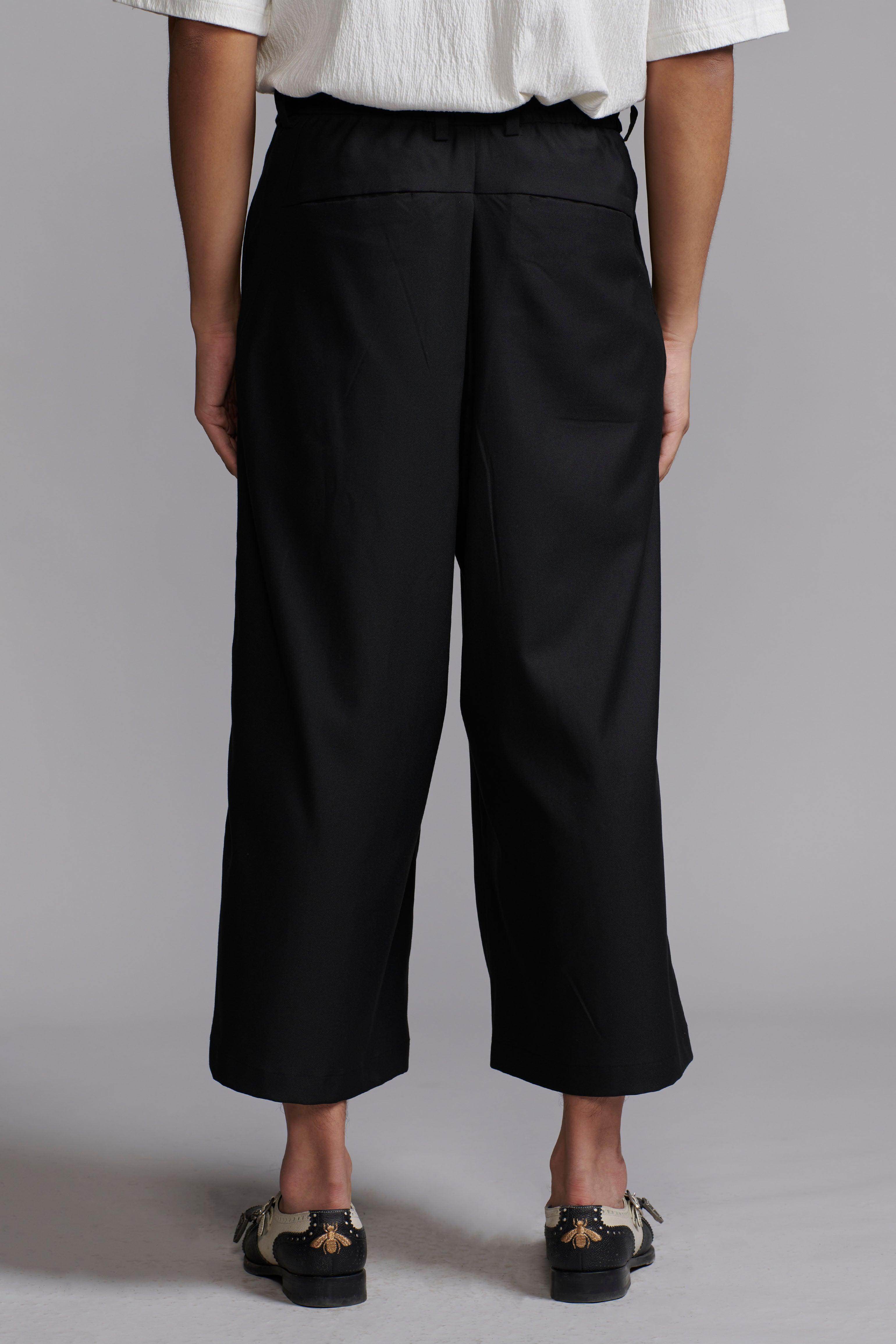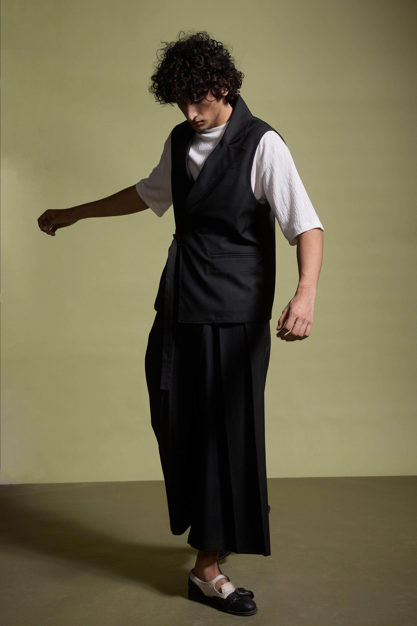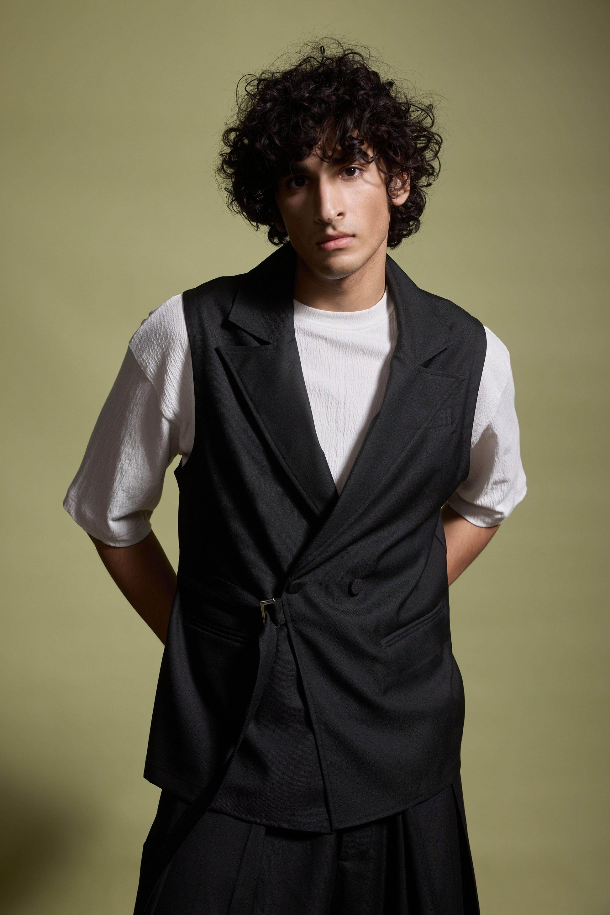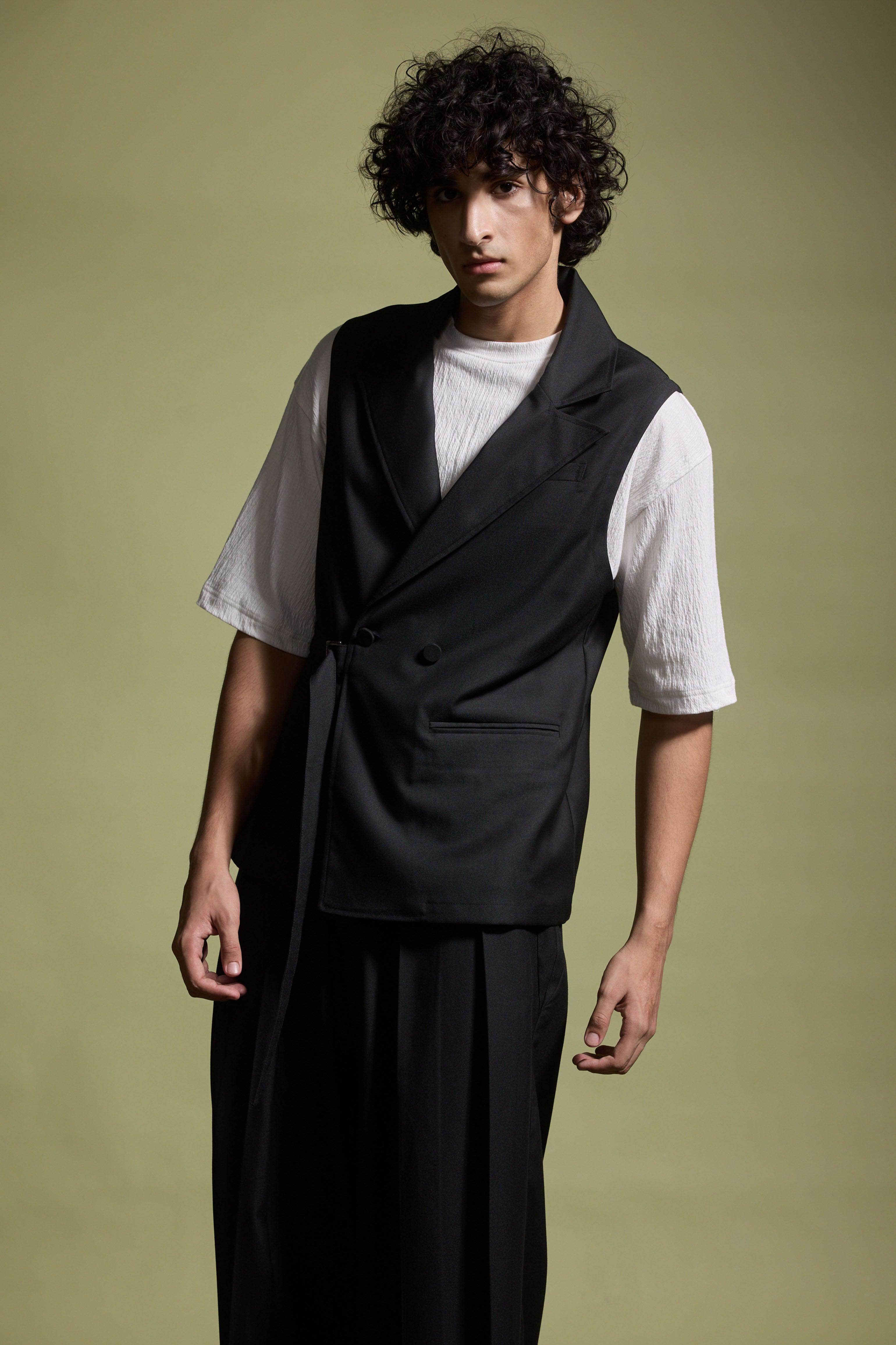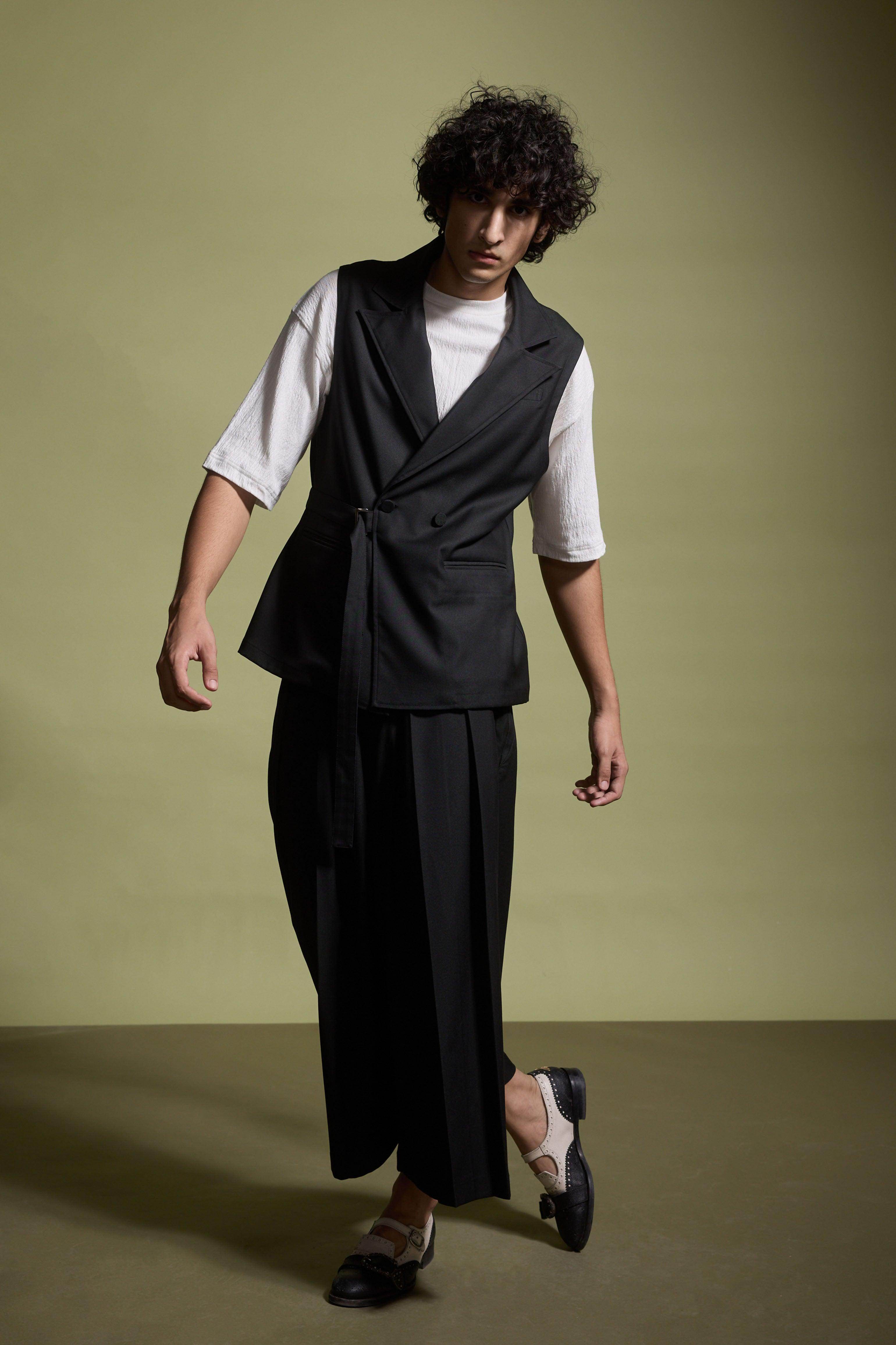 Black sleeveless double-breasted waistcoat-inspired jacket. Features a notch collar with two buttons and front pockets. Functional belt with metal buckle can be worn loose (American) or fitted (Italian). Unstructured and unlined. Made from all-weather suiting material. Paired with Wide-legged pants with a flared hem and hand-sewn pleats at the waist that open out toward the hem. Semi-elasticated waistband with belt loops. Features side and back pockets. Hook-and-eye and zip closure in the front. Made from all-weather suiting material.