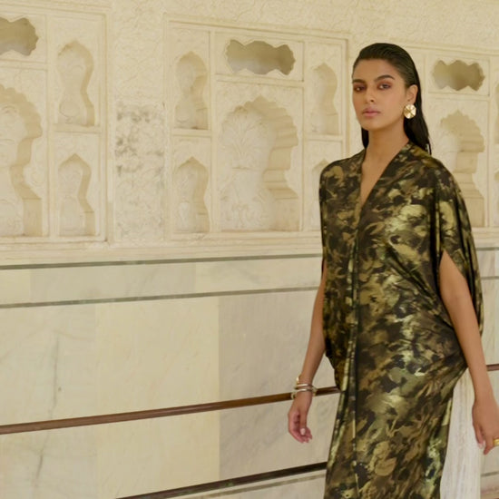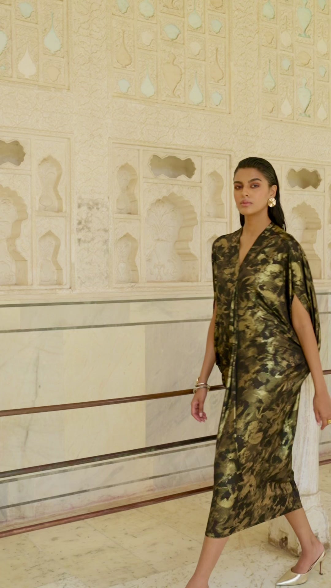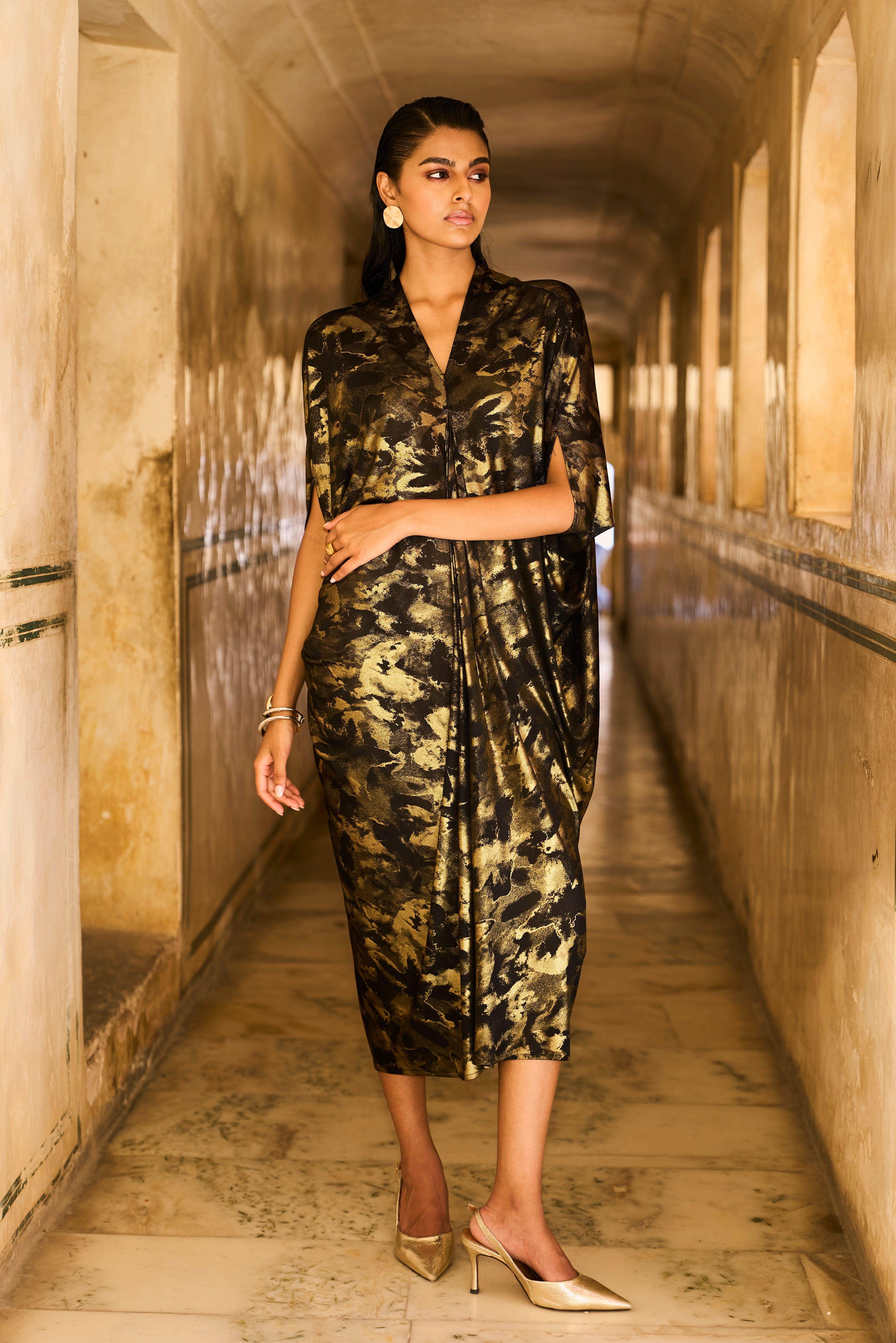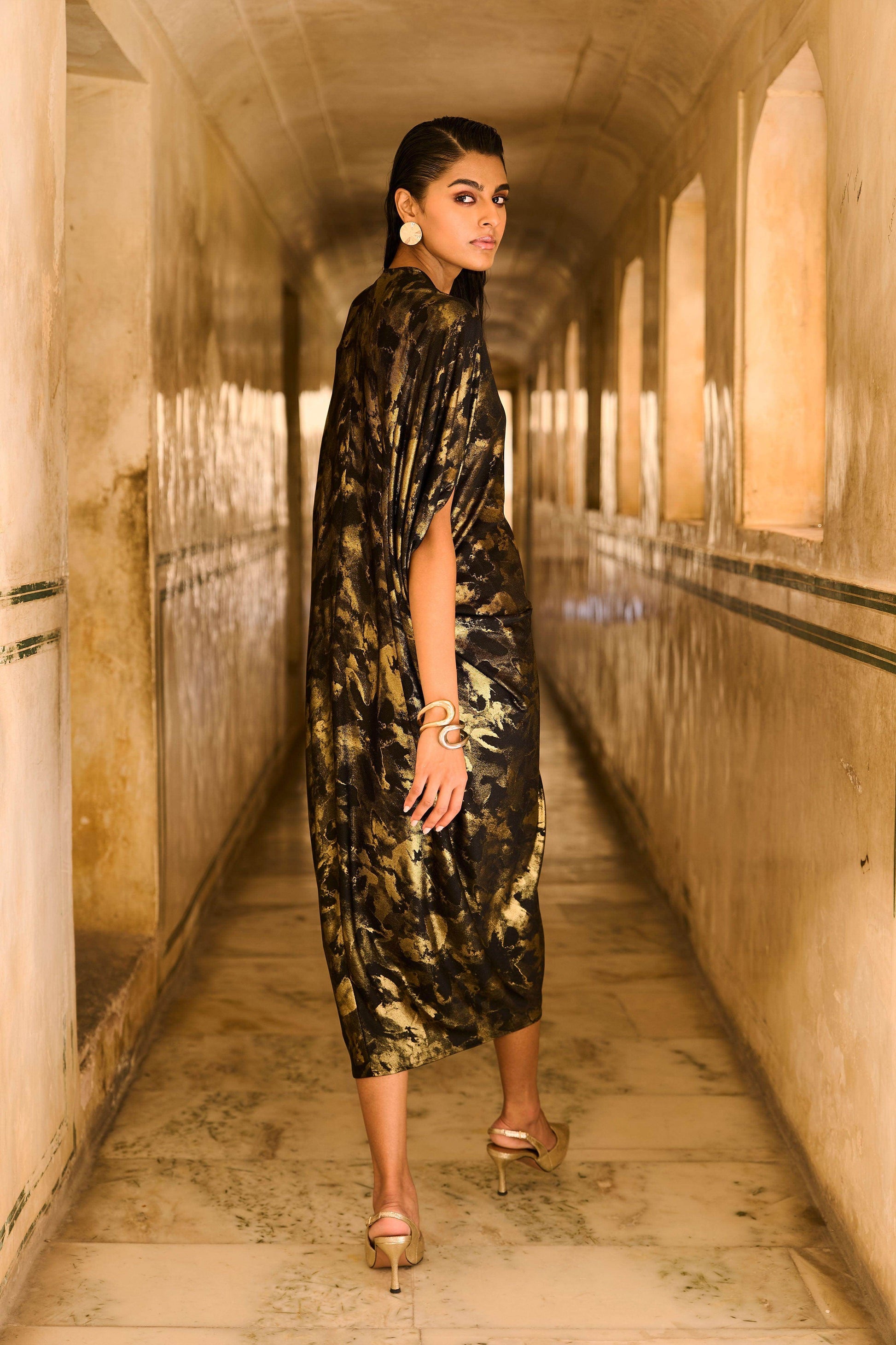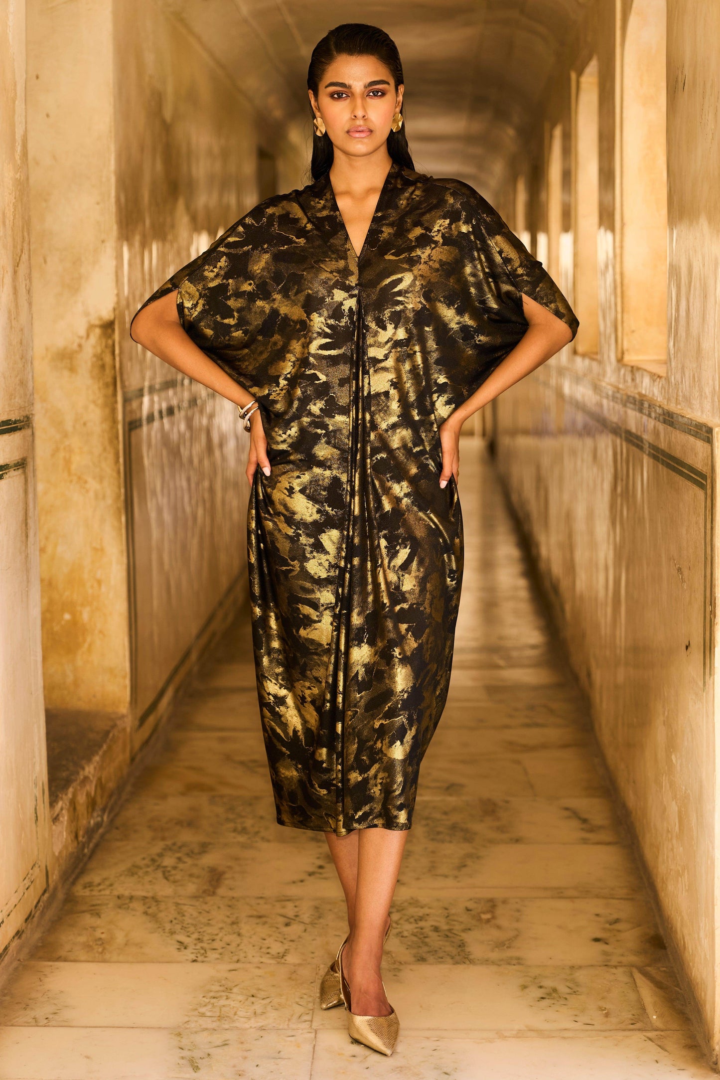 Drape cowl kaftan. All-over foil print in soft flowing knitted fabric. V-neck detail. Relaxed fit.