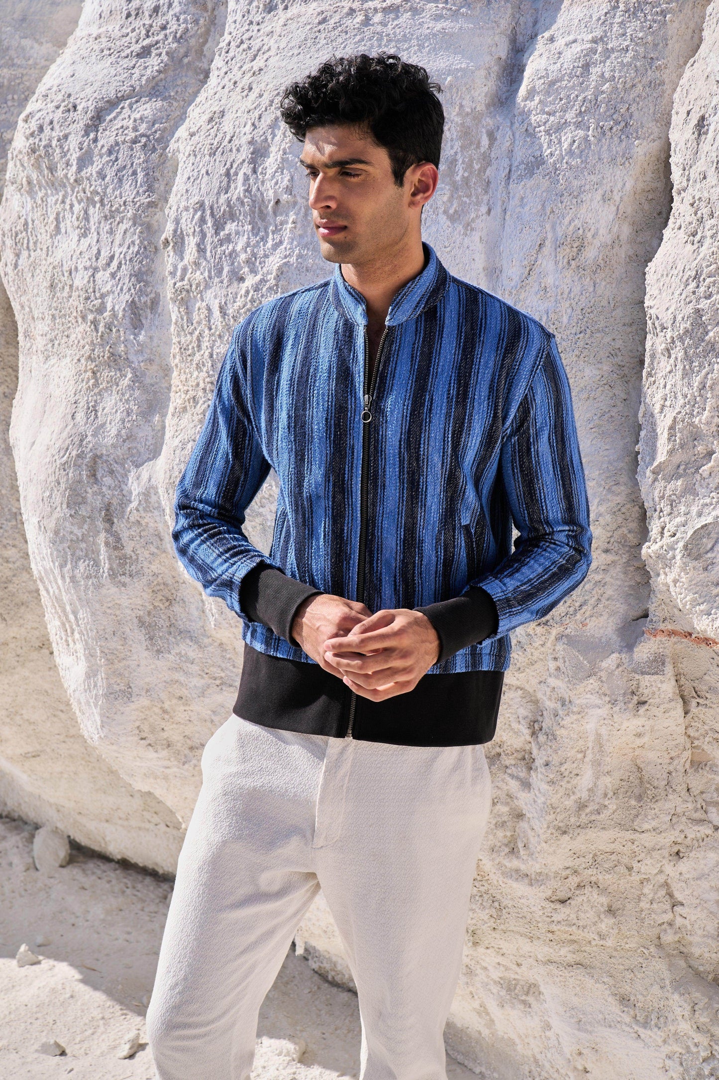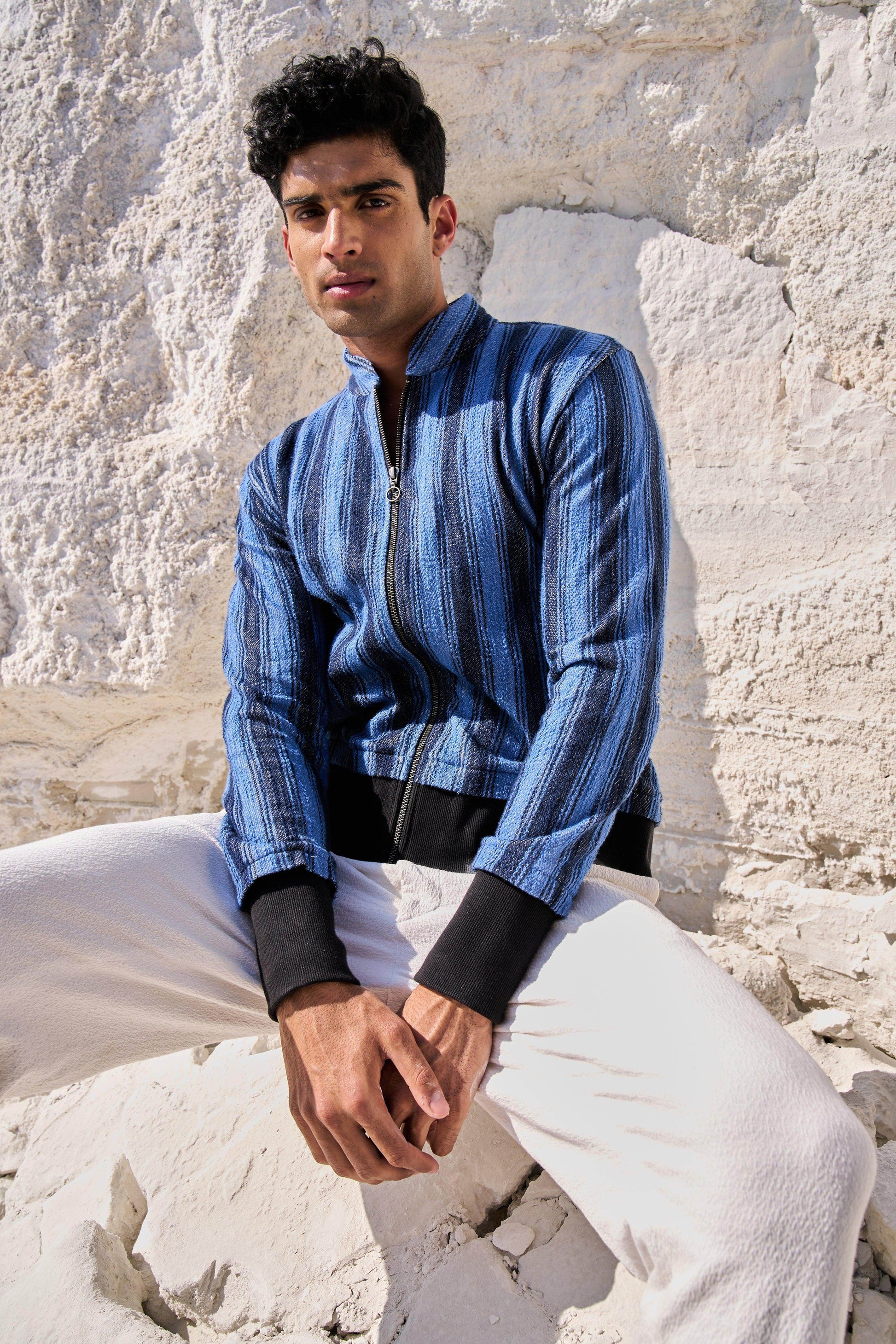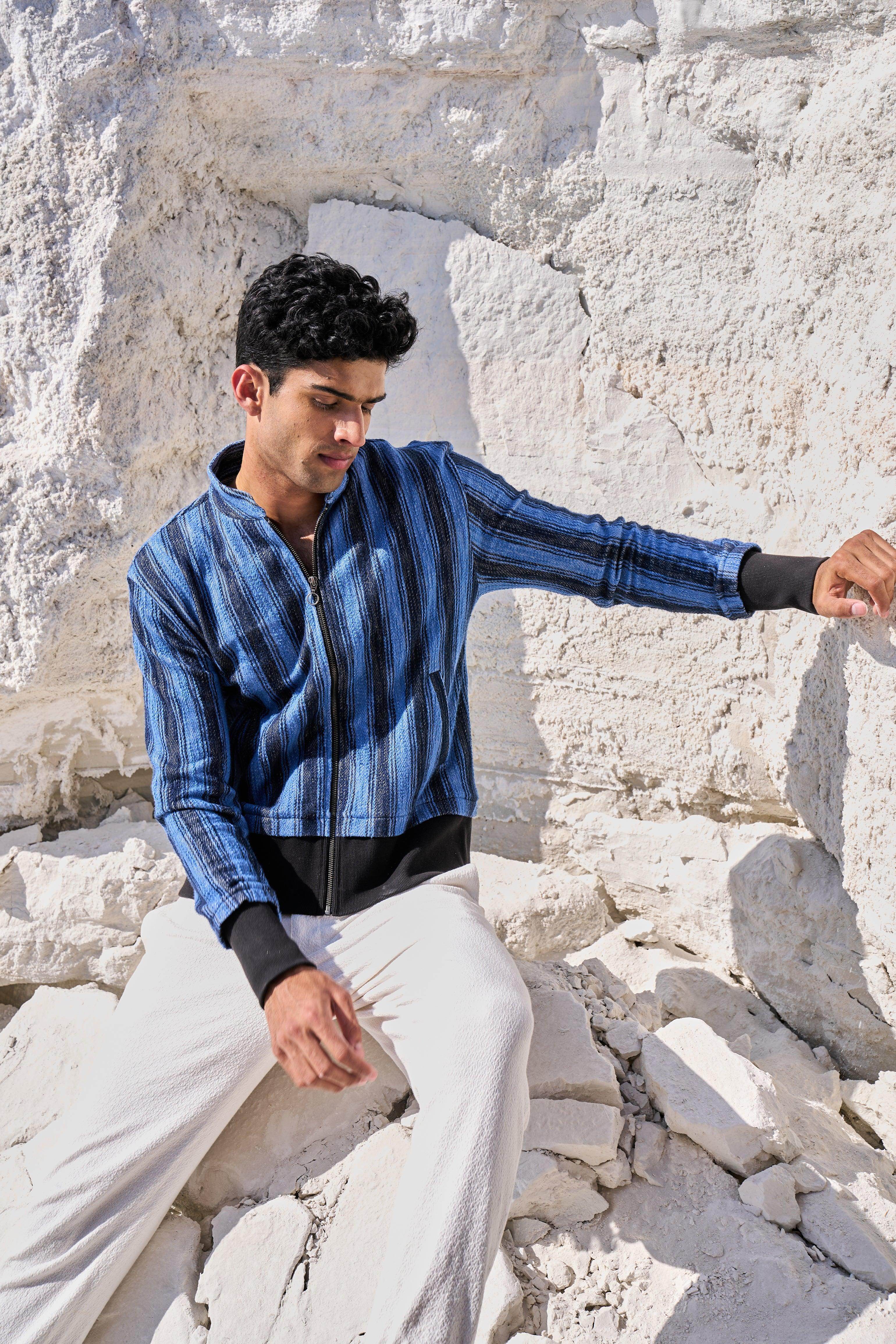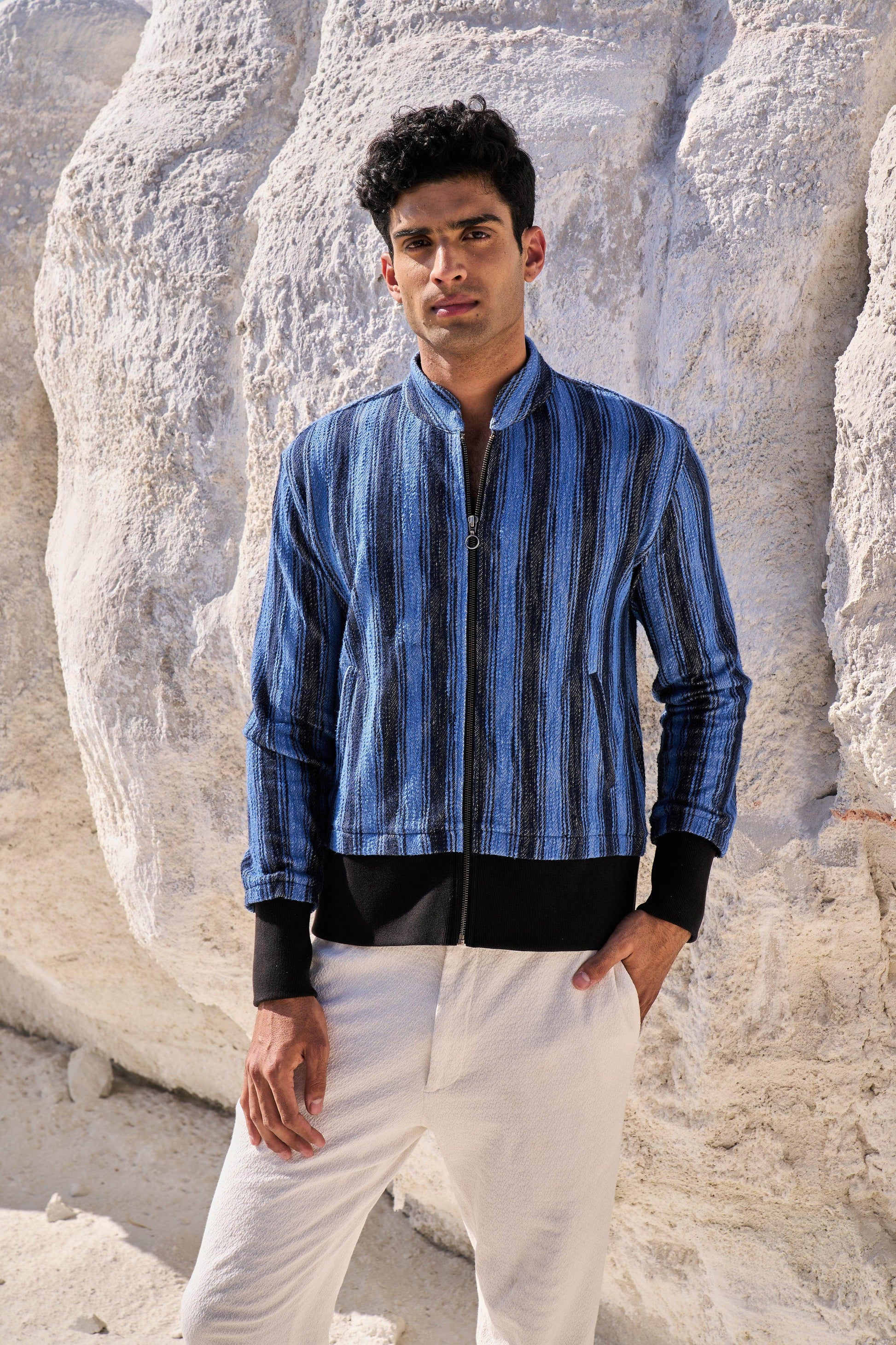 Textured bomber jacket in alternating stipes of blue and navy. Band collar. Contrast rib at hem and cuff. Metallic zip closure. Pockets at the front.