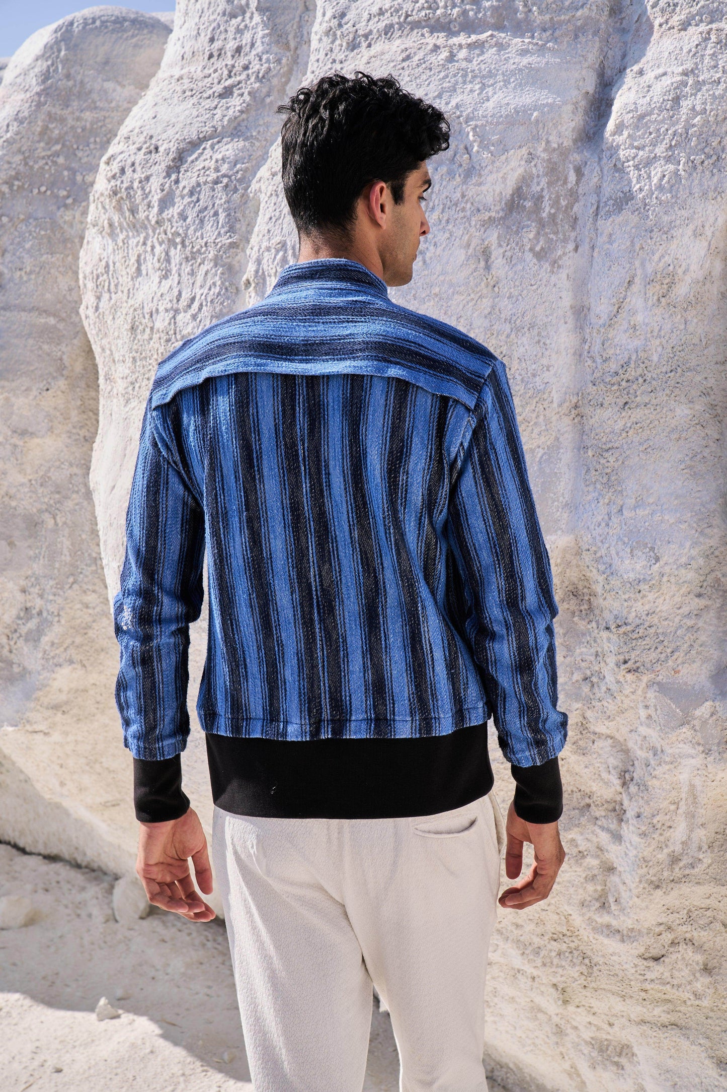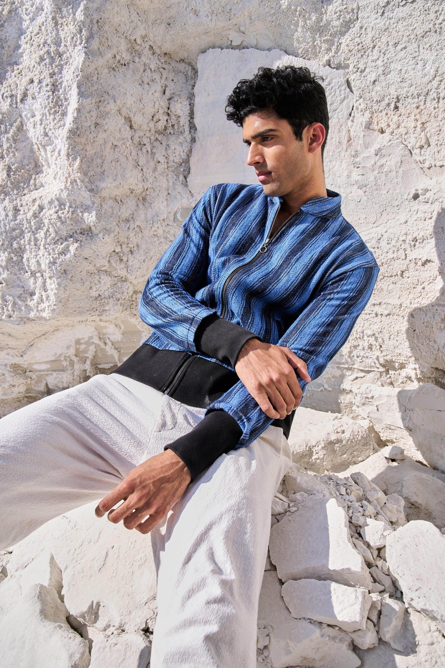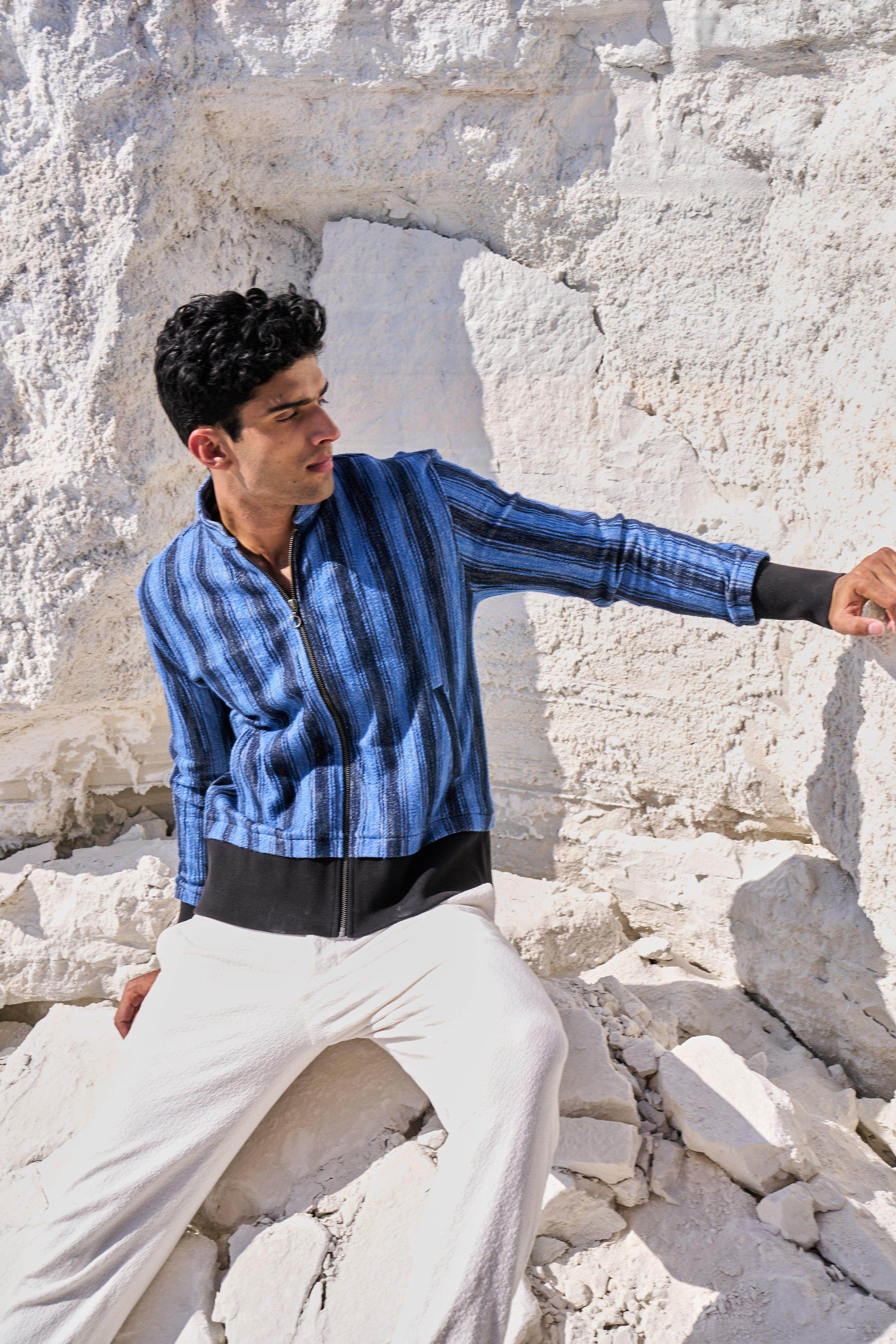 Textured bomber jacket in alternating stipes of blue and navy. Band collar. Contrast rib at hem and cuff. Metallic zip closure. Pockets at the front.