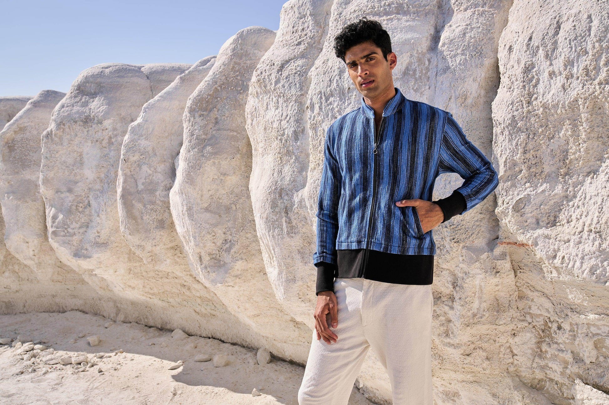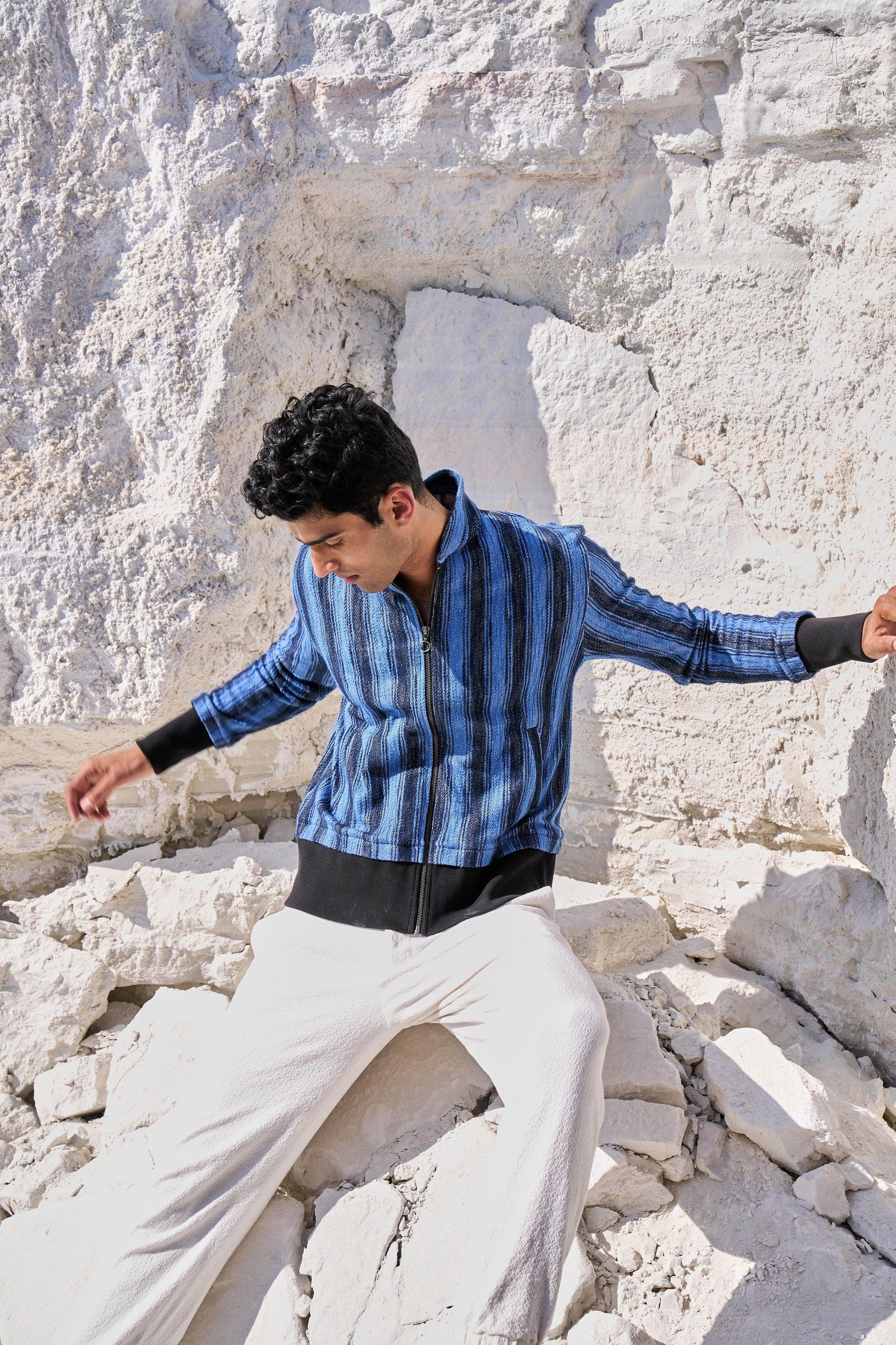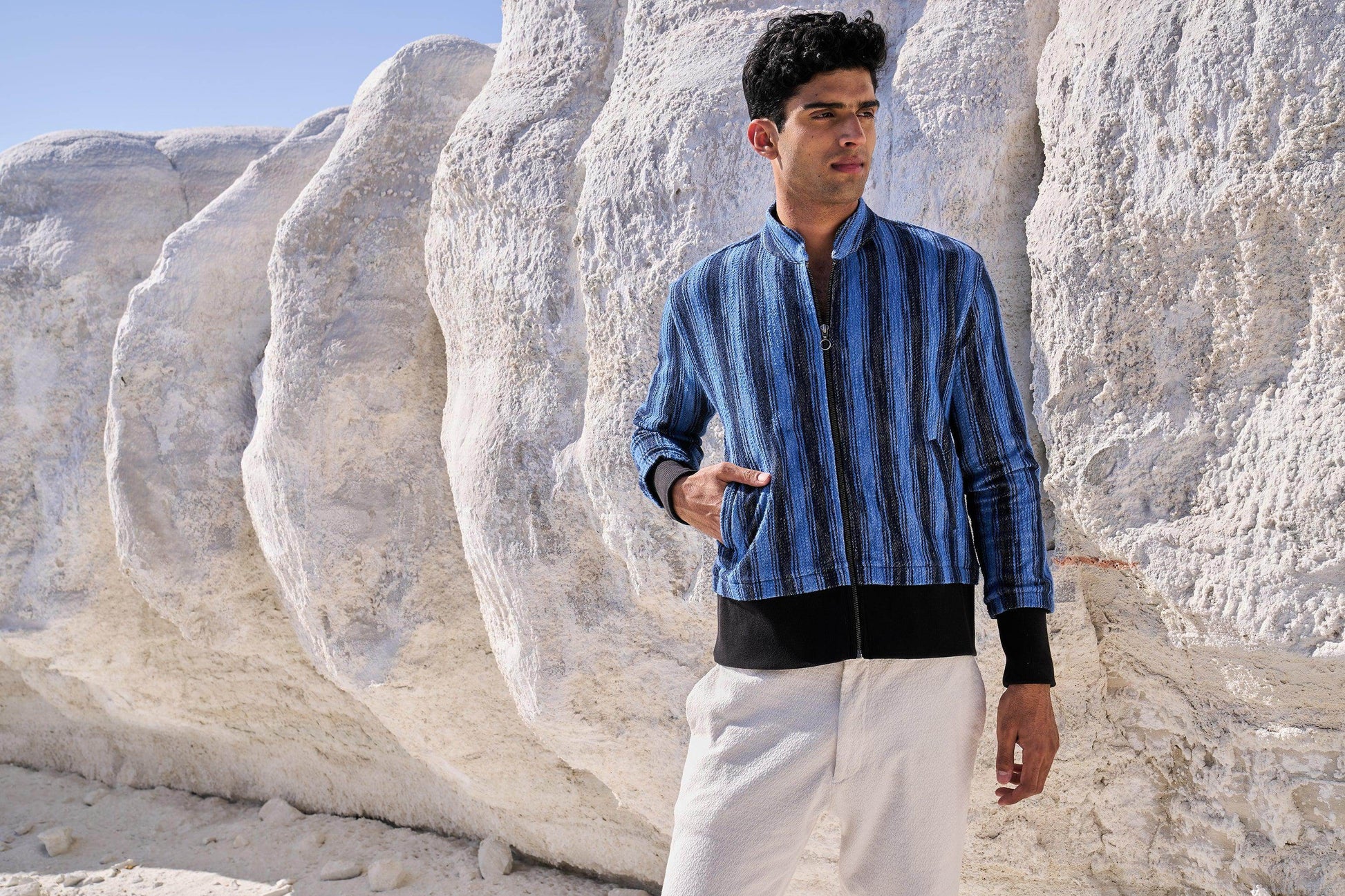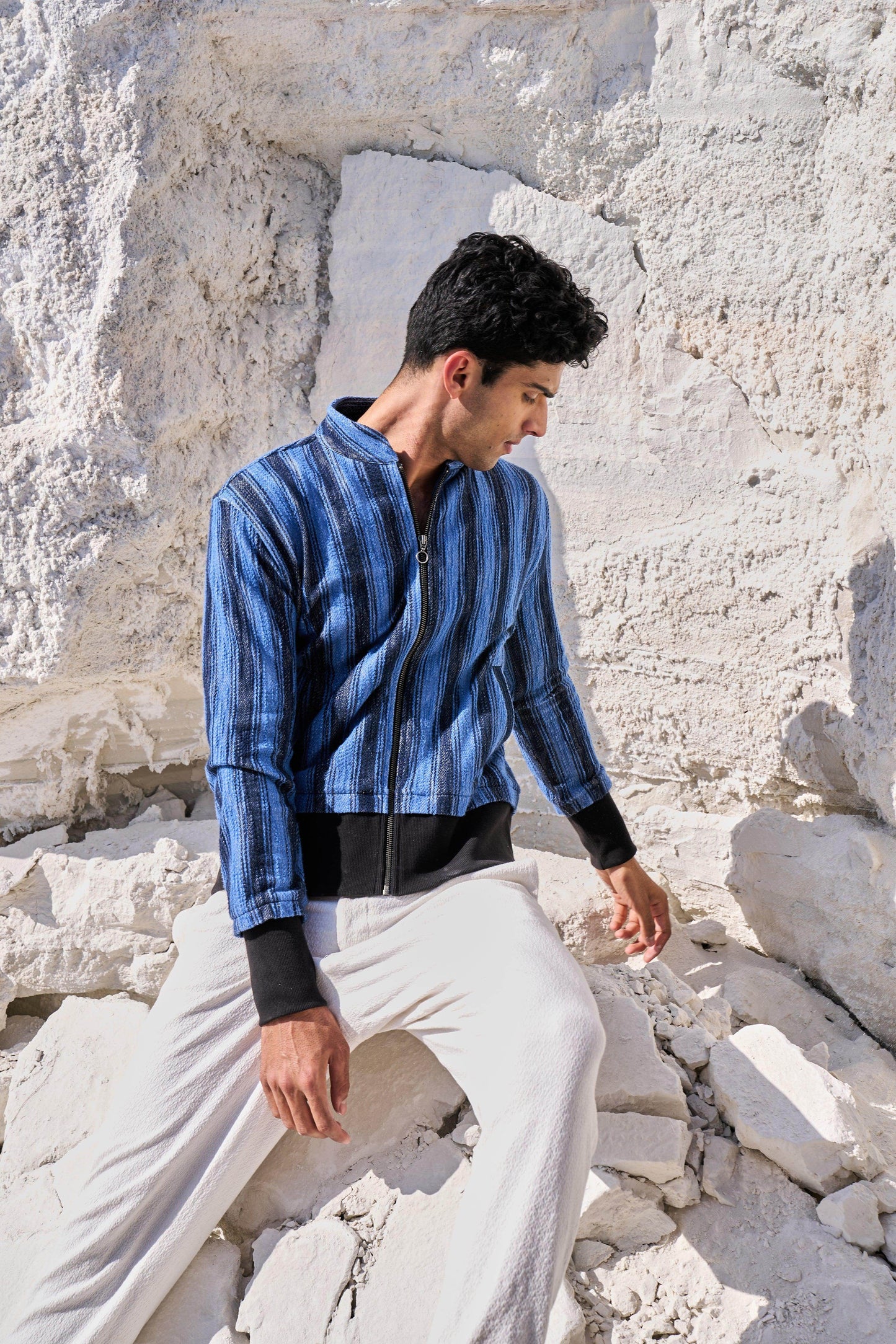 Textured bomber jacket in alternating stipes of blue and navy. Band collar. Contrast rib at hem and cuff. Metallic zip closure. Pockets at the front.
