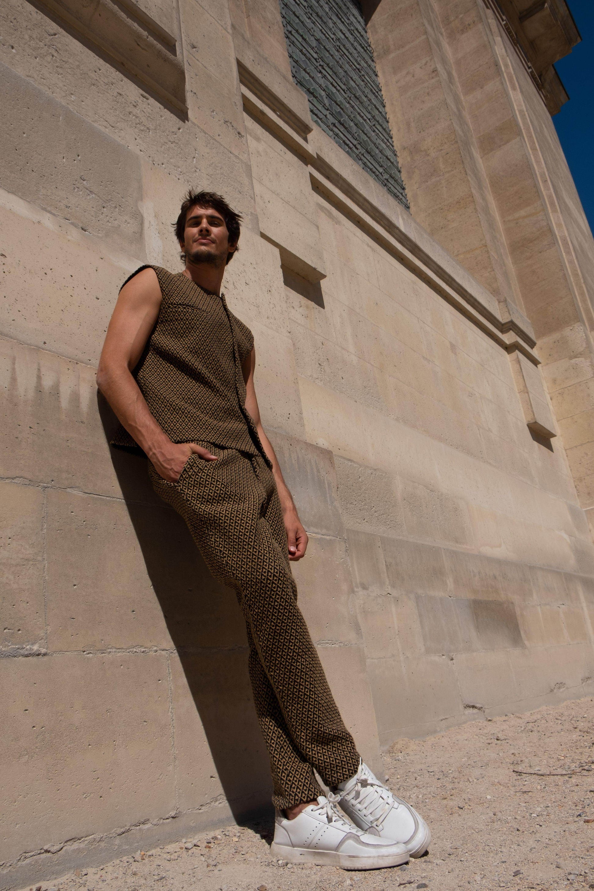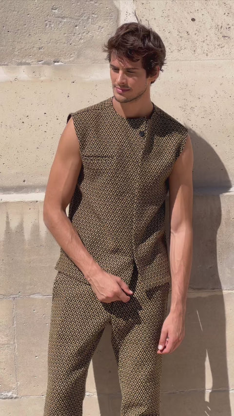 Round neck sleeveless jacket in geometric patterned jacquard fabric. Welt pocket on the wearer's right chest. Off center button closure, concealed placket.