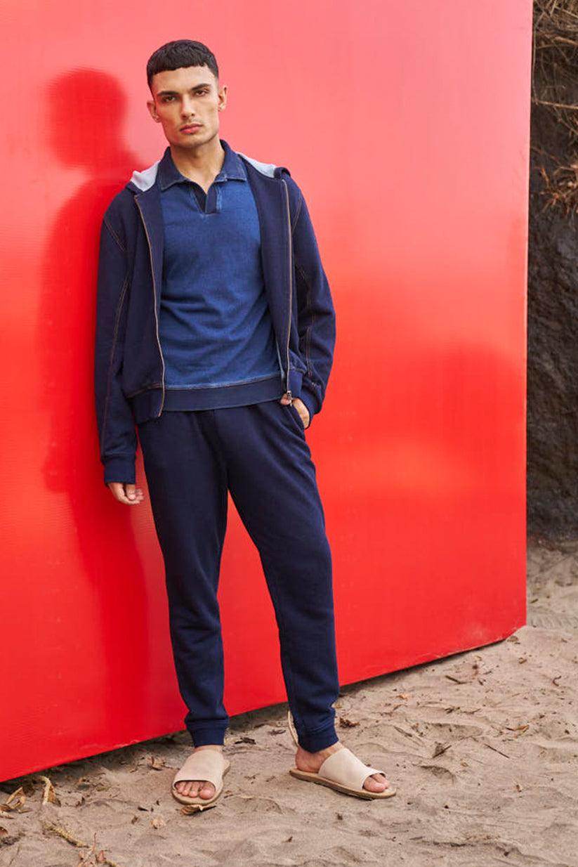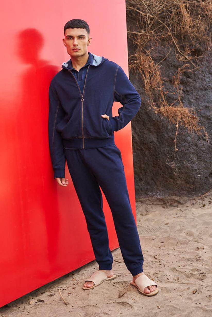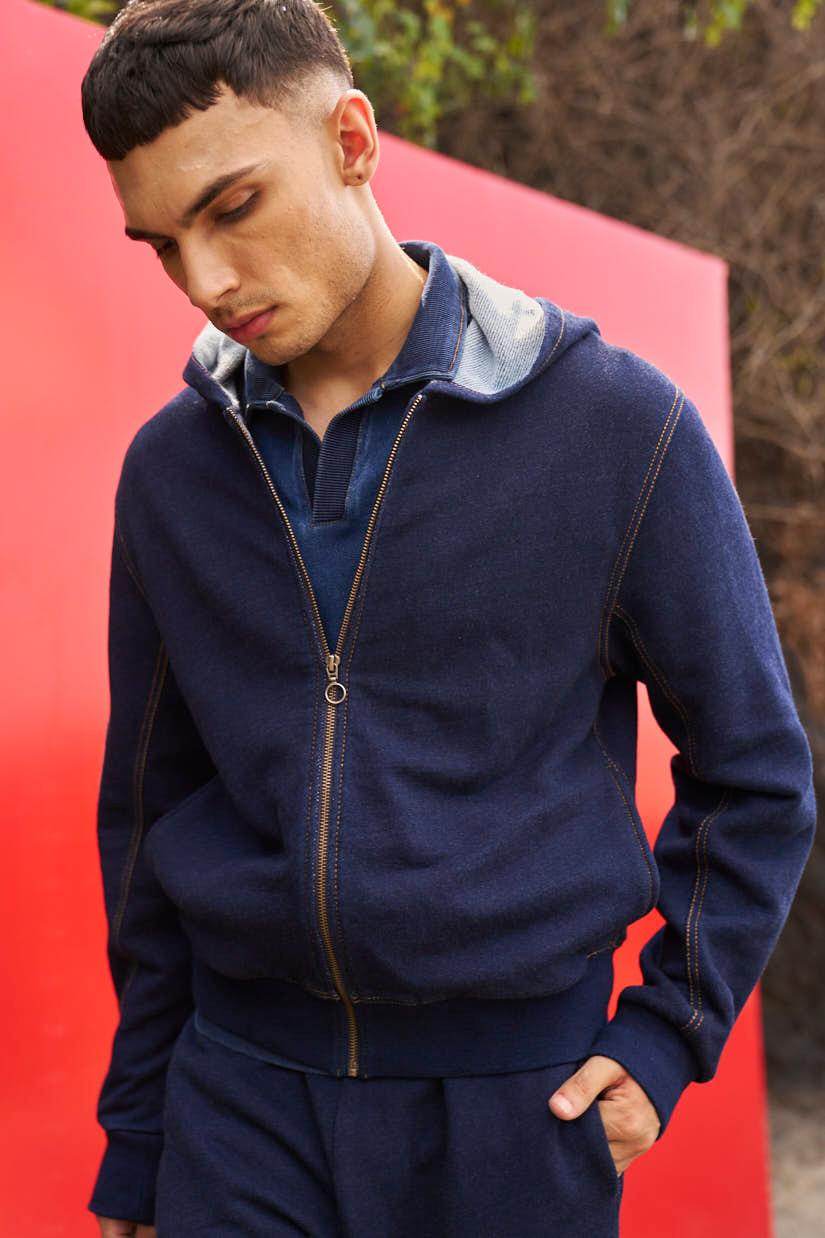 Zip front hoodie in knitted indigo terry. Contrast jeanswear inspired stitches. The hoodie has pockets in the sides. Rib detailing on the bottom and sleeve cuff. Made with true rope dyed indigo. Each piece is washed separately and is unique and will vary in colour with each successive wash. Please expect slight colour variations, it adds to the beauty of the piece!