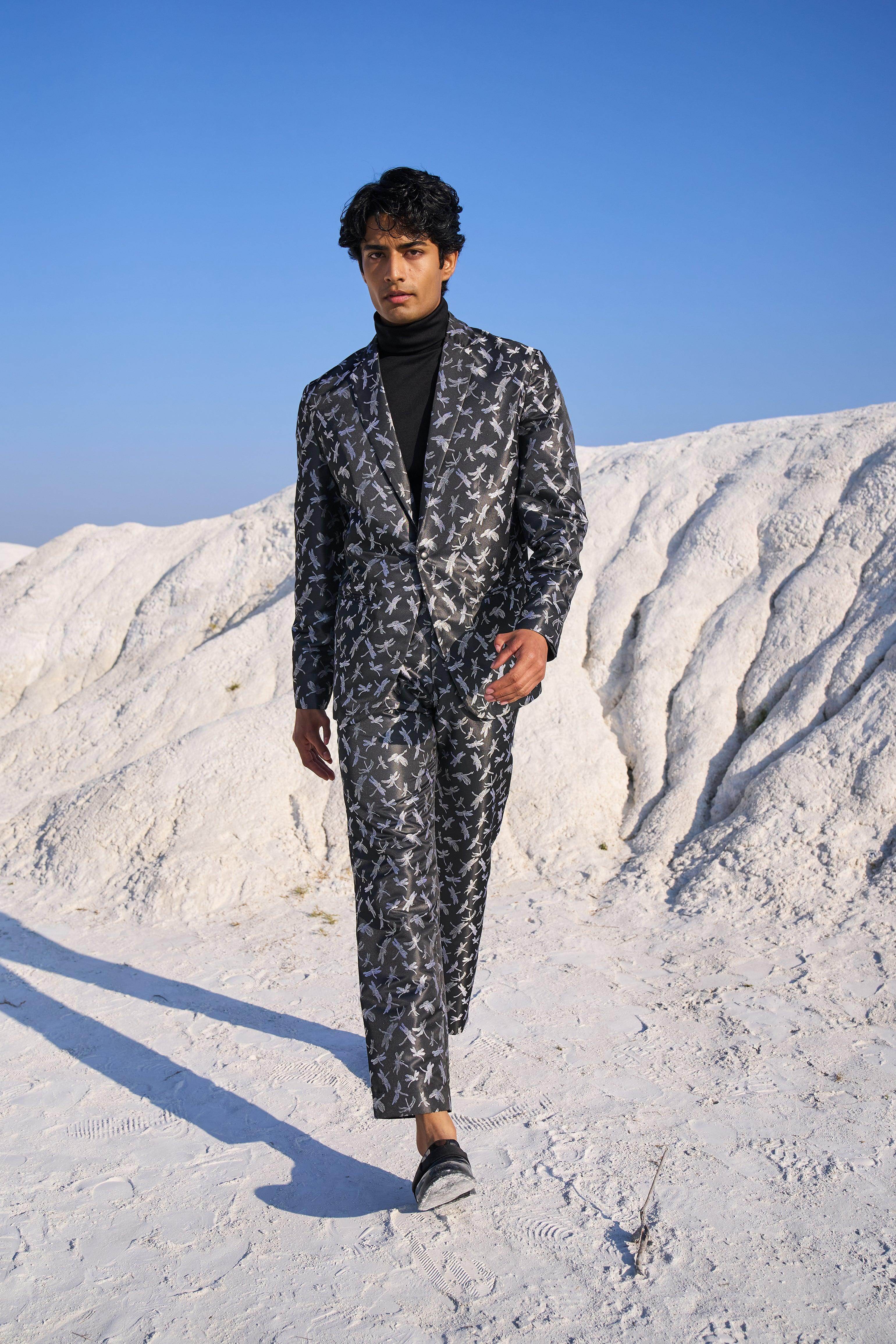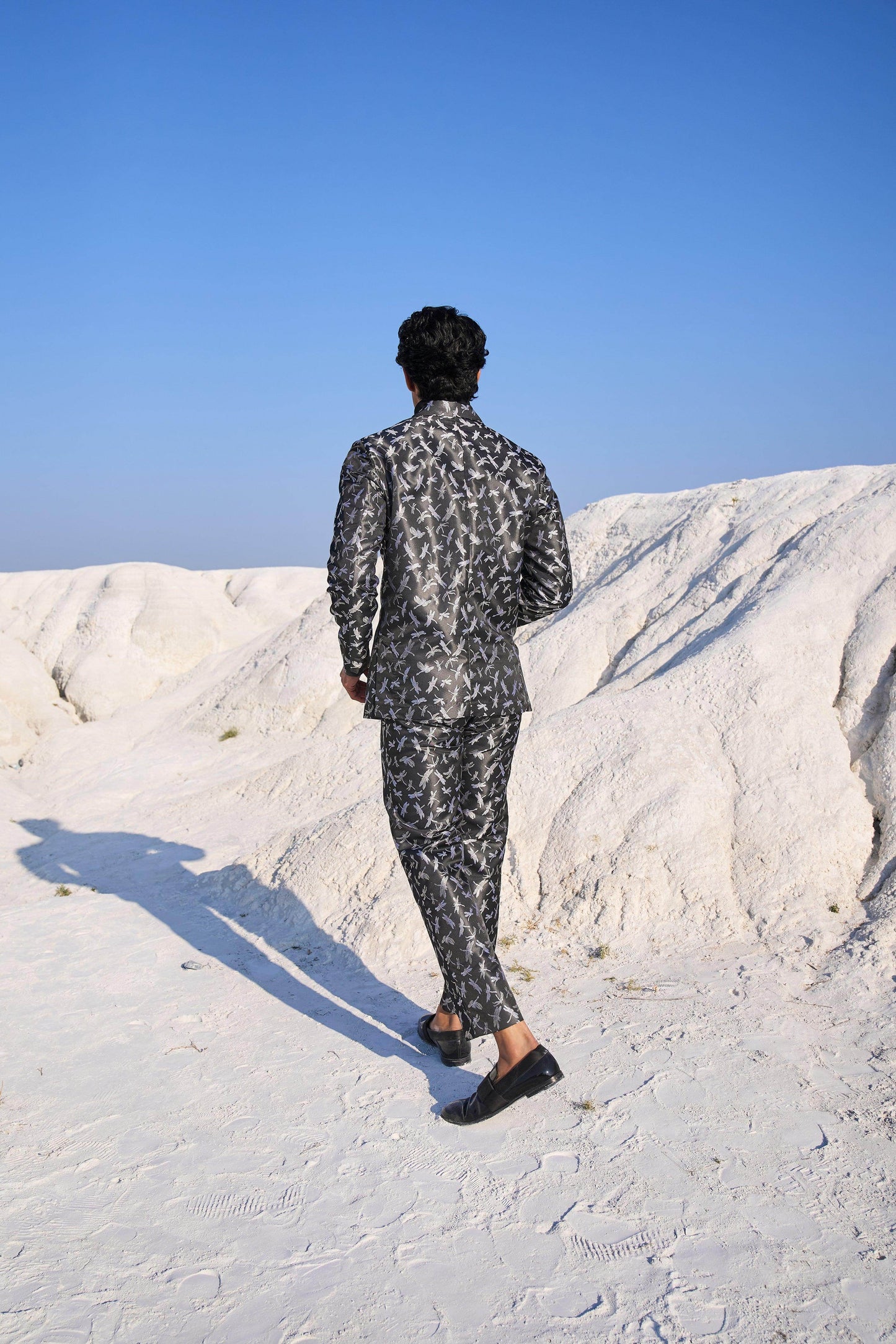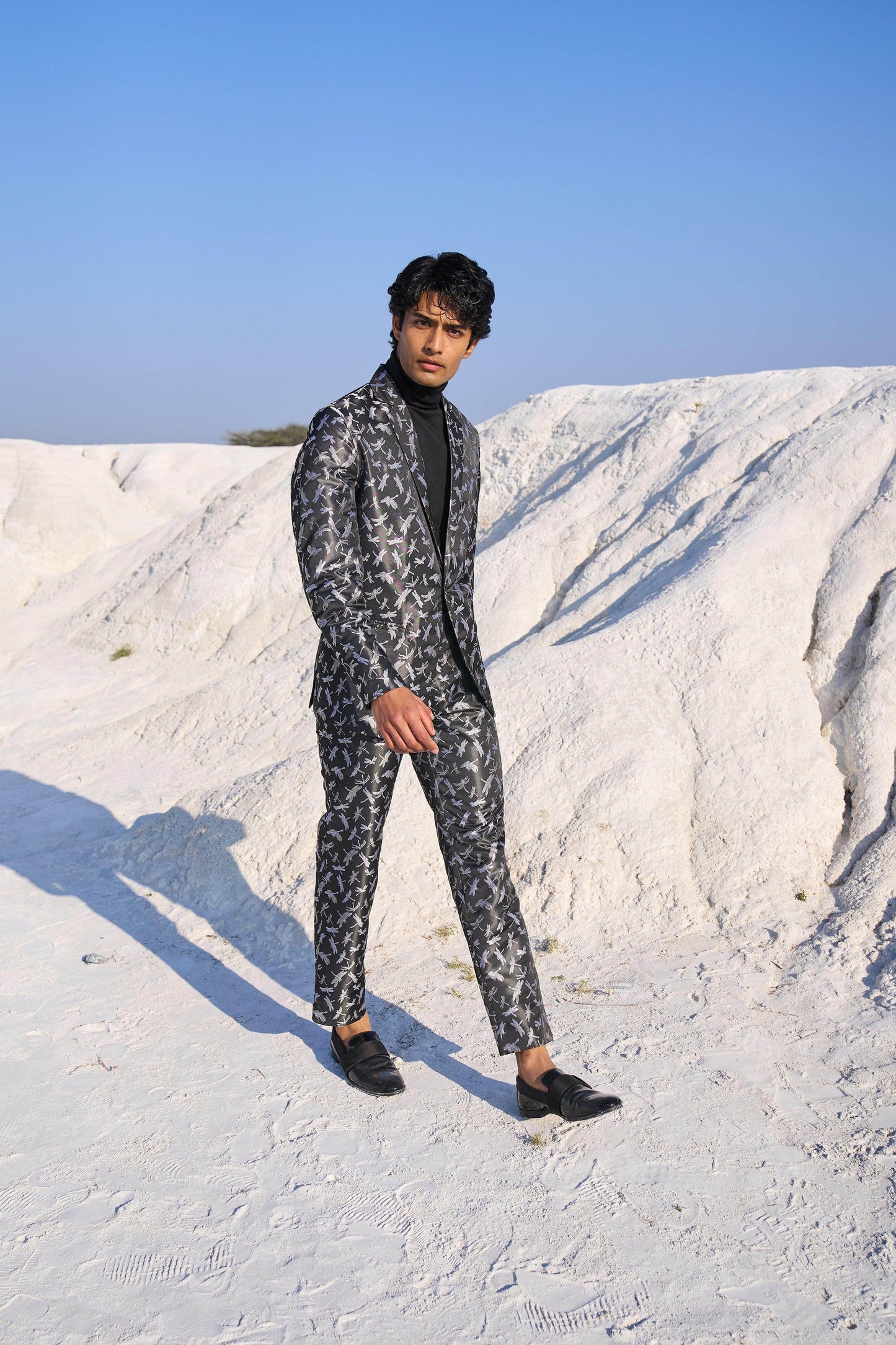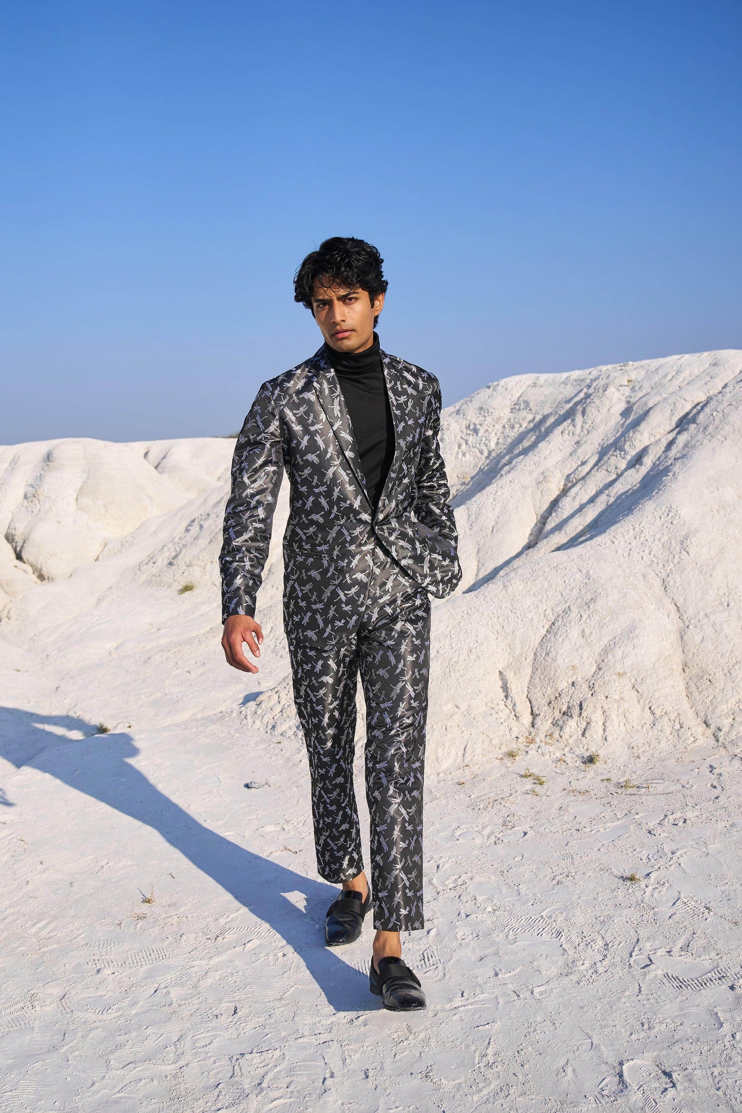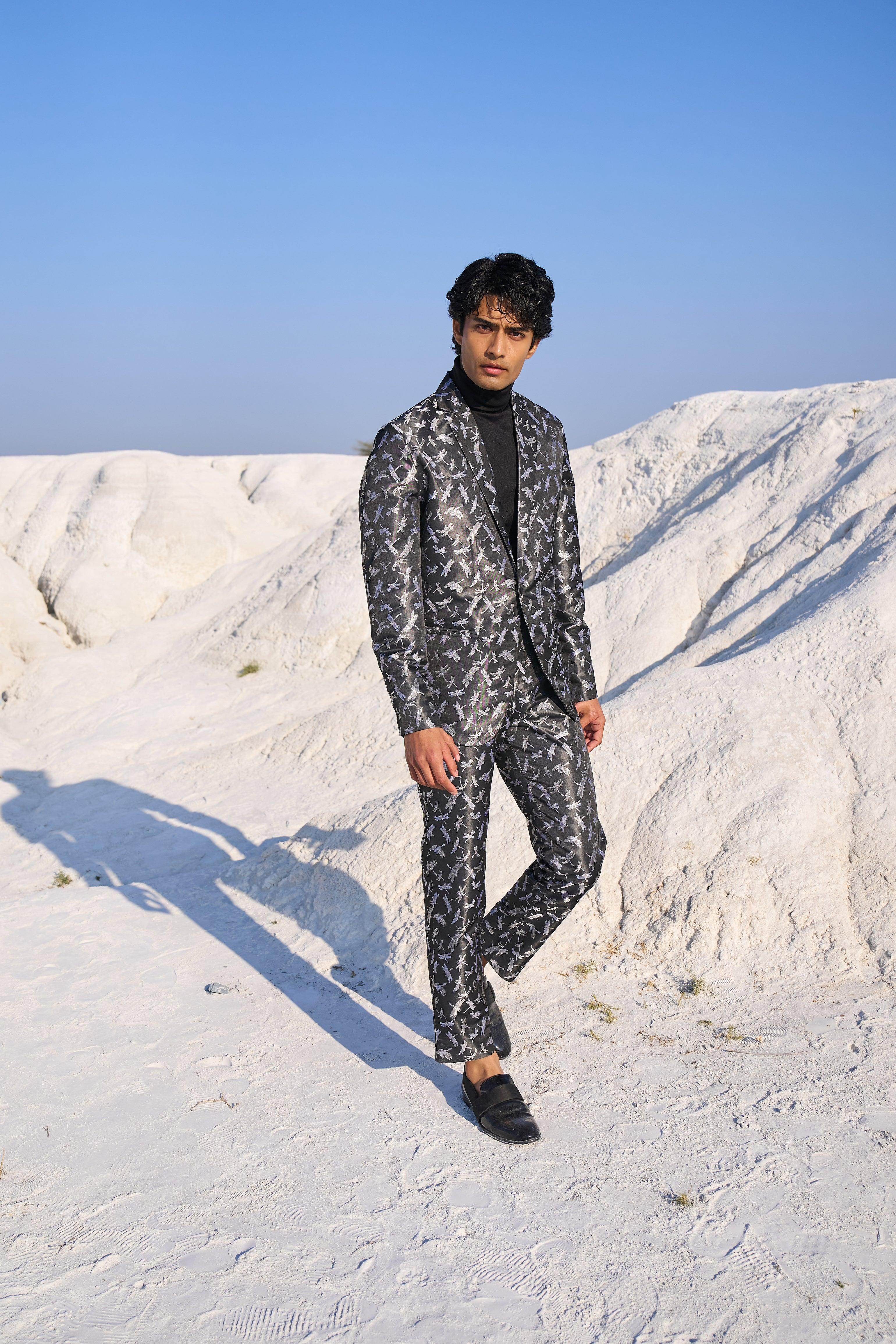 Dragon fly patterned black blazer jacket in soft brocade style jacquard. Single button closure and pockets at the front.