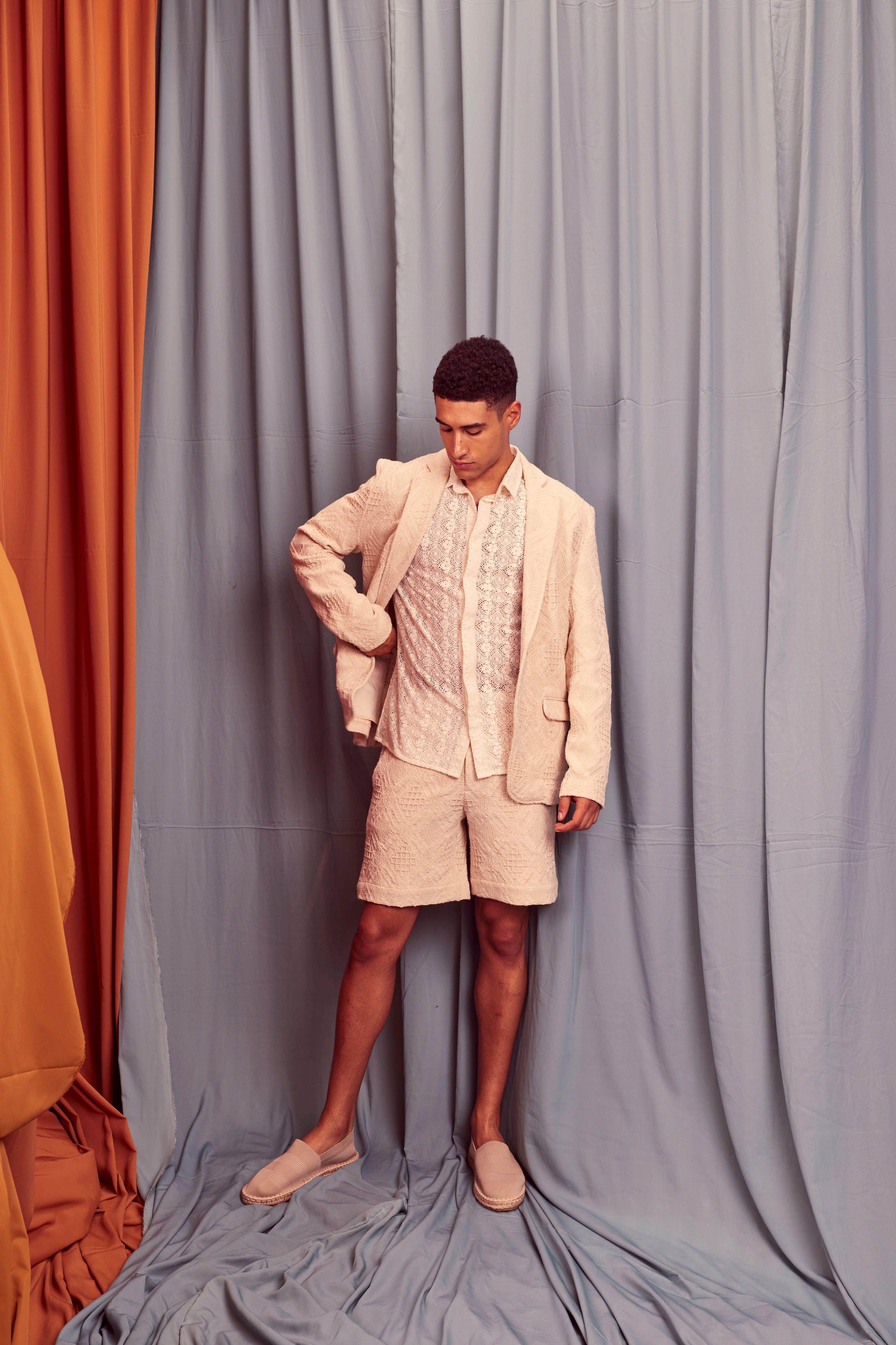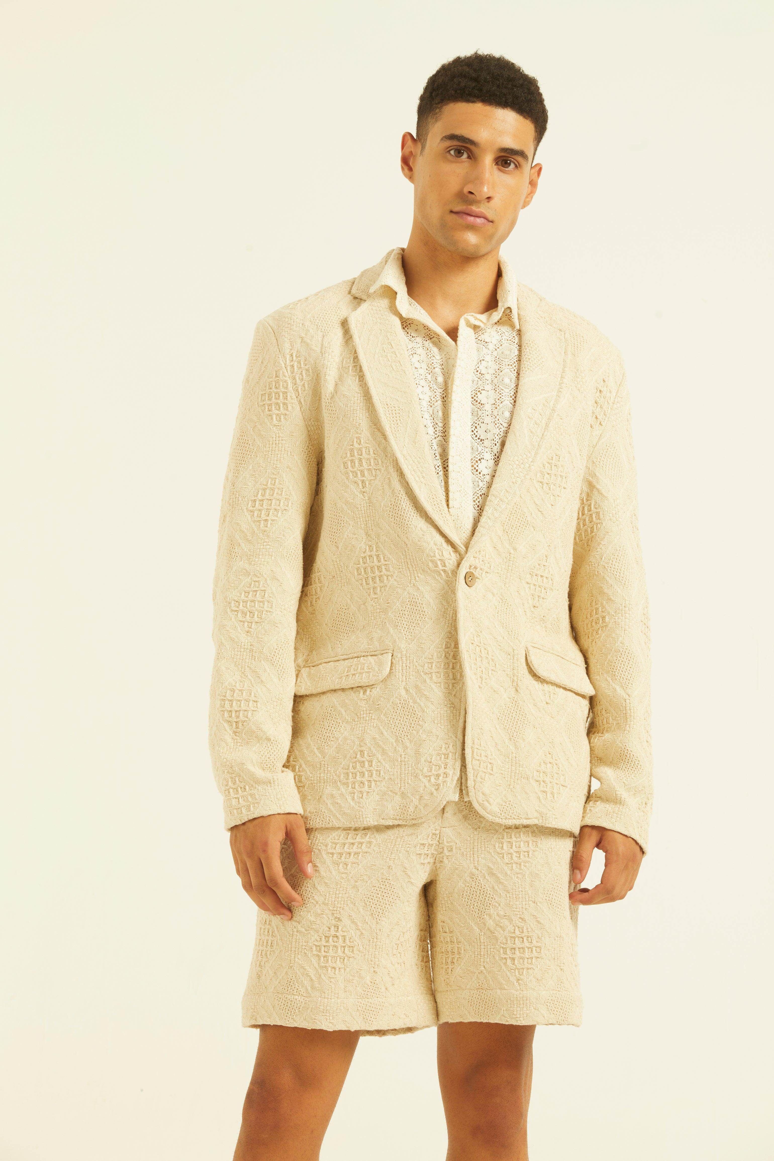 Single-button summer suit jacket made of patterned jacquard fabric. Lapels and pockets at the front.
