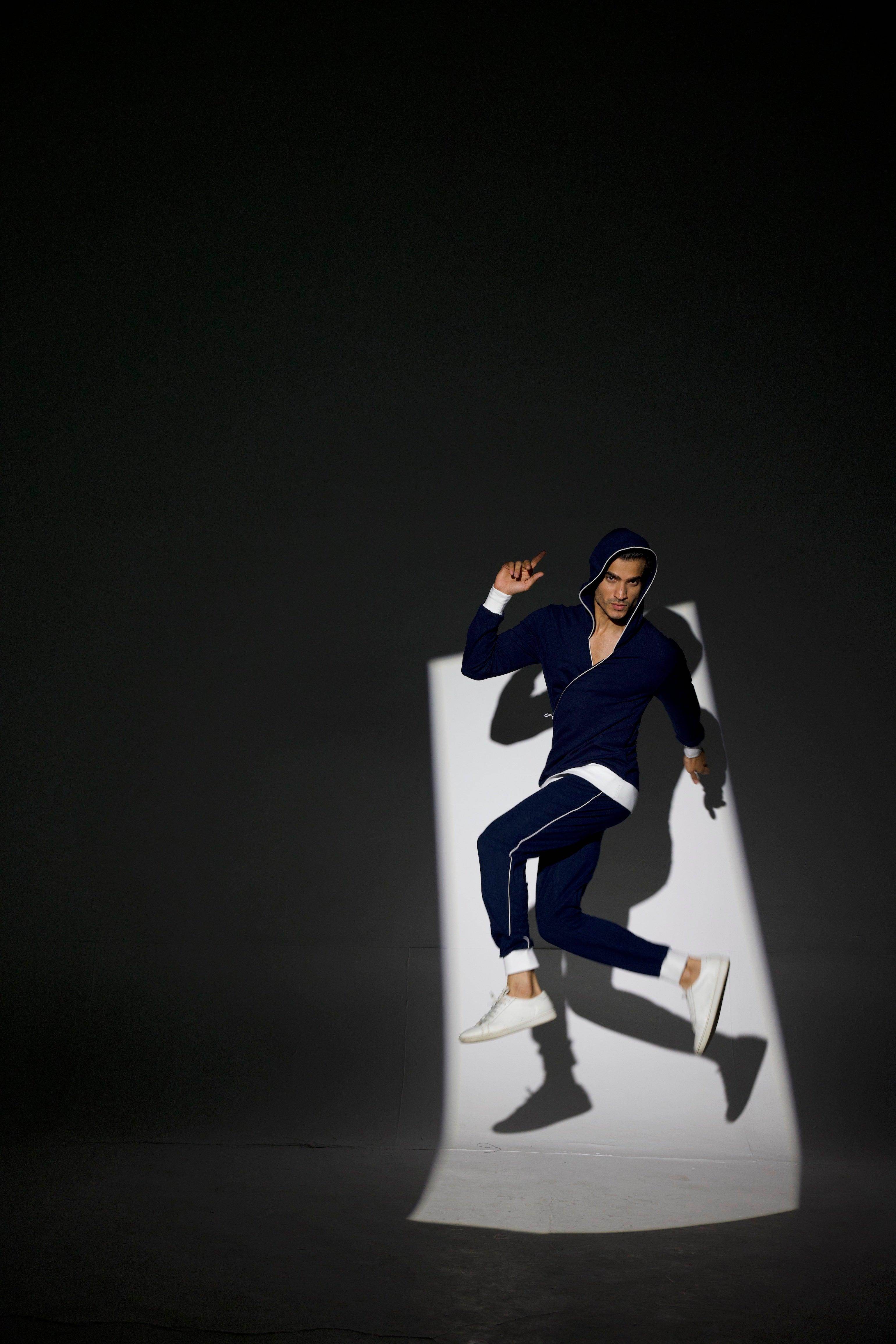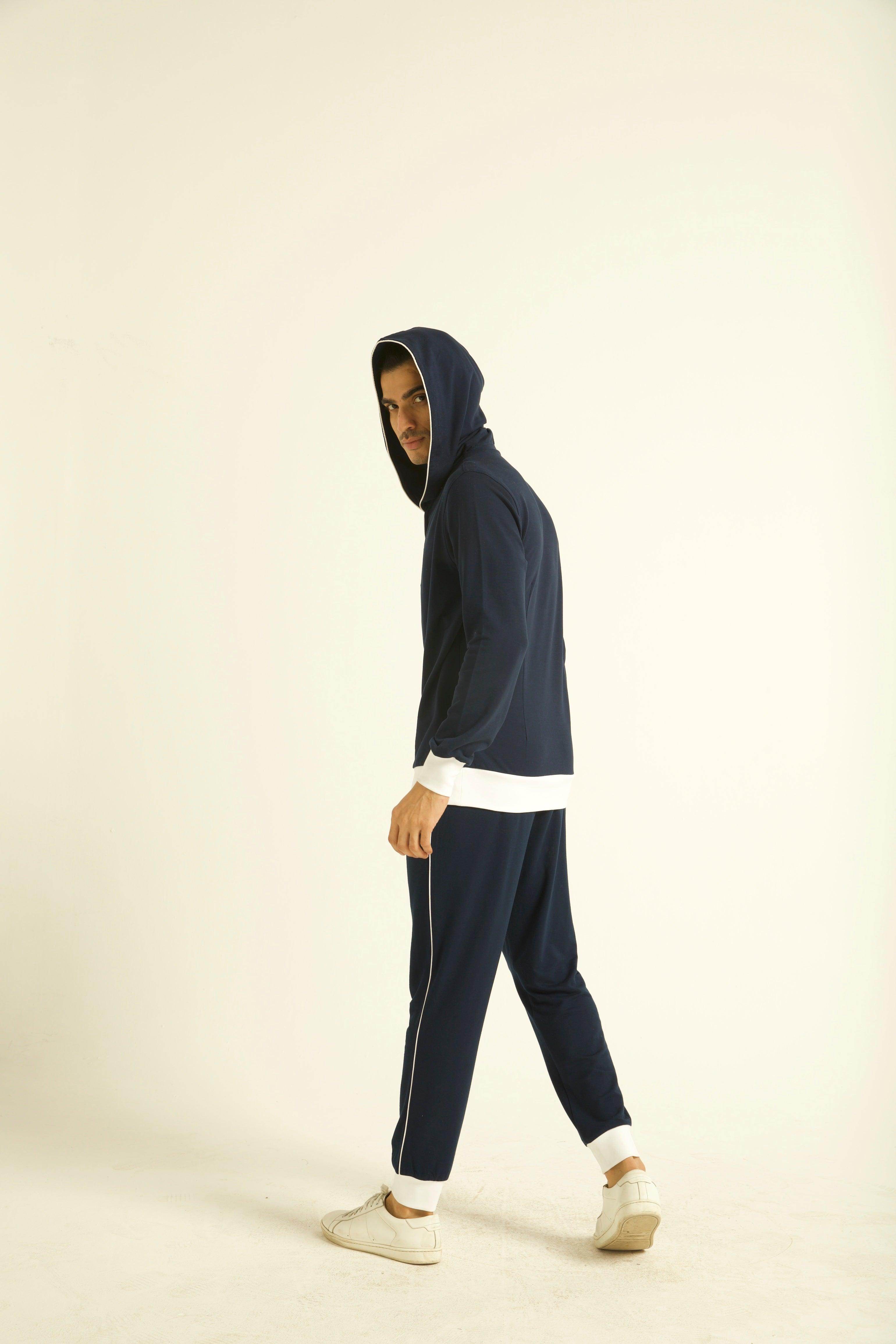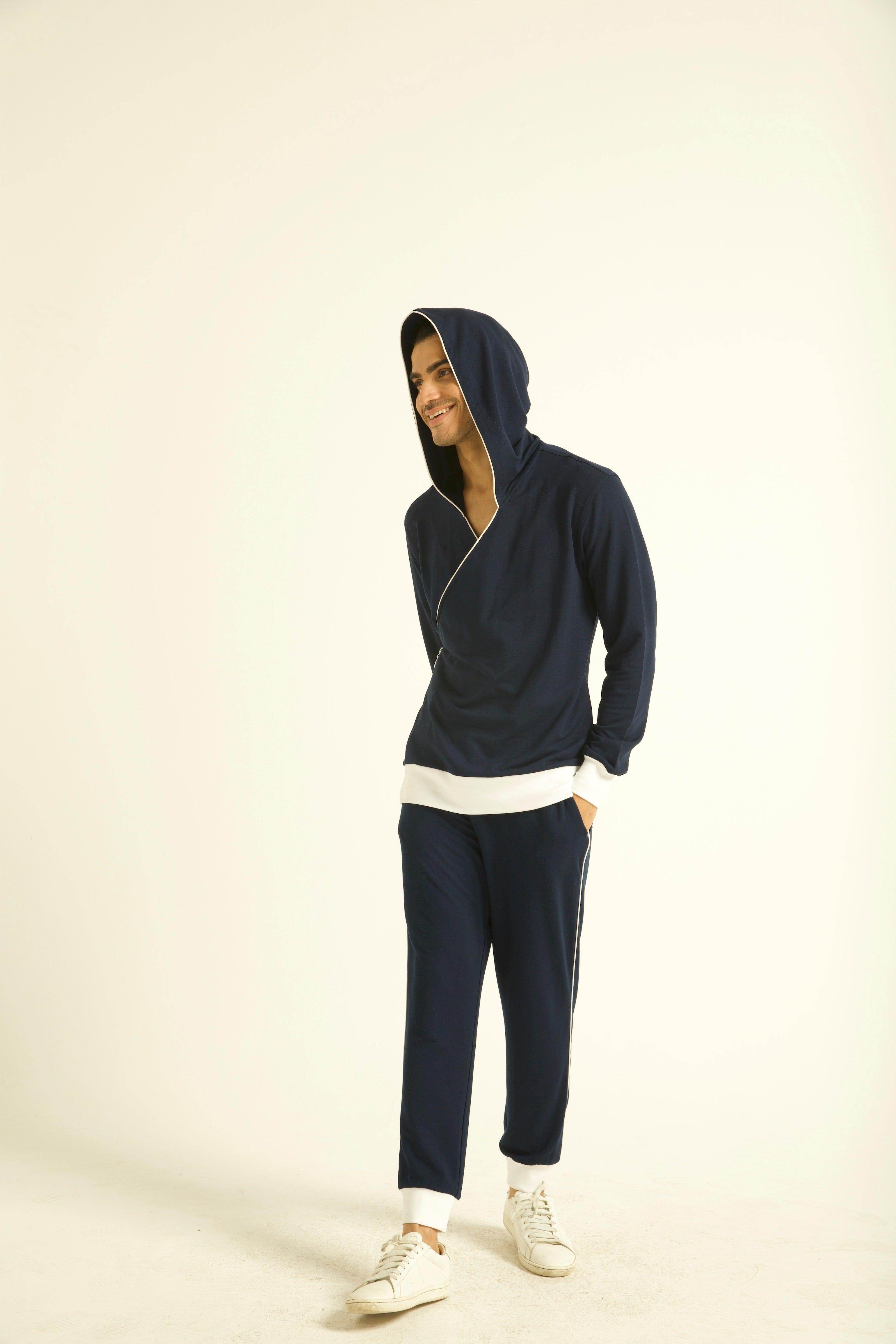 Sustainably sourced modal french terry hoodie in navy. Overlap detail in the front. Contrast piping, zipper and rib at the hem.