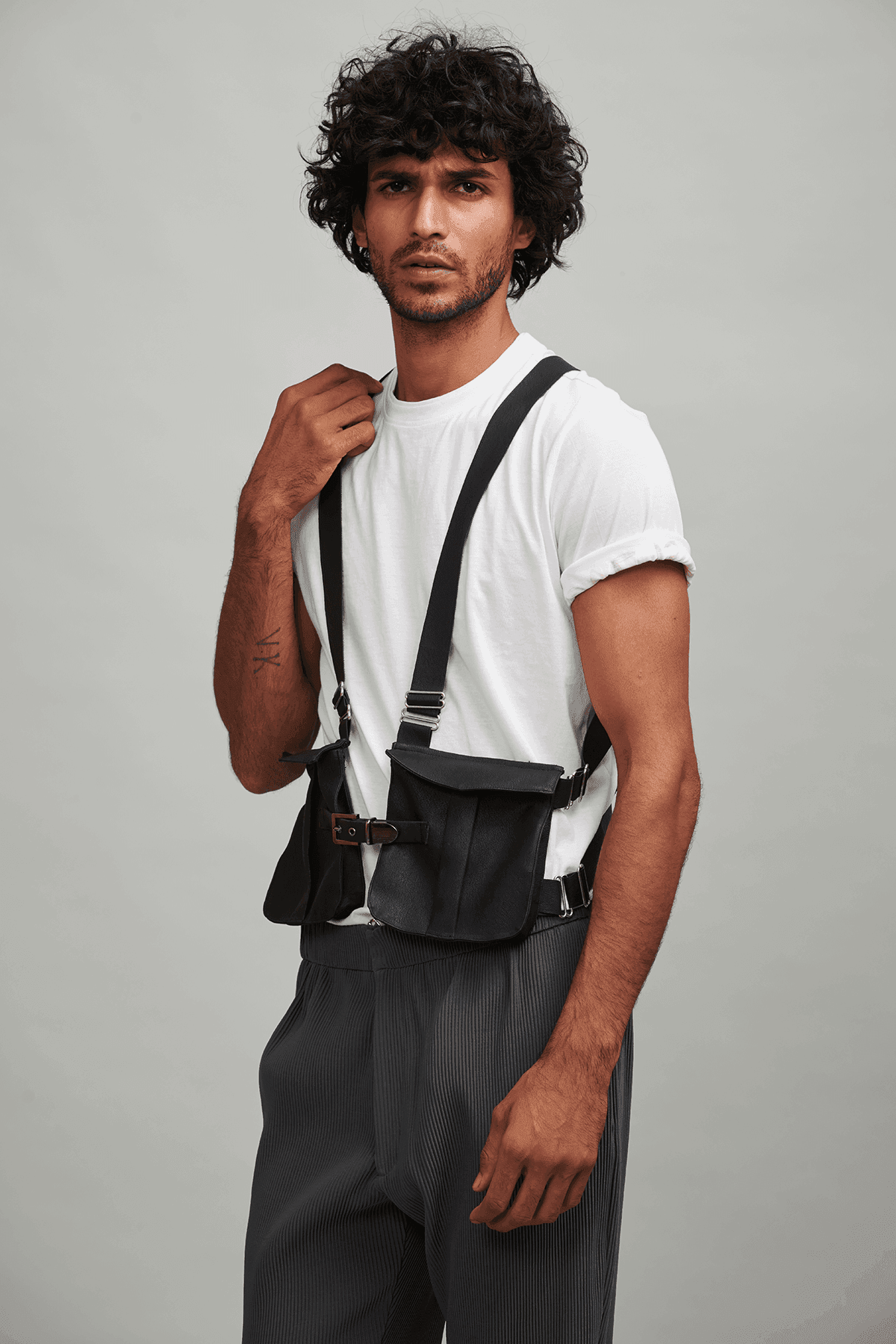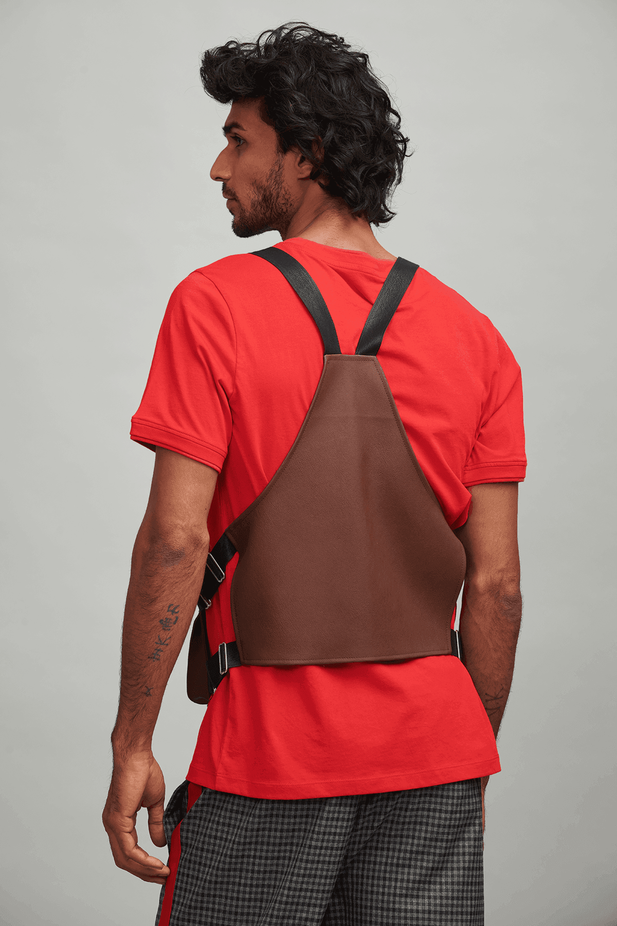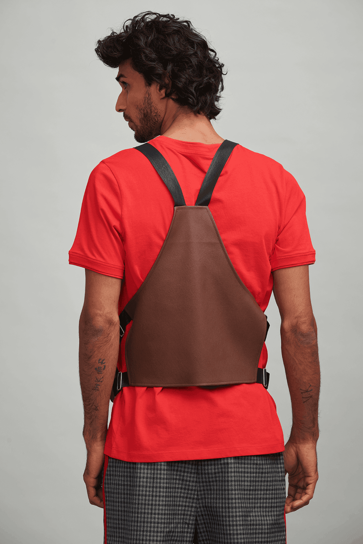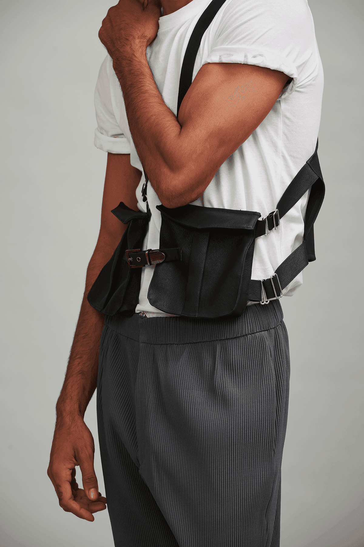 Utility harness made of vegan leather. Ideal for travel, toolkits, or everyday work. 2 large sized pockets in the front, adjustable straps on the shoulder and waist. Buckle front.