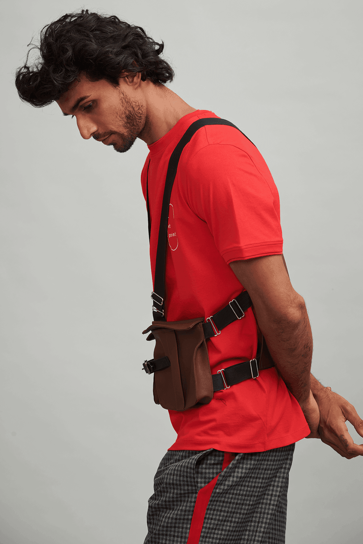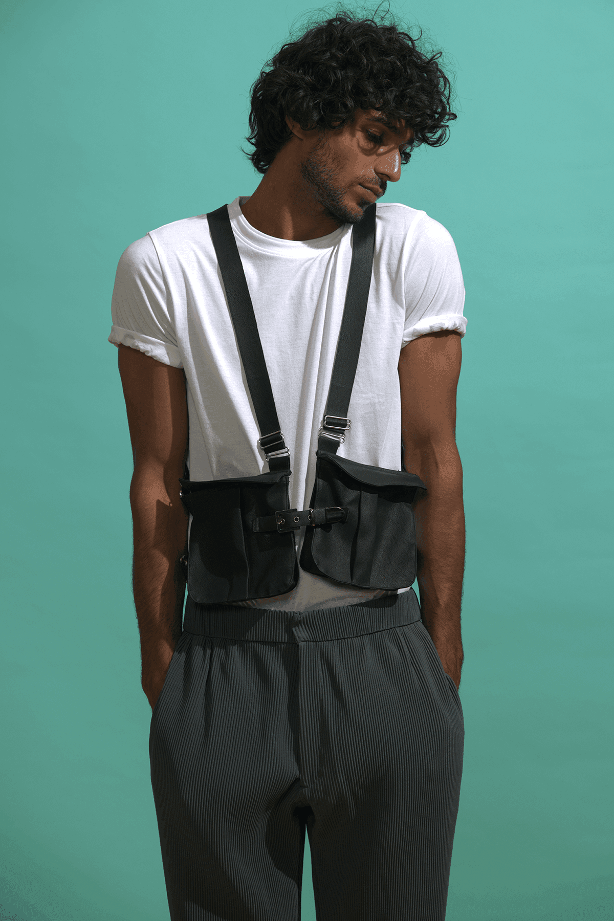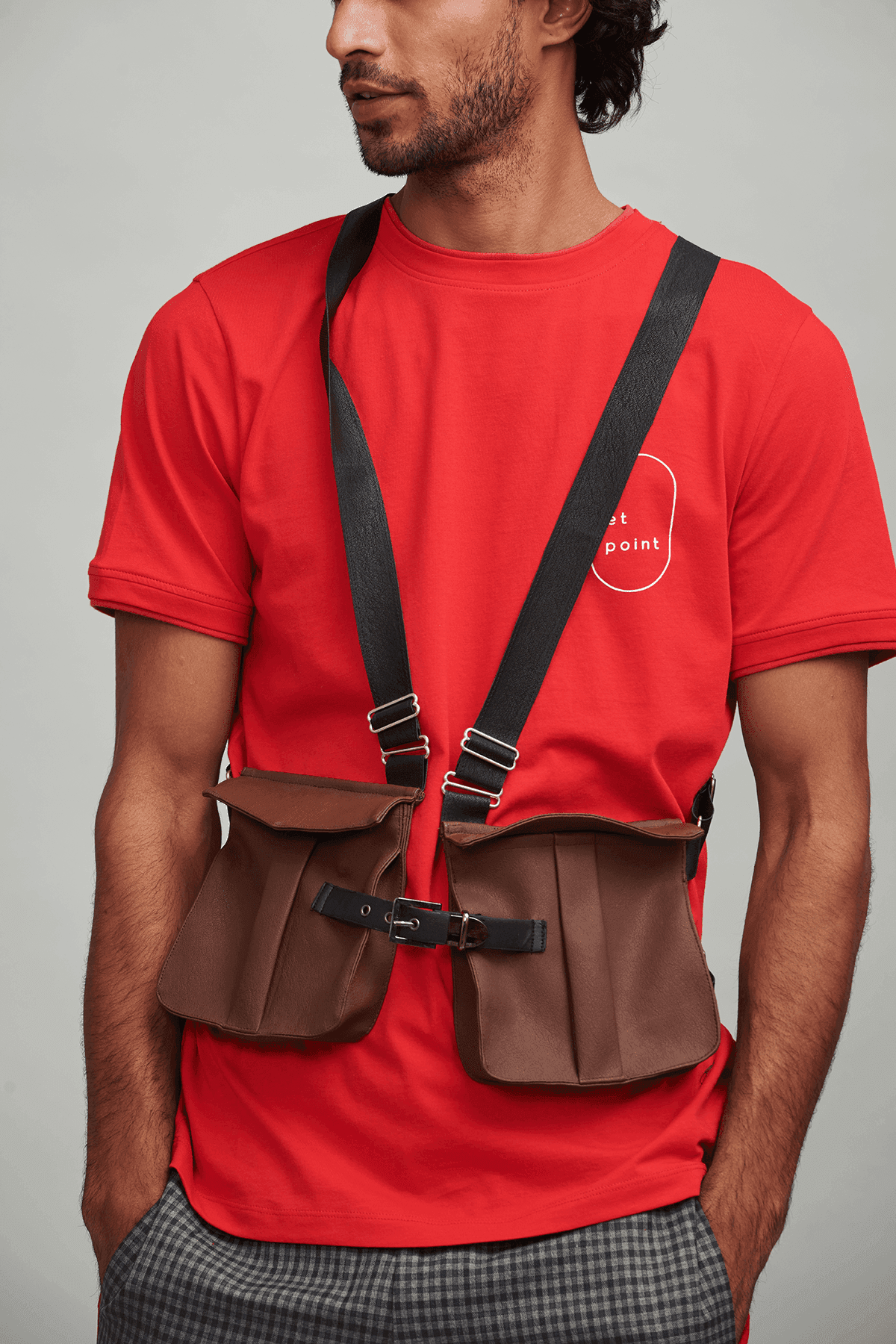 Utility harness made of vegan leather. Ideal for travel, toolkits, or everyday work. 2 large sized pockets in the front, adjustable straps on the shoulder and waist. Buckle front.
